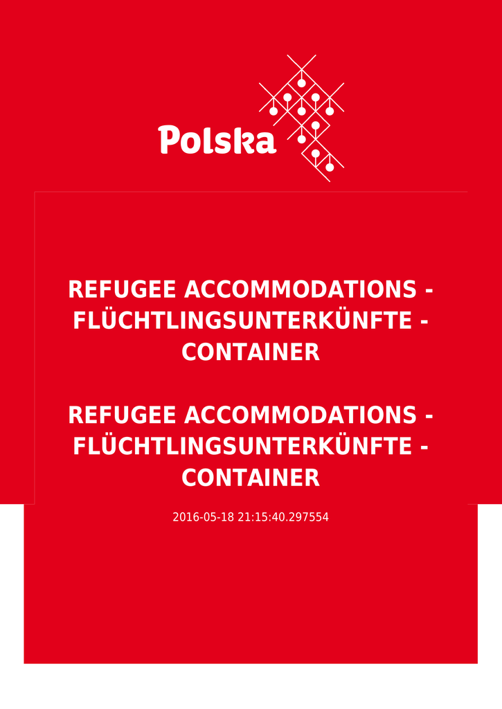 REFUGEE ACCOMMODATIONS FLÜCHTLINGSUNTERKÜNFTE CONTAINER REFUGEE ACCOMMODATIONS FLÜCHTLINGSUNTERKÜNFTE CONTAINER 2016-05-18 21:15:40.297554 2 3 Ta oferta nie stanowi informacji handlowej Adres instytucji/firmy ogłaszającej ofertę EUROCONSULTING BUDOWNICTWO I ARCHITEKTURA SPÓŁKA Z OGRANICZONĄ ODPOWIEDZIALNOŚCIĄ 50-148 WROCŁAW, WITA STWOSZA 16 , Polska Osoba kontaktowa MAŁGORZATA KRYSIAK [email protected] Tel: +48 783 436 948 www.e-euroconsulting.eu Opis przedmiotu zamówienia We are producers of habitable, sanitary and office containers. We are building social housing and a home for refugees. Our containers are made of high quality materials, meet the standards of fire resistance. We may occur in public tenders as your subcontractor. If you are interested please send an email [email protected] Nabywcy z zagranicy ● Niemcy Certyfikaty ● FIRE RESISTANCE 4 CPV ● ● ● ● ● ● ● Konstrukcje i materiały budowlane', 'wyroby pomocnicze dla budownictwa (z wyjątkiem aparatury elektrycznej) Materiały konstrukcyjne Konstrukcje i części konstrukcji Budynki z gotowych elementów Budynki modułowe i przenośne Montaż i wznoszenie gotowych konstrukcji Roboty instalacyjne w budynkach Typ oferty Kooperacja Termin składania ofert 14.11.2016 Ważna od 18.05.2016 Branże Produkcja metalowych wyrobów gotowych Produkcja i przetwórstwo metali Budownictwo i architektura Waluta EUR 5 Nabywcy poza granicami kraju TAK 6
