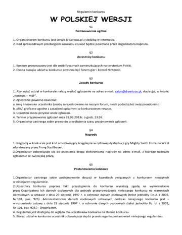 Regulamin konkursu W POLSKIEJ WERSJI §1 Postanowienia ogólne 1. Organizatorem konkursu jest serwis D-Serious.pl z siedzibą w Internecie. 2. Nad sprawiedliwym przebiegiem konkursu czuwać będzie powołana przez Organizatora Kapituła. §2 Uczestnicy konkursu 1. Konkurs przeznaczony jest dla osób fizycznych zamieszkujących na terytorium Polski. 2. Osoba biorąca udział w konkursie powinna być fanem gier i konsol Nintendo. §3 Zasady konkursu 1. Aby wziąć udział w konkursie należy wysłać zgłoszenie na adres e-mail: [email protected], dopisując w tytule: „Konkurs – MSF”. 2. Zgłoszenie powinno zawierać: a. imię i nazwisko uczestnika (osoby zarejestrowane na naszym forum, niech podadzą też swój pseudonim); b. plik/i graficzne zgodne z zasadami opisanymi w konkursowym newsie. 3. Uczestnik może przysłać wiele zgłoszeń. 4. Termin przyjmowania zgłoszeń mija 28.03.2013r. o godz. 23:59. 5. Organizator zastrzega sobie prawo do przedłużenia czasu przyjmowania zgłoszeń. §4 Nagrody 1. Nagrodą w konkursie jest kod umożliwiający ściągnięcie w cyfrowej dystrybucji gry Mighty Swith Force na Wii U ufundowany przez firmę Stadlbauer. 2.Organizator zobowiązuje się do przesłania drogą elektroniczną nagrody na adres e-mail, z którego nadeszło zgłoszenie ze zwycięską pracą. §5 Postanowienia końcowe 1.Organizator zastrzega sobie podejmowanie decyzji w kwestiach związanych z konkursem nieujętych w niniejszym regulaminie. 2.Uczestnicy konkursu poprzez fakt przystąpienia do konkursu wyrażają zgodę na wykorzystanie przez Organizatora ich danych osobowych dla potrzeb przeprowadzenia niniejszego konkursu na warunkach określonych w ustawie z dnia 29 sierpnia 1997 r. o ochronie danych osobowych (tekst jednolity Dz.U. z 2002, Nr 101, poz. 926). Administratorem danych osobowych zebranych podczas niniejszego konkursu jest – w rozumieniu ustawy z dnia 29 sierpnia 1997 r. o ochronie danych osobowych (tekst jednolity Dz. U. z 2002, Nr 101, poz. 926.) - Organizator. 4. Regulamin jest dostępny do wglądu dla uczestników konkursu na stronie konkursu. 5. Biorąc udział w konkursie uczestnik zobowiązuje się do przestrzegania postanowień niniejszego regulaminu.