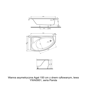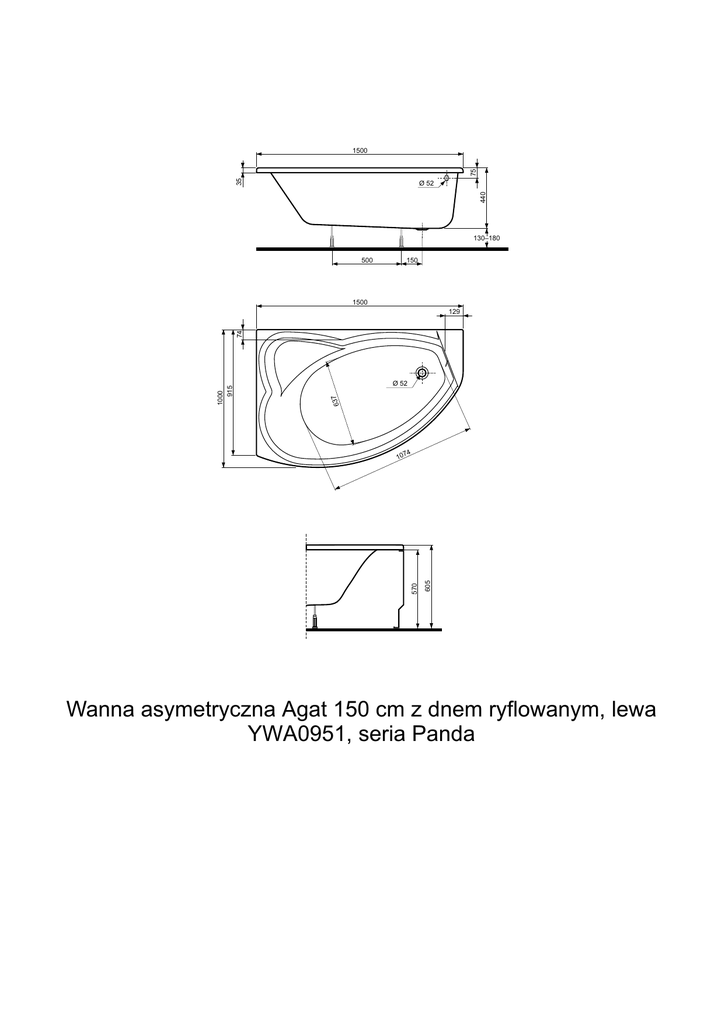 35 75 1500 440 ¨ 52 130–180 500 150 1500 Ø 52 63 7 4 570 10 7 605 1000 915 74 129 Wanna asymetryczna Agat 150 cm z dnem ryflowanym, lewa YWA0951, seria Panda
