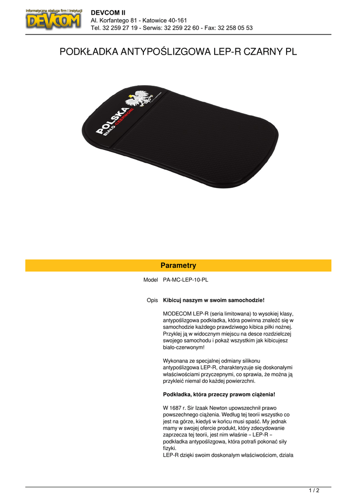 DEVCOM II Al. Korfantego 81 - Katowice 40-161 Tel. 32 259 27 19 - Serwis: 32 259 22 60 - Fax: 32 258 05 53 PODKŁADKA ANTYPOŚLIZGOWA LEP-R CZARNY PL Parametry Model PA-MC-LEP-10-PL Opis Kibicuj naszym w swoim samochodzie! MODECOM LEP-R (seria limitowana) to wysokiej klasy, antypoślizgowa podkładka, która powinna znaleźć się w samochodzie każdego prawdziwego kibica piłki nożnej. Przyklej ją w widocznym miejscu na desce rozdzielczej swojego samochodu i pokaż wszystkim jak kibicujesz biało-czerwonym! Wykonana ze specjalnej odmiany silikonu antypoślizgowa LEP-R, charakteryzuje się doskonałymi właściwościami przyczepnymi, co sprawia, że można ją przykleić niemal do każdej powierzchni. Podkładka, która przeczy prawom ciążenia! W 1687 r. Sir Izaak Newton upowszechnił prawo powszechnego ciążenia. Według tej teorii wszystko co jest na górze, kiedyś w końcu musi spaść. My jednak mamy w swojej ofercie produkt, który zdecydowanie zaprzecza tej teorii, jest nim właśnie – LEP-R – podkładka antypoślizgowa, która potrafi pokonać siły fizyki. LEP-R dzięki swoim doskonałym właściwościom, działa 1/2 DEVCOM II Al. Korfantego 81 - Katowice 40-161 Tel. 32 259 27 19 - Serwis: 32 259 22 60 - Fax: 32 258 05 53 jak magnes, utrzymując na swojej powierzchni wszystkie przyczepione do niego gadżety, takie jak: telefon, okulary, GPS, odtwarzacz mp3, nawet podczas bardzo dynamicznej jazdy samochodem. Doskonała przyczepność bez użycia kleju LEP-R to podkładka, która swoje właściwości zawdzięcza specjalnej odmianie silikonu. Warto podkreślić, że produkt ten nie zawiera kleju ani nie pozostawia na powierzchni żadnych śladów. Dzięki wysokiej jakości użytego do produkcji materiału, podkładka LEP-R zachowuje swoje właściwości przylepne, niezależnie od pory roku: można jej z powodzeniem używać zarówno w niskich, jak i wysokich temperaturach. Podkładki można również wielokrotnie przyklejać i używać przez długi czas, bez obawy o utratę jej właściwości. Łatwa w użyciu i konserwacji Podkładka LEP-R jest produktem bardzo łatwym i przyjaznym w użyciu. Wystarczy umieścić ją na desce rozdzielczej i położyć na niej niezbędny gadżet. Przedmiot do niego przyklejony będzie mocno się trzymał nawet w trakcie wykonywania gwałtownych manewrów podczas jazdy samochodem. Podkładkę łatwo również utrzymać w czystości, w razie zabrudzenia wystarczy tylko przemyć ją letnią wodą i po chwili odzyska ona swoje właściwości. UWAGA! Nie przyklejać w miejscu, gdzie zamontowane są poduszki powietrzne! Materiał Silikon Kolor Czarny Pozostałe parametry - Nie zawiera kleju - Podkładka wielokrotnego użytku - Do takich gadźetów, jak: telefony komórkowe, okulary, klucze, nawigacje, odtwarzacze MP3/4 i inne drobne przedmioty 2/2 Powered by TCPDF (www.tcpdf.org)