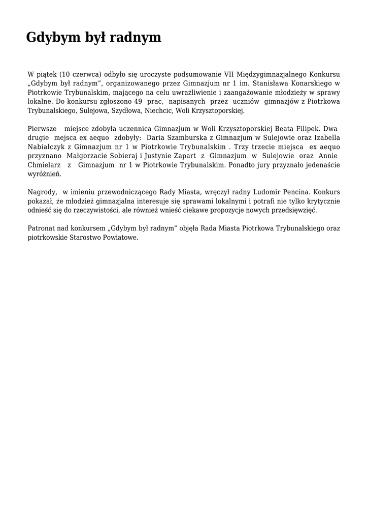 Gdybym był radnym W piątek (10 czerwca) odbyło się uroczyste podsumowanie VII Międzygimnazjalnego Konkursu „Gdybym był radnym”, organizowanego przez Gimnazjum nr 1 im. Stanisława Konarskiego w Piotrkowie Trybunalskim, mającego na celu uwrażliwienie i zaangażowanie młodzieży w sprawy lokalne. Do konkursu zgłoszono 49 prac, napisanych przez uczniów gimnazjów z Piotrkowa Trybunalskiego, Sulejowa, Szydłowa, Niechcic, Woli Krzysztoporskiej. Pierwsze miejsce zdobyła uczennica Gimnazjum w Woli Krzysztoporskiej Beata Filipek. Dwa drugie mejsca ex aequo zdobyły: Daria Szamburska z Gimnazjum w Sulejowie oraz Izabella Nabiałczyk z Gimnazjum nr 1 w Piotrkowie Trybunalskim . Trzy trzecie miejsca ex aequo przyznano Małgorzacie Sobieraj i Justynie Zapart z Gimnazjum w Sulejowie oraz Annie Chmielarz z Gimnazjum nr 1 w Piotrkowie Trybunalskim. Ponadto jury przyznało jedenaście wyróżnień. Nagrody, w imieniu przewodniczącego Rady Miasta, wręczył radny Ludomir Pencina. Konkurs pokazał, że młodzież gimnazjalna interesuje się sprawami lokalnymi i potrafi nie tylko krytycznie odnieść się do rzeczywistości, ale również wnieść ciekawe propozycje nowych przedsięwzięć. Patronat nad konkursem „Gdybym był radnym” objęła Rada Miasta Piotrkowa Trybunalskiego oraz piotrkowskie Starostwo Powiatowe.