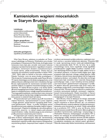Kamienio³om wapieni mioceñskich w Starym Bruœnie Lokalizacja: województwo podkarpackie powiat lubaczowski gmina Horyniec Zdrój miescowoœc Stare Brusno Cieszanów £owcza Region geograficzny: Wy¿yna Lubelsko-Lwowska Roztocze Roztocze Wschodnie Jednostka geologiczna: zapadlisko przedkarpackie Wieœ Stare Brusno, po³o¿ona na po³udnie od Tomaszowa Lubelskiego na Roztoczu Wschodnim przy drodze prowadz¹cej z Cieszanowa do Werchratej, do drugiej wojny œwiatowej znana by³a jako oœrodek twórczoœci ludowej zwi¹zanej z wyrobami kamieniarskimi: nagrobkami, krzy¿ami, pomnikami, kamiennymi detalami architektonicznymi, w ramach s³ynnej „szko³y bruœnieñskiej”. Dzisiaj wieœ ju¿ nieistnieje. Jej mieszkañcy zostali wysiedleni w latach 1944-1947. Nieco dalej na zachód w kierunku miejscowoœci Polanka Tryniecka przy tej samej drodze prowadz¹cej z Werchratej do Cieszanowa powsta³a osada Nowe Brusno. W rejonie nieistniej¹cej wsi do dzisiaj wystêpuj¹ liczne, coraz s³abiej widoczne ods³oniêcia ska³, które mieszkañcy Starego Brusna wykorzystywali do wytwarzania wyrobów kamieniarskich. Ska³y te, to wapienie mioceñskie buduj¹ce t¹ czêœæ Roztocza. W rejonie Brusna na górze o tej samiej nazwie (Brusno) wystêpuj¹ liczne drobne ods³oniêcia, z których najlepsze to wielopoziomowy rozleg³y zespó³ kamienio³omów. Tworz¹ go piêknie po³o¿ony, otoczony lasem stary nieczynny kamienio³om górny i bardzo du¿y rozleg³y kamienio³om dolny, który jeszcze w ostatnich latach by³ czynny. 1 W kamienio³omach tych ods³ania siê profil mioceñskich wapieni Roztocza, reprezentowanych tu przez wapienie i margle glonowe, ponad którymi wystêpuj¹ piaski kwarcowo-glaukonitowe. Wy¿ej w profilu wystêpuje ponad dwudziestometrowej mi¹¿szoœci kompleks wapieni organodetrytycznych. Wapienie te sk³adaj¹ siê z okruchów glonów wapiennych, otwornic i w ró¿nym stopniu pokruszonych muszli œlimaków i ma³¿y; charakteryzuj¹ siê one zmienn¹ w profilu pionowym zawartoœci¹ ziarn kwarcu. W wapieniach tych mo¿emy obserwowaæ dobrze czy2 telne struktury sedymentacyjne, takie jak: warstwowanie skoœne, rynnowe i ripplemarkowe oraz laminacjê poziom¹. W najwy¿szych czêœciach profilu obserwujemy wystêpowanie na przemian grubych, masywnych ³awic wapieni, w których 154 5570 4666 Horyniec 4668 struktury warstwowañ s¹ s³abo widoczne, z pakietami cienkich warstw o wyraŸnej oddzielnoœci p³ytowej. Wszystkie 3 te osady reprezentuj¹ utwory wieku górnobadeñskiego, a wiêc powstawa³y oko³o 10 mln. lat temu. S¹ to osady mioceñskiego morza, które wype³nia³o wtedy zapadlisko przedkarpackie i siêga³o daleko na pó³noc i wschód, na obszar dzisiejszego Roztocza. By³o to ciep³e, p³ytkie morze o normalnym zasoleniu, w którym kwit³o bogate ¿ycie. Jego przejawem by³a obecnoœæ ró¿nego rodzaju glonów, ma³¿y i œlimaków, których liczne skamienia³oœci lub ich fragmenty znajdujemy dzisiaj w tych ska³ach. Do zbiornika morskiego dostarczane by³y niewielkie iloœci materia³u klastycznego pochodz¹cego z l¹du, o czym œwiadcz¹ warstwy piaskowców kwarcowych i glaukonitowych wystêpuj¹ce w profilu. W p³ytkim zbiorniku generowane by³y przez wiatry fale wywo³uj¹ce pr¹dy denne, przemieszczaj¹ce materia³ okruchowy po dnie. Wyrazem tego s¹ widoczne w osadzie liczne struktury warstwowañ skoœnych, rynnowych i ripplemarkowych (zmarszczkowych). Osady mioceñskie w Starym Brusnie stanowi¹ przyk³ad ró¿norodnoœci ska³ wêglanowych wystêpuj¹cych w tej czêœci Roztocza. Stare Brusno, mimo ¿e dzisiaj ju¿ nie istnieje, zaznaczy³o swoj¹ obecnoœæ w historii tego regionu. To w³aœnie na starym cmentarzu w Starym Brusnie, jak i na cmentarzu w Nowym Brusnie, mo¿emy zobaczyæ wyroby kamienne produkowane przez kamieniarzy tej wioski. Osada wykszta³ci³a siê na prze³omie XVI i XVII w. przy wsi Brusno, która póŸniej nazwana zosta³a Starym Brusnem. By³a ona g³ównym oœrodkiem kamieniarstwa u¿ytkowego i artystycznego na Wschodnim Roztoczu, funkcjonuj¹cym od po³owy XVI w. Nazwa wsi nawi¹zuje do staros³owiañskiego s³owa „brus” oznaczaj¹cego ose³kê, kamienie ¿arnowe lub blok piaskowca. Rzemios³em kamieniarskim zajmowali siê, z pokolenia na pokolenie mieszkañcy wsi, których zwano „górnikami”. Materia³u dostarcza³y lokalne kamienio³omy rozmieszczone Stare Brusno wokó³ wsi. Kamieniarze produkowali, dziêki ³atwo urabialnej skale, jak¹ by³y piaszczyste wapienie mioceñskie, krzy¿e nagrobne i przydro¿ne oraz nagrobki. By³y one bardzo popularne ze wzglêdu na stosunkowo nisk¹ cenê i spotykane s¹ na znacznym obszarze Polski. Wyroby kamieniarskie z wapieni mioceñskich pochodz¹ce z oœrodka w Starym Bruœnie spotkaæ mo¿na na wschodzie pod Lwowem na Ukrainie, na po³udniu pod Przemyœlem, a na zachodzie w okolicach Kolbuszowej. Pó³nocny zasiêg ich wystêpowania wyznacza granica zaboru austriackiego. Najstarsze zachowane i odczytane krzy¿e pochodz¹ z pierwszej po³owy XVII w. Z kamieniarskiej rodziny pochodzi³ utalentowany rzeŸbiarz i malarz Grzegorz KuŸniewicz, autor p³askorzeŸby jednego z prezydentów na s³ynnej skale Black Hills w USA. The Miocene limestones quarry in Stare Brusno The large quarry was developed in Brusno village (south from Tomaszów Mazowiecki town), in the slopes of the Brusno Hill. It comprises two parts: an older, scenic upper pit surrounded by forest and younger, huge, lower pit which has just been closed. In both pits the Miocene carbonates appear represented by algal limestones and marls overlain by quartz-glauconitic sands. These are succeeded by 20-meters-thick complex of organodetrital limestones composed of fragments of calcareous algae, foraminifers and shells of gastropods and bivalves at various stages of preservation. The limestone show vertical variability in quartz content. In the limestone beds a variety of distinct sedimentary structures can be observed: oblique, trough