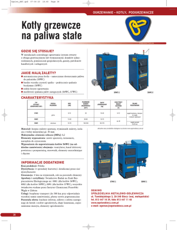 Ogniwo_ABC.qxd 07-06-20 18:40 Page 38 OGRZEWANIE – KOTŁY, PODGRZEWACZE Kotły grzewcze na paliwa stałe P R E Z E N TA C J A GDZIE SIĘ STOSUJE? W instalacjach centralnego ogrzewania (system otwarty o obiegu grawitacyjnym lub wymuszonym) domków jednorodzinnych, pomieszczeń gospodarczych, garaży, pawilonów handlowych i usługowych JAKIE MAJĄ ZALETY? automatyczna praca kotła – samoczynne dostarczanie paliwa do paleniska (S8WC) bardzo wysoka czystość spalin – praktycznie spalanie bezdymne (S8WC) niskie koszty ogrzewania możliwość spalania paliw zastępczych (S6WC, S7WC) S6WC-1 S6WC-2 CHARAKTERYSTYKA TYP (STOJĄCY JEDNOFUNKCYJNY) RODZAJ PALENISKA S7WC MOC [kW] POJEMNOŚĆ KOMORY ZAŁADOWCZEJ [dm3] ZASYP JEDNORAZOWY [kg] CZAS PRACY MIĘDZY ZASYPAMI [h] 8-10 30 10-40 6-12 13-50 30-90 10-70 10-70 150-250 90-170 górne S6WC do 48 S8WC retortowe Materiał: korpus stalowy spawany, wymiennik stalowy, izolacja z wełny mineralnej gr. 30 mm Maksymalne ciśnienie robocze [MPa]: 0,2 Elementy wyposażenia: zawór spustowy, termometr, narzędzia do czyszczenia Wyposażenie do napowietrzania kotłów S6WC (na oddzielne zamówienie) obejmuje: wentylator, kanał dolotowy powietrza z przepustnicą, sterownik, elementy uszczelniające i złączne PALIW0 PODSTAWOWE węgiel kamienny, mieszanka węgla z koksem opałowym węgiel groszek 5-20 mm aktualne ceny produktów dostępne na stronie www.ogniwobiecz.com.pl INFORMACJE DODATKOWE Kraj produkcji: Polska Dystrybucja: w sprzedaży hurtowej i detalicznej przez sieć dystrybutorów Gwarancja: 4 lata na wymiennik, rok na pozostałe elementy Aprobaty i certyfikaty: Świadectwo Badań na Znak Bezpieczeństwa Ekologicznego nr: 0081 (dla kotłów S6WC), 0082 (dla kotłów S8WC), 0091 (dla kotłów S7WC), wszystkie świadectwa wydane przez Instytut Chemicznej Przeróbki Węgla w Zabrzu Usługi: bezpłatny transport (do 300 km przy odpowiednio wysokiej sumie zamówienia), płatny serwis pogwarancyjny Pozostała oferta: kuchnie żeliwne, odlewy z żeliwa szarego: nogi do ławek i stołów ogrodowych, słupy latarniane, części zamienne maszyn, elementy ogrodzeniowe 38 S7WC-1 S8WC-1 OGNIWO SPÓŁDZIELNIA METALOWO-ODLEWNICZA ul. Tumidajskiego 3, 38-340 Biecz (woj. małopolskie) tel. 013 447 10 39, faks 013 447 11 48 www.ogniwobiecz.com.pl e-mail: [email protected]