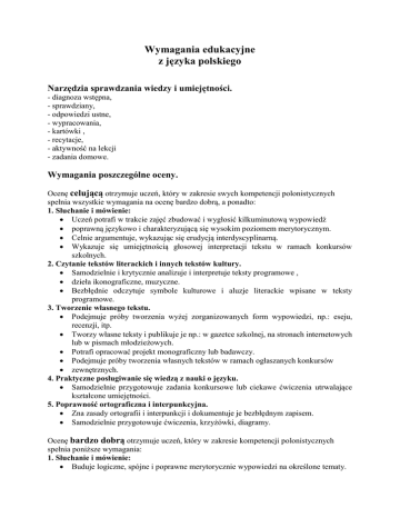 Wymagania edukacyjne z języka polskiego Narzędzia sprawdzania wiedzy i umiejętności. - diagnoza wstępna, - sprawdziany, - odpowiedzi ustne, - wypracowania, - kartówki , - recytacje, - aktywność na lekcji - zadania domowe. Wymagania poszczególne oceny. Ocenę celującą otrzymuje uczeń, który w zakresie swych kompetencji polonistycznych spełnia wszystkie wymagania na ocenę bardzo dobrą, a ponadto: 1. Słuchanie i mówienie: Uczeń potrafi w trakcie zajęć zbudować i wygłosić kilkuminutową wypowiedź poprawną językowo i charakteryzującą się wysokim poziomem merytorycznym. Celnie argumentuje, wykazując się erudycją interdyscyplinarną. Wykazuje się umiejętnością głosowej interpretacji tekstu w ramach konkursów szkolnych. 2. Czytanie tekstów literackich i innych tekstów kultury. Samodzielnie i krytycznie analizuje i interpretuje teksty programowe , dzieła ikonograficzne, muzyczne. Bezbłędnie odczytuje symbole kulturowe i aluzje literackie wpisane w teksty programowe. 3. Tworzenie własnego tekstu. Podejmuje próby tworzenia wyżej zorganizowanych form wypowiedzi, np.: eseju, recenzji, itp. Tworzy własne teksty i publikuje je np.: w gazetce szkolnej, na stronach internetowych lub w pismach młodzieżowych. Potrafi opracować projekt monograficzny lub badawczy. Podejmuje próby tworzenia własnych tekstów w ramach ogłaszanych konkursów zewnętrznych. 4. Praktyczne posługiwanie się wiedzą z nauki o języku. Samodzielnie przygotowuje zadania konkursowe lub ciekawe ćwiczenia utrwalające kształcone umiejętności. 5. Poprawność ortograficzna i interpunkcyjna. Zna zasady ortografii i interpunkcji i dokumentuje je bezbłędnym zapisem. Samodzielnie przygotowuje ćwiczenia, krzyżówki, diagramy. Ocenę bardzo dobrą otrzymuje uczeń, który w zakresie kompetencji polonistycznych spełnia poniższe wymagania: 1. Słuchanie i mówienie: Buduje logiczne, spójne i poprawne merytorycznie wypowiedzi na określone tematy. Dyskutuje, polemizuje, przytacza trafne argumenty na uzasadnienie własnego stanowiska Dostrzega problem, zgłasza propozycje rozwiązania, wyciąga wnioski. Wykazuje się bardzo dobrą znajomością wszystkich lektur programowych, przewidzianych do omówienia w kl. III Wygłasza z pamięci fragmenty prozy lub poezji, dokonując głosowej interpretacji poprzez odpowiednią barwę głosu i intonację. Samodzielnie i krytycznie analizuje i interpretuje teksty, posługując się terminologią z zakresu teorii literatury. Sprawnie posługuje się wymaganymi programowo formami wypowiedzi: opis, opowiadanie, charakterystyka, streszczenie, sprawozdanie, głos w dyskusji. Wygłasza przemówienia, stosując figury retoryczne. Stosownie do sytuacji buduje wypowiedzenia mające charakter: perswazji, parafrazy, komentarza. 2. Czytanie tekstów literackich i innych tekstów kultury. Płynnie i bezbłędnie czyta, interpretując tekst poprzez właściwą intonację. Zna środki wyrazu typowe dla różnych dziedzin sztuki i umie odczytać ich funkcje. Potrafi krytycznie odczytać treść przekazów medialnych, w tym reklam. Sprawnie odczytuje informacje zawarte w aktach normatywnych, mapach, tabelach, wykresach. 3. Tworzenie własnego tekstu. Sprawnie redaguje pisemne formy wypowiedzi: notatka, opis, opis przeżyć wewnętrznych, charakterystyka, opowiadanie, opowiadanie z dialogiem, list, dziennik, pamiętnik, streszczenie, rozprawka, wywiad, dedykacja, zaproszenie, motto. Wprowadza cytaty i poprawnie je zapisuje. Tworzy wzorcowe teksty użytkowe: ogłoszenia, instrukcje, zawiadomienia, regulaminy, CV, list motywacyjny, życiorys. Tworzy przypisy i bibliografię. Dokonuje oryginalnego przekładu intersemiotycznego dzieła literackiego, plastycznego i malarskiego. Sprawnie dokonuje różnorodnych operacji na tekście: streszcza, rozwija, dokonuje adaptacji, stylizacji, parafrazy. 4. Praktyczne posługiwanie się wiedzą z nauki o języku. Uczeń, tworząc teksty mówione i pisane, sprawnie i funkcjonalnie wykorzystuje wiedzę z zakresu: o fleksji (części mowy odmienne i nieodmienne, osobliwości w odmianie, funkcje części mowy), o składni (zdania, równoważniki, zdania pojedyncze, złożone, wielokrotnie złożone), o słowotwórstwa (budowa słowotwórcza wyrazu, złożenia, zestawienia, zrosty, wulgaryzmy, neologizmy, zapożyczenia), o frazeologii (rozumie znaczenie związków frazeologicznych, stosuje je w różnych formach wypowiedzi), o fonetyki. 5. Poprawność ortograficzna i interpunkcyjna. Uczeń zna zasady ortograficzne i interpunkcyjne i potwierdza to bezbłędnym zapisem. Ocenę dobrą otrzymuje uczeń, który w zakresie kompetencji polonistycznych spełnia poniższe wymagania: 1. Słuchanie i mówienie. Słucha uważnie wypowiedzi i potrafi dokonać selekcji przekazywanych informacji. Tworzy poprawne składniowo i merytorycznie wypowiedzi wielozdaniowe. Bierze udział w dyskusji, popierając własne zdanie trafnie dobranymi argumentami. Poprawnie posługuje się wymaganymi programowo formami wypowiedzi. Dobrze zna treści lektur, przewidzianych do omówienia w kl. III, wykorzystuje konteksty niezbędne do ich interpretacji. Bezbłędnie wygłasza z pamięci wiersze i fragmenty prozy. 2. Czytanie tekstów literackich i innych tekstów kultury. Uczeń czyta płynnie i bezbłędnie, ze zrozumieniem. Zna środki wyrazu literatury, teatru, filmu, mediów i umie odczytać ich funkcje. Czyta teksty kultury na poziomie dosłownym, symbolicznym i przenośnym. Dostrzega konteksty niezbędne do interpretacji tekstów kultury. Dostrzega wartości wpisane w teksty kultury. 3. Tworzenie własnego tekstu. Poprawnie redaguje pisemne formy wypowiedzi: opis, opowiadanie, streszczenie, rozprawka, sprawozdanie, charakterystyka, pamiętnik, wywiad, dedykacja. Tworzy teksty użytkowe: regulamin, list motywacyjny, list otwarty. Umiejętnie dokonuje operacji przekształcenia tekstu: streszcza, rozwija, dokonuje adaptacji i stylizacji. Dokonuje przekładu int