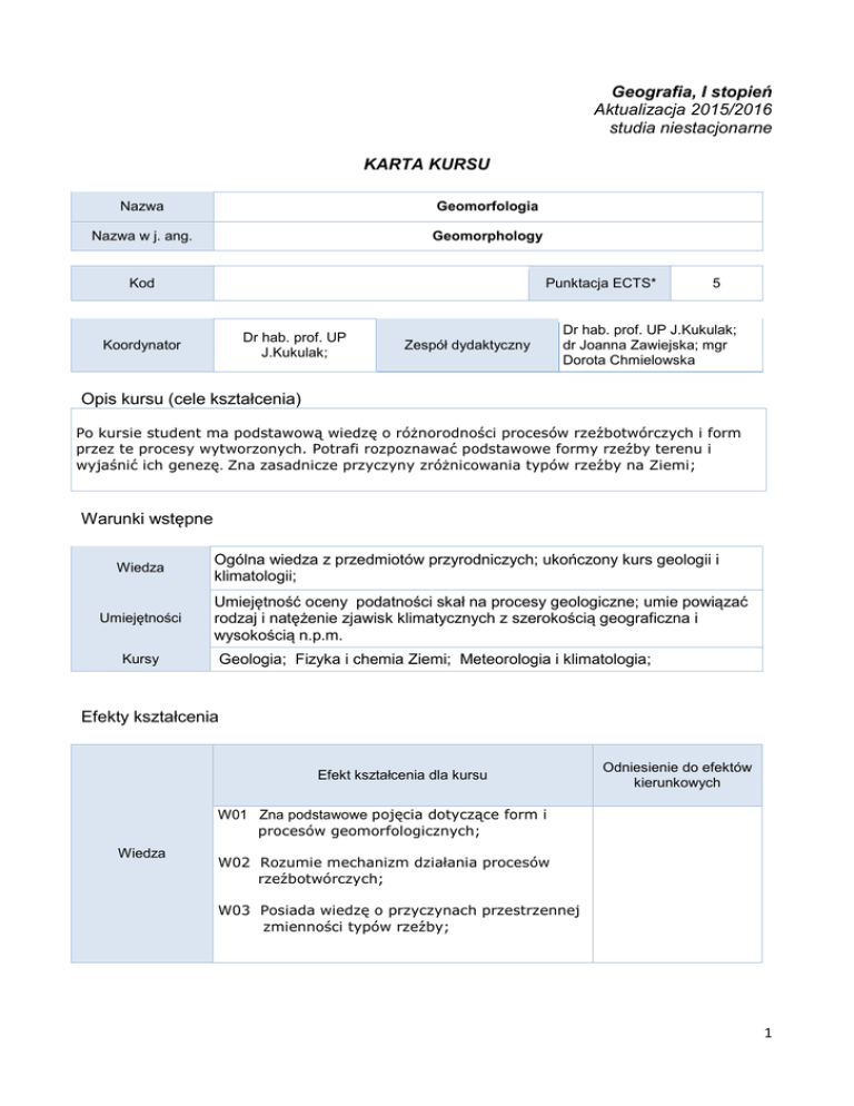 Geografia, I stopień Aktualizacja 2015/2016 studia niestacjonarne KARTA KURSU Nazwa Geomorfologia Nazwa w j. ang. Geomorphology Kod Punktacja ECTS* Dr hab. prof. UP J.Kukulak; Koordynator Zespół dydaktyczny 5 Dr hab. prof. UP J.Kukulak; dr Joanna Zawiejska; mgr Dorota Chmielowska Opis kursu (cele kształcenia) Po kursie student ma podstawową wiedzę o różnorodności procesów rzeźbotwórczych i form przez te procesy wytworzonych. Potrafi rozpoznawać podstawowe formy rzeźby terenu i wyjaśnić ich genezę. Zna zasadnicze przyczyny zróżnicowania typów rzeźby na Ziemi; Warunki wstępne Wiedza Umiejętności Ogólna wiedza z przedmiotów przyrodniczych; ukończony kurs geologii i klimatologii; Umiejętność oceny podatności skał na procesy geologiczne; umie powiązać rodzaj i natężenie zjawisk klimatycznych z szerokością geograficzna i wysokością n.p.m. Geologia; Fizyka i chemia Ziemi; Meteorologia i klimatologia; Kursy Efekty kształcenia Efekt kształcenia dla kursu Odniesienie do efektów kierunkowych W01 Zna podstawowe pojęcia dotyczące form i procesów geomorfologicznych; Wiedza W02 Rozumie mechanizm działania procesów rzeźbotwórczych; W03 Posiada wiedzę o przyczynach przestrzennej zmienności typów rzeźby; 1 Odniesienie do efektów kierunkowych Efekt kształcenia dla kursu U01 Wyjaśnia udział różnych czynników endo- i egzogenicznych w kształtowaniu rzeźby terenu; Umiejętności U02 Interpretuje obraz rzeźby terenu z mapy poziomicowej i zdjęć satelitarnych; U03 Potrafi powiązać rodzaj i intensywność procesów rzeźbotwórczych z jakością tła przyrodniczego; Odniesienie do efektów kierunkowych Efekt kształcenia dla kursu Kompetencje społeczne K01 Ma świadomość lokalnej współodpowiedzialności za następstwa procesów rzeźbotwórczych; K02 Docenia konieczność równej współpracy przy wykonywaniu zadań zespołowych; Organizacja Forma zajęć Ćwiczenia w grupach Wykład (W) A Liczba godzin 20 K L S P E 20 Opis metod prowadzenia zajęć Zajęcia prowadzone są w formie wykładów i ćwiczeń, student wykonuje zadania zespołowe i musi wykonać projekt indywidualny 2 x x W01 W02 W03 U01 U02 U03 K01 K02 Kryteria oceny Uwagi x x x x x x x x x x x x x x x x x x x Inne Egzamin pisemny Egzamin ustny Praca pisemna (esej) Referat Udział w dyskusji Projekt grupowy Projekt indywidualny Praca laboratoryjna Zajęcia terenowe Ćwiczenia w szkole Gry dydaktyczne E – learning Formy sprawdzania efektów kształcenia x x x x x x x Zaliczenie zespołowych prac ćwiczeniowych i projektu indywidualnego; Ocena z egzaminu Zaliczenie z ćwiczeń uzyskuje student, który aktywnie uczestniczy w zajęciach, poprawnie wykona zadany projekt i uzyska 60% punktów z testu końcowego. Treści merytoryczne (wykaz tematów) Wykłady: 1. Miejsce geomorfologii w geografii; metody badań geomorfologicznych; 2. Udział budowy geologicznej w rzeźbie terenu; 3. Znaczenie procesów wietrzeniowych dla rozwoju procesów rzeźbotwórczych; 4. Procesy masowe (grawitacyjne); 5. Procesy fluwialne (erozyjne i akumulacyjne); 6. Doliny rzeczne; 7. Przełomy, stoki, grzbiety; 8. Procesy i formy glacjalne; 9. Procesy i formy krasowe; 10. Procesy i formy eoliczne; 11. Rzeźba w różnych strefach klimatycznych; 12. Antropogeniczne modyfikacje rzeźby; 13. Procesy rzeźbotwórcze a działalność człowieka; Ćwiczenia: 1. Mapa geomorfologiczna jako obraz rzeźby terenu 2. Interpretacja typów i genezy rzeźby na podstawie materiałów kartograficznych i zdjęć satelitarnych. 3. Typy i produkty procesów wietrzeniowych. 4. Uwarunkowania i przebieg procesów denudacyjnych w strefie umiarkowanej. 5. Uwarunkowania i przebieg procesów fluwialnych w strefie umiarkowanej. 3 6. Uwarunkowania rozwoju i formy rzeźby glacjalnej w obszarach górskich i w środowisku peryglacjalnym. 7. Rzeźba obszarów suchych. Wykaz literatury podstawowej 1. Klimaszewski M., 1995. Geomorfologia. PWN, Warszawa; 2. Allen P.A., 2000. Procesy kształtujące powierzchnię Ziemi. PWN, Warszawa; 3. Migoń P., 2006. Geomorfologia. PWN, Warszawa; 4. Bloom A.L. 1980. Powierzchnia Ziemi. PWN Warszawa; Wybór artykułów tematycznych w jęz. polskim i angielskim Wykaz literatury uzupełniającej 1. Starkel L., Geografia Polski. Środowisko przyrodnicze. PWN Warszawa 2. Klimaszewski M. (red.).2000. Geomorfologia Polski, t, II, PWN, Warszawa; 3. Pulina M., 1999. Kras. Formy i procesy. Uniw. Śląski, Katowice; 4. Jania J., 1993. Glacjologia. PWN, Warszawa; 5. Encyklopedia Geograficzna Świata, t. IX, Ziemia, Opres Kraków 1997, s. 52-92. 6. Klimaszewski M., 1978, Geomorfologia, PWN Warszawa, 1098 s. 7. Klimaszewski M., 1995, Geomorfologia, PWN Warszawa, 281 s. 8. Knapp B. J., 1986, Elementy geograficzne hydrologii, PWN Warszawa, 179 s. (r. 2, 3, 4) Bilans godzinowy zgodny z CNPS (Całkowity Nakład Pracy Studenta) Ilość godzin w kontakcie z prowadzącymi Ilość godzin pracy studenta bez kontaktu z prowadzącymi Wykład 20 Konwersatorium (ćwiczenia, laboratorium itd.) 20 Pozostałe godziny kontaktu studenta z prowadzącym 10 Lektura w ramach przygotowania do zajęć 20 Przygotowanie krótkiej pracy pisemnej lub referatu po zapoznaniu się z niezbędną literaturą przedmiotu 5 Przygotowanie projektu lub prezentacji na podany temat (praca indywidualna w grupie) 10 Przygotowanie do egzaminu 20 Ogółem bilans czasu pracy / liczba godzin pracy studenta w ramach zajęć o charakterze praktycznym, w tym zajęć laboratoryjnych i projektowych Ilość punktów ECTS w zależności od przyjętego przelicznika / liczba punktów, którą student musi uzyskać w ramach zajęć o charakterze praktycznym, w tym zajęć laboratoryjnych i projektowych 115/45 5/2,5 4