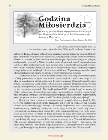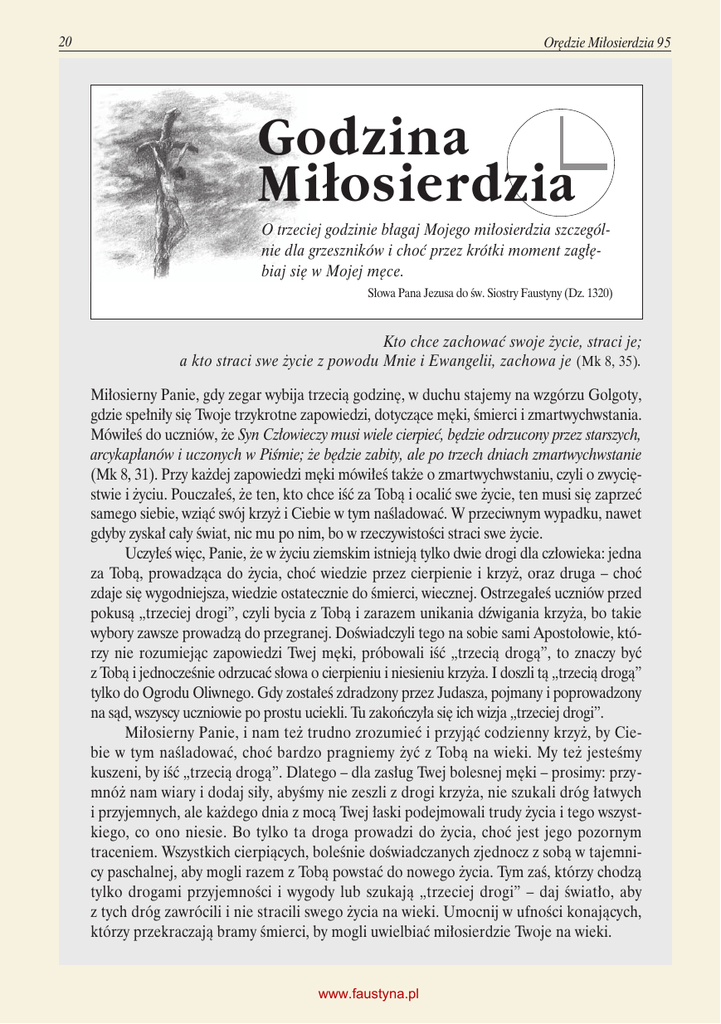 20 Orędzie Miłosierdzia 95 Godzina Miłosierdzia O trzeciej godzinie błagaj Mojego miłosierdzia szczególnie dla grzeszników i choć przez krótki moment zagłębiaj się w Mojej męce. Słowa Pana Jezusa do św. Siostry Faustyny (Dz. 1320) Kto chce zachować swoje życie, straci je; a kto straci swe życie z powodu Mnie i Ewangelii, zachowa je (Mk 8, 35). Miłosierny Panie, gdy zegar wybija trzecią godzinę, w duchu stajemy na wzgórzu Golgoty, gdzie spełniły się Twoje trzykrotne zapowiedzi, dotyczące męki, śmierci i zmartwychwstania. Mówiłeś do uczniów, że Syn Człowieczy musi wiele cierpieć, będzie odrzucony przez starszych, arcykapłanów i uczonych w Piśmie; że będzie zabity, ale po trzech dniach zmartwychwstanie (Mk 8, 31). Przy każdej zapowiedzi męki mówiłeś także o zmartwychwstaniu, czyli o zwycięstwie i życiu. Pouczałeś, że ten, kto chce iść za Tobą i ocalić swe życie, ten musi się zaprzeć samego siebie, wziąć swój krzyż i Ciebie w tym naśladować. W przeciwnym wypadku, nawet gdyby zyskał cały świat, nic mu po nim, bo w rzeczywistości straci swe życie. Uczyłeś więc, Panie, że w życiu ziemskim istnieją tylko dwie drogi dla człowieka: jedna za Tobą, prowadząca do życia, choć wiedzie przez cierpienie i krzyż, oraz druga – choć zdaje się wygodniejsza, wiedzie ostatecznie do śmierci, wiecznej. Ostrzegałeś uczniów przed pokusą „trzeciej drogi”, czyli bycia z Tobą i zarazem unikania dźwigania krzyża, bo takie wybory zawsze prowadzą do przegranej. Doświadczyli tego na sobie sami Apostołowie, którzy nie rozumiejąc zapowiedzi Twej męki, próbowali iść „trzecią drogą”, to znaczy być z Tobą i jednocześnie odrzucać słowa o cierpieniu i niesieniu krzyża. I doszli tą „trzecią drogą” tylko do Ogrodu Oliwnego. Gdy zostałeś zdradzony przez Judasza, pojmany i poprowadzony na sąd, wszyscy uczniowie po prostu uciekli. Tu zakończyła się ich wizja „trzeciej drogi”. Miłosierny Panie, i nam też trudno zrozumieć i przyjąć codzienny krzyż, by Ciebie w tym naśladować, choć bardzo pragniemy żyć z Tobą na wieki. My też jesteśmy kuszeni, by iść „trzecią drogą”. Dlatego – dla zasług Twej bolesnej męki – prosimy: przymnóż nam wiary i dodaj siły, abyśmy nie zeszli z drogi krzyża, nie szukali dróg łatwych i przyjemnych, ale każdego dnia z mocą Twej łaski podejmowali trudy życia i tego wszystkiego, co ono niesie. Bo tylko ta droga prowadzi do życia, choć jest jego pozornym traceniem. Wszystkich cierpiących, boleśnie doświadczanych zjednocz z sobą w tajemnicy paschalnej, aby mogli razem z Tobą powstać do nowego życia. Tym zaś, którzy chodzą tylko drogami przyjemności i wygody lub szukają „trzeciej drogi” – daj światło, aby z tych dróg zawrócili i nie stracili swego życia na wieki. Umocnij w ufności konających, którzy przekraczają bramy śmierci, by mogli uwielbiać miłosierdzie Twoje na wieki. www.faustyna.pl