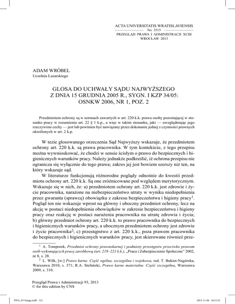 ACTA UNIVERSITATIS WRATISLAVIENSIS ———————— No 3515 ———————— PRZEGLĄD PRAWA I ADMINISTRACJI XCIII WROCŁAW 2013 ADAM WRÓBEL Uczelnia Łazarskiego GLOSA DO UCHWAŁY SĄDU NAJWYŻSZEGO Z DNIA 15 GRUDNIA 2005 R., SYGN. I KZP 34/05: OSNKW 2006, NR 1, POZ. 2 Przedmiotem ochrony są w normach zawartych w art. 220 k.k. prawa osoby pozostającej w stosunku pracy w rozumieniu art. 22 § 1 k.p., a więc w takim stosunku, jaki — uwzględniając jego rzeczywiste cechy — jest lub powinien być nawiązany przez dokonanie jednej z czynności prawnych określonych w art. 2 k.p. W tezie glosowanego orzeczenia Sąd Najwyższy wskazuje, że przedmiotem ochrony art. 220 k.k. są prawa pracownika. W tym kontekście, z tego przepisu można wywnioskować, że chodzi w sensie ścisłym o prawo do bezpiecznych i higienicznych warunków pracy. Należy jednakże podkreślić, iż ochrona przepisu nie ogranicza się wyłącznie do tego prawa; zakres jej jest bowiem szerszy niż ten, na który wskazuje sąd. W literaturze funkcjonują różnorodne poglądy odnośnie do kwestii przedmiotu ochrony art. 220 k.k. Są one zróżnicowane pod względem merytorycznym. Wskazuje się w nich, że: a) przedmiotem ochrony art. 220 k.k. jest zdrowie i życie pracownika, narażone na niebezpieczeństwo utraty w wyniku niedopełnienia przez gwaranta (sprawcę) obowiązku z zakresu bezpieczeństwa i higieny pracy1. Pogląd ten nie wskazuje wprost na główny i uboczny przedmiot ochrony, lecz na akcję w postaci niedopełnienia obowiązków w zakresie bezpieczeństwa i higieny pracy oraz reakcję w postaci narażenia pracownika na utratę zdrowia i życia; b) główny przedmiot ochrony art. 220 k.k. to prawo pracownika do bezpiecznych i higienicznych warunków pracy, a ubocznym przedmiotem ochrony jest zdrowie i życie pracownika2; c) przestępstwo z art. 220 k.k., poza prawem pracownika do bezpiecznych i higienicznych warunków pracy, jest skierowane również prze1 A. Tomporek, Przedmiot ochrony prawnokarnej i podmioty przestępstw przeciwko prawom osób wykonujących pracę zarobkową (art. 219–221 k.k.), „Praca i Zabezpieczenie Społeczne” 2002, nr 8, s. 28. 2 L. Wilk, [w:] Prawo karne. Część ogólna, szczególna i wojskowa, red. T. Bukiet-Nagórska, Warszawa 2010, s. 371; R.A. Stefański, Prawo karne materialne. Część szczególna, Warszawa 2009, s. 310. Przegląd Prawa i Administracji 93, 2013 © for this edition by CNS PPiA_93-księga.indb 121 2013-11-06 10:11:52 122 ADAM WRÓBEL ciwko życiu lub zdrowiu pracownika3 — pogląd ten uwidocznia w sposób niebezpośredni przedmiot ochrony, określając raczej zagrożone dobro, które może doznać uszczerbku w wyniku zrealizowania dyspozycji art. 220 k.k., niemniej można wysunąć tezę, że w tym wypadku dobro zagrożone jest tożsame z dobrem chronionym; d) przedmiotem ochrony art. 220 k.k. jest prawo pracownika do bezpiecznych i higienicznych warunków pracy, którego celem jest ochrona zdrowia i życia pracownika4 — zgodnie z takim rozumieniem w istocie dobrem, które chroni ten przepis, jest życie i zdrowie pracownika, mogące doznać uszczerbku wskutek niezapewnienia bezpiecznych i higienicznych warunków pracy; e) przedmiotem ochrony art. 220 k.k. jest prawo pracownika do bezpiecznych i higienicznych warunków pracy5. Zgodnie z przytoczonymi poglądami, mającymi odniesienie do przedmiotu ochrony art. 220 k.k., w piśmiennictwie wskazuje się słusznie, że ważkie znaczenie w zakresie problematyki przedmiotu ochrony ma kwestia ochrony życia i zdrowia pracownika. Pozostaje ona celem, do którego realizacji powstał przepis art. 220 k.k. W judykaturze wskazuje się podobnie, że celem prawa, które chroni tenże przepis, jest ochrona zdrowia i życia każdego pracownika w procesie pracy6. Zgodnie zatem z wykładnią celowościową dobrem głównie pierwotnie chronionym jest zdrowie i życie pracownika, mogące doznać uszczerbku w wyniku niezapewnienia przez gwaranta bezpiecznych i higienicznych warunków pracy7. Nadto przepis art. 220 k.k. chroni jako indywidualny przedmiot ochrony zarówno bezpieczne i higieniczne warunki pracy, jak i prawo pracownika do bezpiecznych i odpowiadających wymaganiom higieny warunków pracy. Prawo to jest zarazem rodzajowym przedmiotem ochrony — jako że jest częścią praw osób wykonujących prace zarobkowe — na co wskazuje umiejscowienie przepisu w rozdziale XXVIII k.k. („Przestępstwa przeciwko prawom osób wykonujących pracę zarobkową”). W systemach prawa pracy zawarte zostały działy i instytucje prawne, których pierwszorzędnym celem jest ochrona pewnych dóbr, wartości przynależnych pra3 W. Wróbel, [w:] Kodeks karny. Część szczególna. Komentarz do art. 117–277, t. 2, red. A. Zoll, Kraków 2008, s. 880. 4 W. Radecki, [w:] M. Flemming et al., Kodeks karny. Część szczególna, t. 1, Warszawa 2010, s. 1393; Z. Siwik, [w:] Kodeks karny. Komentarz, red. M. Filar, Warszawa 2010, s. 1036. 5 J. Piórkowska-Flieger, [w:] Kodeks karny. Komentarz, red. T. Bojarski, Warszawa 2011, s. 514; M. Bojarski, [w:] Prawo karne materialne. Część ogólna i szczególna, red. idem, Warszawa 2010, s. 533. 6 Zob. wyrok SN z 22 sierpnia 1996 r., IV KKN 60/96, „Prokuratura i Prawo” 1997, nr 3, poz. 6, dodatek. 7 Por. W. Radecki, Przestępstwa przeciwko prawom osób wykonujących pracę zarobkową. Rozdział XXVIII Kodeksu karnego. Komentarz, Warszawa 2001, s. 62; oraz S. Lelental, M. Seweryński, Karno-prawna ochrona praw pracownika, „Państwo i Prawo” 1971, s. 328. Przegląd Prawa i Administracji 93, 2013 © for this edition by CNS PPiA_93-księga.indb 122 2013-11-06 10:11:52 GLOSA DO UCHWAŁY SĄDU NAJWYŻSZEGO Z DNIA 15 GRUDNIA 2005 R., SYGN. I KZP 34/05 123 cownikowi czy też przynależnych pracy, którą tenże pracownik świadczy8. Jedną z nich jest właśnie prawo pracownika do bezpiecznych i higienicznych warunków pracy, którego ważkie znaczenie słusznie akcentuj