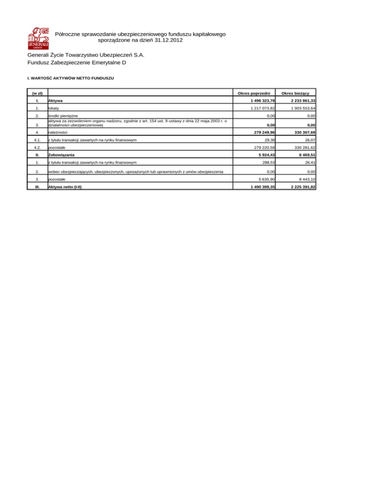 Półroczne sprawozdanie ubezpieczeniowego funduszu kapitałowego sporządzone na dzień 31.12.2012 Generali Życie Towarzystwo Ubezpieczeń S.A. Fundusz Zabezpieczenie Emerytalne D I. WARTOŚĆ AKTYWÓW NETTO FUNDUSZU (w zł) Okres poprzedni Okres bieżący I. Aktywa 1 496 323,78 2 233 861,33 1. lokaty 1 217 073,82 1 903 553,64 2. 0,00 0,00 3. środki pieniężne aktywa za zezwoleniem organu nadzoru, zgodnie z art. 154 ust. 9 ustawy z dnia 22 maja 2003 r. o działalności ubezpieczeniowej 4. należności 4.1. z tytułu transakcji zawartych na rynku finansowym 4.2. pozostałe II. Zobowiązania 1. z tytułu transakcji zawartych na rynku finansowym 2. wobec ubezpieczających, ubezpieczonych, uposażonych lub uprawnionych z umów ubezpieczenia 3. pozostałe III. Aktywa netto (I-II) 0,00 0,00 279 249,96 330 307,69 29,38 26,07 279 220,58 330 281,62 5 924,43 8 469,51 288,53 26,41 0,00 0,00 5 635,90 8 443,10 1 490 399,35 2 225 391,82 Półroczne sprawozdanie ubezpieczeniowego funduszu kapitałowego sporządzone na dzień 31.12.2012 Generali Życie Towarzystwo Ubezpieczeń S.A. Fundusz Zabezpieczenie Emerytalne D II. ZMIANY AKTYWÓW NETTO FUNDUSZU (w zł) Okres poprzedni Okres bieżący A. Aktywa netto funduszu na początek okresu sprawozdawczego 852 197,62 1 490 399,35 B. Stan netto z działalności operacyjnej (I-II) 686 126,69 493 203,04 I. Zwiększenia funduszu 716 694,71 546 131,31 1. tytułem składek zwiększających wartość funduszu 716 694,71 546 131,31 2. pozostałe przychody 0,00 0,00 3. pozostałe zwiększenia II. Zmniejszenia funduszu 1. 2. 0,00 0,00 30 568,02 52 928,27 tytułem wykupu 0,00 730,22 tytułem wypłat pozostałych świadczeń ubezpieczeniowych 0,00 0,00 3. tytułem opłat za ryzyko ubezpieczeniowe oraz innych opłat potrącanych z funduszu 0,00 0,00 4. tytułem zwrotu składek ubezpieczeniowych 5. tytułem opłat za zarządzanie funduszem oraz innych opłat tytułem administrowania funduszem 6. pozostałe koszty 7. pozostałe zmniejszenia C. Wynik netto z działalności inwestycyjnej D. Aktywa netto funduszu na koniec okresu sprawozdawczego 0,00 0,00 20 218,75 30 443,49 0,00 0,00 10 349,27 21 754,56 -47 924,96 241 789,43 1 490 399,35 2 225 391,82 Półroczne sprawozdanie ubezpieczeniowego funduszu kapitałowego sporządzone na dzień 31.12.2012 Generali Życie Towarzystwo Ubezpieczeń S.A. Fundusz Zabezpieczenie Emerytalne D III. LICZBA I WARTOŚĆ JEDNOSTEK ROZRACHUNKOWYCH ( w zł ) 1. Okres poprzedni 1.1. liczba jednostek rozrachunkowych na początek okresu sprawozdawczego 1.2. liczba jednostek rozrachunkowych na koniec okresu sprawozdawczego 2. Okres bieżący Liczba jednostek rozrachunkowych: 72 318,200 133 166,489 133 166,489 176 172,375 Wartość jednostki rozrachunkowej ( w zł ): 2.1. wartość jednostki rozrachunkowej na początek okresu sprawozdawczego 11,7840 11,1920 2.2 minimalna wartość jednostki rozrachunkowej w okresie sprawozdawczym 11,0327 11,1699 2.3. maksymalna wartość jednostki rozrachunkowej w okresie sprawozdawczym 12,0398 12,6494 2.4. wartość jednostki rozrachunkowej na koniec okresu sprawozdawczego 11,1920 12,6319 Półroczne sprawozdanie ubezpieczeniowego funduszu kapitałowego sporządzone na dzień 31.12.2012 Generali Życie Towarzystwo Ubezpieczeń S.A. Fundusz Zabezpieczenie Emerytalne D IV. ZESTAWIENIE AKTYWÓW NETTO FUNDUSZU 1 I. 2. Lokaty (suma 1-12) papiery wartościowe emitowane, poręczone lub gwarantowane przez Skarb Państwa lub organizacje międzynarodowe, których członkiem jest Rzeczpospolita Polska obligacje emitowane lub poręczone przez jednostki samorządu terytorialnego lub związki jednostek samorządu terytorialnego 3. inne dłużne papiery wartościowe o stałej stopie dochodu 4. akcje 5. 6. 1. Wartośc bilansowa (w zł) Udział w aktywach funduszu (w %) 2 3 1 903 553,64 85,21% 792 522,54 35,48% 0,00 0,00% 50 446,05 2,26% 673 746,92 30,16% udziały 0,00 0,00% 0,00 0,00% 7. jednostki uczestnictwa i certyfikaty inwestycyjne w funduszach inwestycyjnych instrumenty pochodne, o ile służą zmniejszeniu ryzyka związanego z innymi aktywami stanowiącymi pokrycie rezerw techniczno-ubezpieczeniowych 0,00 0,00% 8. inne papiery wartościowe o zmiennej kwocie dochodu 0,00 0,00% 9. pożyczki 0,00 0,00% 10. nieruchomości 0,00 0,00% 11. depozyty bankowe 386 838,13 17,32% 12. 0,00 0,00% II. pozostałe lokaty Aktywa za zezwoleniem organu nadzoru, zgodnie z art. 154 ust. 9 ustawy z dnia 22 maja 2003 r. o działalności ubezpieczeniowej 0,00 0,00% III. Środki pieniężne 0,00 0,00% IV. Należności 330 307,69 14,79% V. Zobowiązania 8 469,51 0,38% VI. Aktywa netto (w tym) 2 225 391,82 99,62% 1. krajowe 2 197 731,08 98,38% 2. zagraniczne - kraje UE 27 660,74 1,24% 3. zagraniczne - kraje poza UE 0,00 0,00%