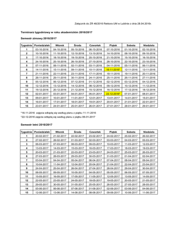 Załącznik do ZR 46/2016 Rektora UM w Lublinie z dnia 28.04.2016r. Terminarz tygodniowy w roku akademickim 2016/2017 Semestr zimowy 2016/2017 Tygodnie Poniedziałek Wtorek Środa Czwartek Piątek Sobota Niedziela 1 03-10-2016 04-10-2016 05-10-2016 06-10-2016 07-10-2016 01-10-2016 02-10-2016 2 10-10-2016 11-10-2015 12-10-2016 13-10-2016 14-10-2016 08-10-2016 09-10-2016 3 17-10-2016 18-10-2016 19-10-2016 20-10-2016 21-10-2016 15-10-2016 16-10-2016 4 24-10-2016 25-10-2016 26-10-2016 27-10-2016 28-10-2016 22-10-2016 23-10-2016 5 07-11-2016 08-11-2016 02-11-2016 03-11-2016 04-11-2016 05-11-2016 06-11-2016 6 14-11-2016 15-11-2016 09-11-2016 10-11-2016 16-11-2016* 12-11-2016 13-11-2016 7 21-11-2016 22-11-2016 23-11-2016 17-11-2016 18-11-2016 19-11-2016 20-11-2016 8 28-11-2016 29-11-2016 30-11-2016 24-11-2016 25-11-2016 26-11-2016 27-11-2016 9 05-12-2016 06-12-2016 07-12-2016 01-12-2016 02-12-2016 03-12-2016 04-12-2016 10 12-12-2016 13-12-2016 14-12-2016 08-12-2016 09-12-2016 10-12-2016 11-12-2016 11 19-12-2016 20-12-2016 21-12-2016 15-12-2016 16-12-2016 17-12-2016 18-12-2016 12 02-01-2017 03-01-2017 04-01-2017 05-01-2017 22-12-2016* 07-01-2017 08-01-2017 13 09-01-2017 10-01-2017 11-01-2017 12-01-2017 13-01-2017 14-01-2017 15-01-2017 14 16-01-2017 17-01-2017 18-01-2017 19-01-2017 20-01-2017 21-01-2017 22-01-2017 15 23-01-2017 24-01-2017 25-01-2017 26-01-2017 27-01-2017 28-01-2017 29-01-2017 *16-11-2016 zajęcia odbędą się według planu z piątku 11-11-2016 *22-12-2016 zajęcia odbędą się według planu z piątku 06-01-2017 Semestr letni 2016/2017 Tygodnie Poniedziałek Wtorek Środa Czwartek Piątek Sobota Niedziela 1 20-02-2017 21-02-2017 22-02-2017 23-02-2017 24-02-2017 25-02-2017 26-02-2017 2 27-02-2017 28-02-2017 01-03-2017 02-03-2017 03-03-2017 04-03-2017 05-03-2017 3 06-03-2017 07-03-2017 08-03-2017 09-03-2017 10-03-2017 11-03-2017 12-03-2017 4 13-03-2017 14-03-2017 15-03-2017 16-03-2017 17-03-2017 18-03-2017 19-03-2017 5 20-03-2017 21-03-2017 22-03-2017 23-03-2017 24-03-2017 25-03-2017 26-03-2017 6 27-03-2017 28-03-2017 29-03-2017 30-03-2017 31-03-2017 01-04-2017 02-04-2017 7 03-04-2017 04-04-2017 05-04-2017 06-04-2017 07-04-2017 08-04-2017 09-04-2017 8 10-04-2017 11-04-2017 12-04-2017 20-04-2017 21-04-2017 22-04-2017 23-04-2017 9 24-04-2017 25-04-2017 26-04-2017 27-04-2017 28-04-2017 29-04-2017 30-04-2017 10 08-05-2017 09-05-2017 10-05-2017 04-05-2017 05-05-2017 06-05-2017 07-05-2017 11 15-05-2017 16-05-2017 17-05-2017 11-05-2017 12-05-2017 13-05-2017 14-05-2017 12 22-05-2017 23-05-2017 24-05-2017 18-05-2017 19-05-2017 20-05-2017 21-05-2017 13 29-05-2017 30-05-2017 31-05-2017 25-05-2017 26-05-2017 27-05-2017 28-05-2017 14 05-06-2017 06-06-2017 07-06-2017 01-06-2017 02-06-2017 03-06-2017 04-06-2017 15 12-06-2017 13-06-2017 14-06-2017 08-06-2017 09-06-2017 10-06-2017 11-06-2017