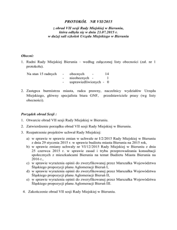 PROTOKÓŁ NR VII/2015 z obrad VII sesji Rady Miejskiej w Bieruniu, która odbyła się w dniu 23.07.2015 r. w dużej sali szkoleń Urzędu Miejskiego w Bieruniu Obecni: 1. Radni Rady Miejskiej Bierunia – według załączonej listy obecności (zał. nr 1 protokołu). Na stan 15 radnych - obecnych 14 nieobecnych 1 usprawiedliwionych - 0 2. Zastępca burmistrza miasta, radca prawny, naczelnicy wydziałów Urzędu Miejskiego, główny specjalista biura GNF, przedstawiciele prasy (wg listy obecności). Porządek obrad Sesji : 1. Otwarcie obrad VII sesji Rady Miejskiej w Bieruniu. 2. Zatwierdzenie porządku obrad VII sesji Rady Miejskiej w Bieruniu. 3. Rozpatrzenie projektów uchwał Rady Miejskiej: a) w sprawie w sprawie zmian w uchwale nr I/2/2015 Rady Miejskiej w Bieruniu z dnia 29 stycznia 2015 r. w sprawie budżetu miasta Bierunia na 2015 rok, b) w sprawie zmiany uchwały nr VI/12/2015 Rady Miejskiej w Bieruniu z dnia 25 czerwca 2015 r. w sprawie zasad i trybu przeprowadzania konsultacji społecznych z mieszkańcami Bierunia na temat Budżetu Miasta Bierunia na 2016 r., c) w sprawie wyrażenia opinii do zweryfikowanej przez Marszałka Województwa Śląskiego propozycji planu Aglomeracji Bieruń I, d) w sprawie wyrażenia opinii do zweryfikowanej przez Marszałka Województwa Śląskiego propozycji planu Aglomeracji Bieruń II, e) w sprawie wyrażenia opinii do zweryfikowanej przez Marszałka Województwa Śląskiego propozycji planu Aglomeracji Bieruń III. 4. Zakończenie obrad VII sesji Rady Miejskiej w Bieruniu. -2- Ad. 1 Przewodniczący rady Adam Rozmus działając na podstawie ustawy o samorządzie gminnym z dnia 8 marca 1990 r., art. 20 ust. 1, otworzył obrady VII sesji Rady Miejskiej w Bieruniu. Na podstawie § 9 ust. 1 Regulaminu obrad Rady Miejskiej stwierdził, że liczba obecnych na sali radnych pozwala na prawomocne obradowanie i podejmowanie uchwał. Następnie przywitał: radnych, zastępcę burmistrza miasta Sebastiana Macioła, naczelnika wydziału finansowego Sylwię Krenzel, głównego specjalistę biura funduszy zewnętrznych Agnieszkę Furgał-Demską, naczelnika wydziału komunikacji społecznej Przemysława Majora, radcę prawnego Adama Zuga oraz przedstawicieli prasy. Ad. 2 Przewodniczący rady odnosząc się do porządku obrad VII sesji Rady Miejskiej w Bieruniu, który radni otrzymali wraz z projektami uchwały zapytał, czy radni wnoszą o jego poszerzenie bądź ograniczenie. Radni nie wnieśli uwag. Zastępca burmistrza Sebastian Macioł zwrócił się o wprowadzenie do porządku obrad projektu uchwały w sprawie zmiany Wieloletniej Prognozy Finansowej wraz z prognozą kwoty długu i spłat zobowiązań Miasta Bierunia na lata 2015 – 2025. Rada przystąpiła do głosowania: za wprowadzeniem do porządku obrad projektu uchwały w sprawie zmiany Wieloletniej Prognozy Finansowej wraz z prognozą kwoty długu i spłat zobowiązań Miasta Bierunia na lata 2015 – 2025. W wyniku głosowania oddano: 13 głosów za Zmiana została przyjęta jednogłośnie, za przyjęciem porządku obrad z przegłosowaną zmianą dotyczącą wprowadzenia w/wym. projektu uchwały. -3- W wyniku głosowania oddano: 13 głosów za Porządek obrad VII sesji Rady wraz z przegłosowaną zmianą został przyjęty jednogłośnie. Ad. 3 Przewodniczący rady zwrócił się do Rady o rozpatrzenie i podjęcie następujących uchwał: a) w sprawie zmian w uchwale nr I/2/2015 Rady Miejskiej w Bieruniu z dnia 29 stycznia 2015 r. w sprawie budżetu miasta Bierunia na 2015 rok, Zastępca burmistrza dokonał wprowadzenia do projektu uchwały, informując o możliwości aplikowania o środki zewnętrzne w ramach RPO 2007 – 2013 na przebudowę jednej z dróg w Bieruniu. Biorąc pod uwagę założenia konkursu, okres realizacji potencjalnej inwestycji oraz możliwości finansowe gminy proponuje się Radzie utworzenie nowej pozycji budżetowej dotyczącej przebudowy ul. Granitowej – etap II i aplikowanie o te środki. Przedstawił szczegóły dotyczące konkursu oraz poinformował o konieczności zagwarantowania środków na całą inwestycję. W celu dokonania tego poszukano oszczędności w wielu zadaniach budżetowych, które zostały wskazane w w/wym. projekcie uchwały oraz zaproponowano wycofanie 3-ch zadań, takich jak: termomodernizacja „Jutrzenki”, budowa miejsc parkingowych przy ul. Węglowej i wykonanie dokumentacji projektowej na remont ul. Remizowej, przy czym zakłada się, że jak powstaną oszczędności, te zadania poza termomodernizacją „Jutrzenki” zostaną zaproponowane, by powróciły w tym roku do budżetu. Naczelnik wydziału FN Sylwia Krenzel omówiła zmiany w budżecie zgodnie z 2-ma załącznikami. W dyskusji głos zabrali: Radna Natalia Grosman stwierdziła, że wprowadzenie do budżetu zadania „Przebudowa ul. Granitowej” jest ważnym i oczekiwanym przez mieszkańców zadaniem, jednak trudno zgodzić się z likwidacją pewnych zadań w budżecie, m.in. -4- zwiększenia miejsc postojowych na osiedlu Węglowa. Zapytała, czy nie można by poszukać kwoty przeznaczonej na to zadanie z innych źródeł, czy jest gwarancja powrotu tego zadania do realizacji w tym roku. Radny Jarosław Mokry wyraził zainteresowanie jednym z zadań przeznaczonych do likwidacji z budżetu 2015, a mianowicie dotyczącym „wykonania dokumentacji projektowej na ul. Remizową” i zwrócił o przywrócenie do budżetu tych zadań, które zostaną usunięte, gdy pojawią się oszczędności. Zwrócił się również o przedstawienie szerszej informacji w sprawie zakresu prac zadania pn. „Przebudowa ul. Granitowej”. Radni: Henryk Mazgaj, Krystyna Wróbel, Stanisław Jurecki zwrócili się do radnych o poparcie inicjatywy wprowadzenia do budżetu zadania „Przebudowa ul. Granitowej”, ponieważ istnieje możliwość pozyskania środków zewnętrznych i zwrotu części kosztów. Radny Piotr Świerkosz zapytał, czy kwota 44 tys. zł na zadanie „Budowa kanalizacji deszczowej przy u