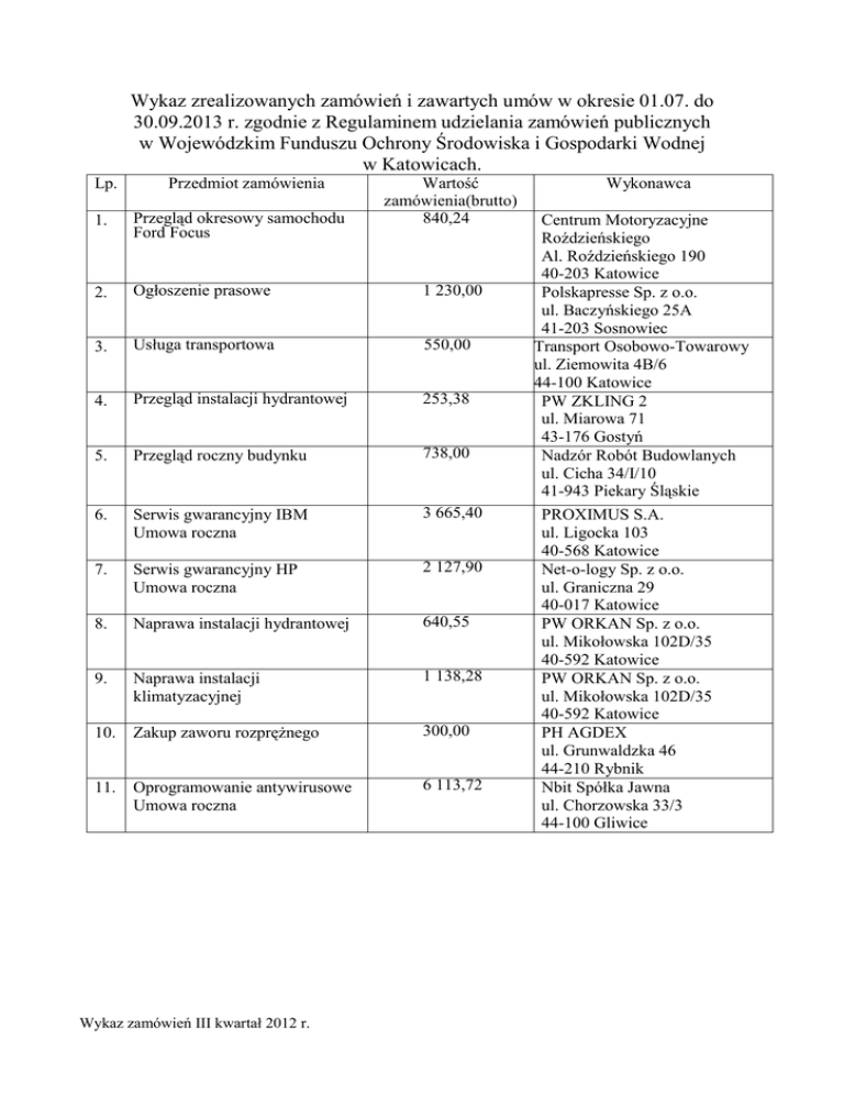 Wykaz zrealizowanych zamówień i zawartych umów w okresie 01.07. do 30.09.2013 r. zgodnie z Regulaminem udzielania zamówień publicznych w Wojewódzkim Funduszu Ochrony Środowiska i Gospodarki Wodnej w Katowicach. Lp. Przedmiot zamówienia Wartość zamówienia(brutto) 840,24 1. Przegląd okresowy samochodu Ford Focus 2. Ogłoszenie prasowe 1 230,00 3. Usługa transportowa 550,00 4. Przegląd instalacji hydrantowej 253,38 5. Przegląd roczny budynku 738,00 6. Serwis gwarancyjny IBM Umowa roczna 3 665,40 7. Serwis gwarancyjny HP Umowa roczna 2 127,90 8. Naprawa instalacji hydrantowej 640,55 9. Naprawa instalacji klimatyzacyjnej 1 138,28 10. Zakup zaworu rozprężnego 300,00 11. Oprogramowanie antywirusowe Umowa roczna 6 113,72 Wykaz zamówień III kwartał 2012 r. Wykonawca Centrum Motoryzacyjne Roździeńskiego Al. Roździeńskiego 190 40-203 Katowice Polskapresse Sp. z o.o. ul. Baczyńskiego 25A 41-203 Sosnowiec Transport Osobowo-Towarowy ul. Ziemowita 4B/6 44-100 Katowice PW ZKLING 2 ul. Miarowa 71 43-176 Gostyń Nadzór Robót Budowlanych ul. Cicha 34/I/10 41-943 Piekary Śląskie PROXIMUS S.A. ul. Ligocka 103 40-568 Katowice Net-o-logy Sp. z o.o. ul. Graniczna 29 40-017 Katowice PW ORKAN Sp. z o.o. ul. Mikołowska 102D/35 40-592 Katowice PW ORKAN Sp. z o.o. ul. Mikołowska 102D/35 40-592 Katowice PH AGDEX ul. Grunwaldzka 46 44-210 Rybnik Nbit Spółka Jawna ul. Chorzowska 33/3 44-100 Gliwice