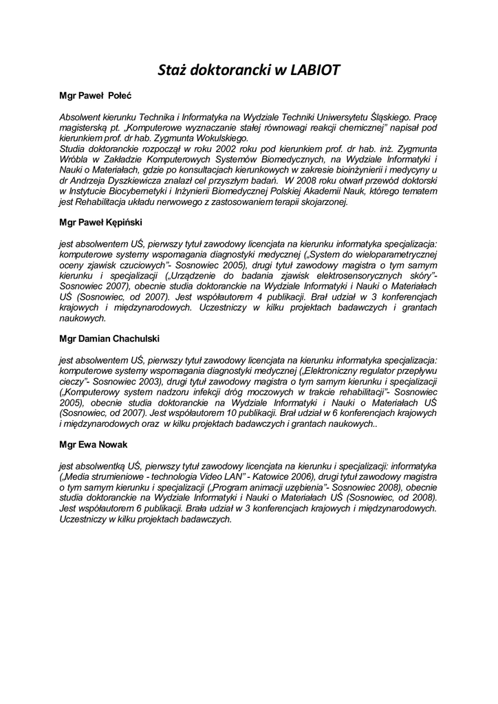 Staż doktorancki w LABIOT Mgr Paweł Połeć Absolwent kierunku Technika i Informatyka na Wydziale Techniki Uniwersytetu Śląskiego. Pracę magisterską pt. „Komputerowe wyznaczanie stałej równowagi reakcji chemicznej” napisał pod kierunkiem prof. dr hab. Zygmunta Wokulskiego. Studia doktoranckie rozpoczął w roku 2002 roku pod kierunkiem prof. dr hab. inż. Zygmunta Wróbla w Zakładzie Komputerowych Systemów Biomedycznych, na Wydziale Informatyki i Nauki o Materiałach, gdzie po konsultacjach kierunkowych w zakresie bioinżynierii i medycyny u dr Andrzeja Dyszkiewicza znalazł cel przyszłym badań. W 2008 roku otwarł przewód doktorski w Instytucie Biocybernetyki i Inżynierii Biomedycznej Polskiej Akademii Nauk, którego tematem jest Rehabilitacja układu nerwowego z zastosowaniem terapii skojarzonej. Mgr Paweł Kępiński jest absolwentem UŚ, pierwszy tytuł zawodowy licencjata na kierunku informatyka specjalizacja: komputerowe systemy wspomagania diagnostyki medycznej („System do wieloparametrycznej oceny zjawisk czuciowych”- Sosnowiec 2005), drugi tytuł zawodowy magistra o tym samym kierunku i specjalizacji („Urządzenie do badania zjawisk elektrosensorycznych skóry”Sosnowiec 2007), obecnie studia doktoranckie na Wydziale Informatyki i Nauki o Materiałach UŚ (Sosnowiec, od 2007). Jest współautorem 4 publikacji. Brał udział w 3 konferencjach krajowych i międzynarodowych. Uczestniczy w kilku projektach badawczych i grantach naukowych. Mgr Damian Chachulski jest absolwentem UŚ, pierwszy tytuł zawodowy licencjata na kierunku informatyka specjalizacja: komputerowe systemy wspomagania diagnostyki medycznej („Elektroniczny regulator przepływu cieczy”- Sosnowiec 2003), drugi tytuł zawodowy magistra o tym samym kierunku i specjalizacji („Komputerowy system nadzoru infekcji dróg moczowych w trakcie rehabilitacji”- Sosnowiec 2005), obecnie studia doktoranckie na Wydziale Informatyki i Nauki o Materiałach UŚ (Sosnowiec, od 2007). Jest współautorem 10 publikacji. Brał udział w 6 konferencjach krajowych i międzynarodowych oraz w kilku projektach badawczych i grantach naukowych.. Mgr Ewa Nowak jest absolwentką UŚ, pierwszy tytuł zawodowy licencjata na kierunku i specjalizacji: informatyka („Media strumieniowe - technologia Video LAN” - Katowice 2006), drugi tytuł zawodowy magistra o tym samym kierunku i specjalizacji („Program animacji uzębienia”- Sosnowiec 2008), obecnie studia doktoranckie na Wydziale Informatyki i Nauki o Materiałach UŚ (Sosnowiec, od 2008). Jest współautorem 6 publikacji. Brała udział w 3 konferencjach krajowych i międzynarodowych. Uczestniczy w kilku projektach badawczych.