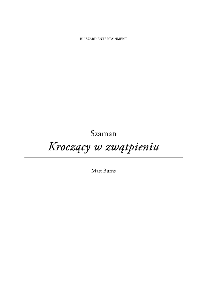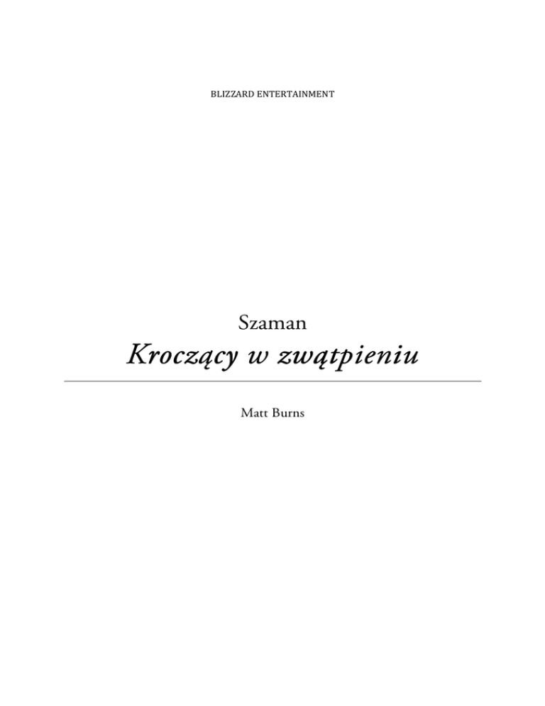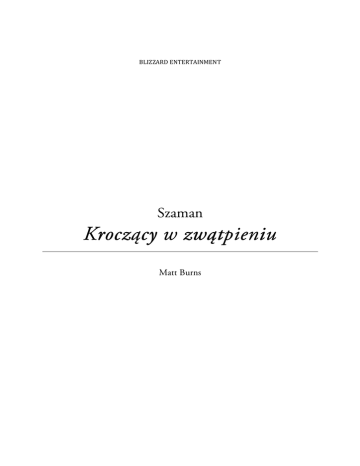 BLIZZARD ENTERTAINMENT Szaman Kroczący w zwątpieniu Matt Burns Kroczący w zwątpieniu – Matt Burns Jak zawsze, wojna zaczęła się o wschodzie słońca. Bezszelestnie jak pantery, Benu i dziesięciu innych szamanów z Klanu Siedmiu Kamieni zakradli się do serca Teganze. O ich nadejściu ostrzegał jedynie cichy grzechot kościanych i metalowych talizmanów przywieszonych do plemiennych masek. Wymalowani na biało, żółto i czerwono, przystrojeni w jaskrawe pióra ptaków bokai szamani wtapiali się w tętniącą barwami życia dżunglę. Wkrótce cień szmaragdowozielonych koron drzew zgęstniał, pogrążając poszycie puszczy w wiecznym półmroku. Benu wytężył słuch... Próbował wychwycić odgłosy, które naprowadzą go na ludzką zwierzynę. Nadeszła pora Igani Bawe – Żniwa Dusz. Była to pierwsza rytualna wojna, w której uczestniczył Benu. Z podniecenia serce waliło mu jak bęben. Gdzie indziej w dzikiej puszczy, może nawet nieopodal, szamani plemion Pięciu Wzgórz i Doliny Chmur również polowali, wezwani nakazami najwyższych kapłanów tak samo jak Benu i jego lud. Drużyna Siedmiu Kamieni zatrzymała się na odpoczynek wewnątrz obrębu terytorium Pięciu Wzgórz. Dwaj szamani wyruszyli na zwiady w gęstwinę. – Drżysz na myśl o bitwie, która ma nadejść? – szepnął Ungate, mentor Benu. Z jego przerażającej drewnianej maski sterczał pojedynczy róg z kości słoniowej, zwieńczony fioletowym pierzem. – Nie drżę – zapewnił Benu. – Pokaż rękę. Benu wziął głęboki oddech, aby uspokoić nerwy i wykonał polecenie. Był zadowolony, że dłoń mu nie zadrżała. – Boisz się bitwy, która ma nadejść? – Ungate pochylił się , zniżywszy głos. – Każdy człowiek się boi. W tej krainie cieni to naturalne. Ręka mi nie drży, bo nad tym panuję. Gdybym próbował zaprzeczać temu, co czuję, pozwoliłbym, by to emocje zapanowały nade mną – odpowiedział młody szaman. Ungate z aprobatą położył rękę na ramieniu Benu. Ten odetchnął z ulgą. Nie bał się, ale był zaniepokojony. Czekał na ten dzień całymi latami szkolenia. Nie było większego zaszczytu niż walka podczas Igani. Dzięki temu odwiecznemu rytuałowi lud Benu i jego wiara trwały od pokoleń. Przed zachodem słońca, kiedy łowy dobiegną końca, Benu wróci do domu zwycięski lub zginie z rąk wrogiego plemienia. Strona | 1 Kroczący w zwątpieniu – Matt Burns Cokolwiek się stanie, będzie to na swój sposób honorowe. Jeśli młody szaman pojmie ofiary, zasłuży na uznanie i podziw swoich pobratymców. Jeśli stanie się ofiarą, jego duch uwolniony z tej krainy cieni przejdzie do prawdziwej rzeczywistości – Mbwiru Eikura – Bezkształtnej Krainy. Takie było przeznaczenie szamanów, strażników tradycji umbaru. Stanowili żywy pomost między tym światem a zaświatami. Tak było od zawsze i tak zawsze będzie. – Żyć, znaczy składać ofiarę. – Podniósł głowę i wypiął dumnie pierś. – Składać ofiarę, znaczy żyć. – dokończył Ungate stare powiedzenie umbaru. Zwiadowca wynurzył się z dżungli i na migi przekazał, co widział: szamana Pięciu Wzgórz. Samego. Wojownicy ruszyli na łowy. W półokręgu przedzierali się przez zarośla. Na terenie nazywanym Wzgórzami Mgieł dżungla zaczęła się przerzedzać. Wkrótce zobaczyli we mgle człowieka: starszego szamana w masce, pooranej bliznami i znakiem czasu tak, jak jego własna skóra. Ungate przykucnął, wyciągnął zza pasa dmuchawkę o długości przedramienia i przyłożył do ust przez otwór w masce. Posłał w kierunku wroga strzałkę nasączoną trucizną z gruczołów ropuch uapa. Strzałka trafiła mężczyznę w plecy, zanim ten zdążył się zorientować w sytuacji. Sparaliżowany starzec osunął się na kolana. Trucizna nie czyniła jednak większych szkód. Miała tylko zranić i unieruchomić. Zabijanie przeciwników na tym etapie Igani stanowiło tabu i podlegało karze. Pokonany szaman przeciwników postąpił tak, jak dyktował zwyczaj. – Siedem Kamieni… – wystękał. – Zakradliście się daleko w nasze ziemie. – Żeby znaleźć godną ofiarę – odparł Ungate. – Jesteś wielki Zuwadza, tak? – To ja. – Starzec opuścił głowę. Benu przysłuchiwał się rozmowie i przyglądał z daleka, ucząc się zachowania od swych bardziej doświadczonych pobratymców. Pilnie studiował reguły bitwy, ale dopiero gdy ujrzał je na własne oczy, pojął je w pełni i poczuł spełnienie. – Jesteś większym wojownikiem niż ja. – Ungate podszedł i objął Zuwadzę. – Tutaj jesteśmy wrogami, ale w Mbwiru Eikura jesteśmy braćmi po wieki wieków. Czekam na szansę, by cię tam spotkać. Zuwadza wstał o własnych siłach, trucizna powoli przestawała działać. Kiedy był blisko, Benu skłonił głowę na znak szacunku. Zazdrościł starcowi. Dzisiaj kapłani zakończą cierpienia pojmanego szamana. Krew i organy starca zostaną ofiarowane duchom Bezkształtnej Krainy. Strona | 2 Kroczący w zwątpieniu – Matt Burns Jego siła użyźni nie tylko prawdziwą ziemię dla tych, którzy przybędą potem, lecz także wzmocni ten świat. Od ofiary zależały udane plony, zmiany pór roku i całe życie ludu umbaru. W oczach Benu Zuwadza był bohaterem. Grupa wyruszyła do domu. Zuwadza pilnie przyglądał się Te Wok Nu'cha, Ostatniemu Marszowi. Trzymał głowę wysoko, pogodzony z losem. Benu i jego pobratymcy dotarli już na skraj dżungli. – Zostawcie go! – rozległ się głos we mgle. Cała grupa, także Zuwadza, zdezorientowana rozejrzała się za tym, kto się odezwał. – Zostawcie go i odejdźcie. Nie ma powodu odbierać mu życia. Ten starzec może jeszcze wiele nas nauczyć. – Z oparów wyłonił się zamaskowany szaman. Jak wszyscy uczestnicy Igani nosił jaskrawe barwy i pióra. Znaki na jego ciele wskazywały, że pochodzi z plemienia Pięciu Wzgórz. – Zgodnie z prawem należę do nich – przemówił Zuwadza. Ze