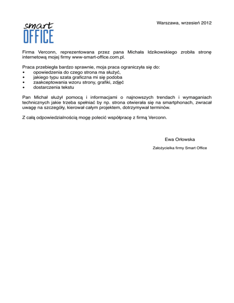 Warszawa, wrzesień 2012 Firma Verconn, reprezentowana przez pana Michała Idzikowskiego zrobiła stronę internetową mojej firmy www-smart-office.com.pl. Praca przebiegła bardzo sprawnie, moja praca ograniczyła się do: • opowiedzenia do czego strona ma służyć, • jakiego typu szata graficzna mi się podoba • zaakceptowania wzoru strony, grafiki, zdjęć • dostarczenia tekstu Pan Michał służył pomocą i informacjami o najnowszych trendach i wymaganiach technicznych jakie trzeba spełniać by np. strona otwierała się na smartphonach, zwracał uwagę na szczegóły, kierował całym projektem, dotrzymywał terminów. Z całą odpowiedzialnością mogę polecić współpracę z firmą Verconn. Ewa Orłowska Założycielka firmy Smart Office