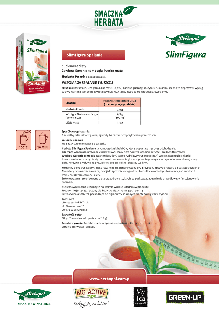 SlimFigura Spalanie Suplement diety Zawiera Garcinia cambogia i yerba mate Herbata Pu-erh z dodatkiem ziół. WSPOMAGA SPALANIE TŁUSZCZU Składniki: herbata Pu-erh (50%), liść mate (14,5%), nasiona guarany, koszyczek rumianku, liść mięty pieprzowej, wyciąg suchy z Garcinia cambogia zawierający 60% HCA (6%), owoc kopru włoskiego, owoc anyżu. Napar z 3 saszetek po 2,5 g (dzienna porcja produktu) Składnik Herbata Pu-erh Wyciąg z Gacinia cambogia (w tym HCA) Liście mate 3,8 g 0,5 g (300 mg) 1,1 g Sposób przygotowania: 1 saszetkę zalać szklanką wrzącej wody. Naparzać pod przykryciem przez 10 min. Zalecane spożycie: Pić 3 razy dziennie napar z 1 saszetki. Herbata SlimFigura Spalanie to kompozycja składników, które wspomagają proces odchudzania. Liść mate wspomaga utrzymanie prawidłowej masy ciała poprzez wsparcie rozkładu lipidów (tłuszczów). Wyciąg z Garcinia cambogia (zawierający 60% kwasu hydroksycytrynowego HCA) wspomaga redukcję tkanki tłuszczowej oraz przyczynia się do zmniejszenia uczucia głodu, a przez to pomaga w utrzymaniu prawidłowej masy ciała. Korzystnie wpływa na prawidłowy poziom cukru i tłuszczu we krwi. Korzystny efekt wynikający z deklarowanego działania występuje w przypadku spożycia naparu z 3 saszetek dziennie. Nie należy przekraczać zalecanej porcji do spożycia w ciągu dnia. Produkt nie może być stosowany jako substytut (zamiennik) zróżnicowanej diety. Zrównoważona i zróżnicowana dieta oraz zdrowy styl życia są podstawą zapewnienia prawidłowego funkcjonowania organizmu. Nie stosować u osób uczulonych na którykolwiek ze składników produktu. Produkt nie jest przeznaczony dla kobiet w ciąży i karmiących piersią. Przebarwienia saszetek pochodzące od pigmentów roślinnych nie stanowią wady wyrobu. Producent: ,,Herbapol-Lublin” S.A. ul. Diamentowa 25 20-471 Lublin, Polska Zawartość netto 50 g (20 saszetek w kopertce po 2,5 g) Przechowywanie: Przechowywać w sposób niedostępny dla małych dzieci. Chronić od światła i wilgoci. www.herbapol.com.pl