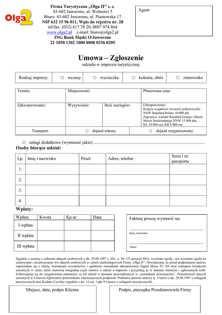 Firma Turystyczna „Olga II” s. c. 43-602 Jaworzno, ul. Wolności 5 Biuro: 43-602 Jaworzno, ul. Piastowska 17 NIP 632 15 96 011, Wpis do rejestru nr. 28 tel/fax: (032) 617 78 20, 0607 074 864 www.olga2.pl e-mail: [email protected] ING Bank Śląski O/Jaworzno 21 1050 1302 1000 0008 0336 0205 Agent: Umowa – Zgłoszenie udziału w imprezie turystycznej Rodzaj imprezy: □ wczasy □ wycieczka Termin: Miejscowość: Zakwaterowanie: Wyżywienie: Transport: □ □ kolonia, obóz □ zimowisko Planowana cena: Ilość noclegów: dojazd własny Ubezpieczenie: Kraj(za wyjątkiem wczasów pobytowych): NNW Standard Polska 10 000 pln Zagranica: wariant Standard Europa i Basen Morza Środziemnego NNW 15 000 pln, KL 10 000 eur, KR 6 000 eur □ dojazd zorganizowany □ usługi dodatkowe (wymienić jakie) .................................................................................................... Osoby biorące udział: Lp. Imię i nazwisko Pesel Adres, telefon 1. Seria i nr paszportu 2. 3. 4. Wpłaty: Wpłaty I wpłata Kwota Kp nr II wpłata III wpłata Data Fakturę proszę wystawić na: .................................................................. Imię, nazwisko ................................................................... Adres Zgodnie z ustawą o ochronie danych osobowych z dn. 29.08.1997 r. (Dz. u. Nr 133 pozycja 883), wyrażam zgodę / nie wyrażam zgody na zachowanie i przetwarzanie ww danych osobowych w celach marketingowych Firmy „Olga II”. Oświadczam, że przed podpisaniem umowy zapoznałem się z ofertą, warunkami uczestnictwa i ogólnymi warunkami ubezpieczenia Signal Iduna TU SA oraz rodzajem świadczeń zawartych w cenie, które stanowią integralną część umowy o udział w imprezie i przyjmuję je w imieniu własnym i zgłoszonych osób. Zobowiązuję się do uregulowania należności za ich udział w terminie przewidzianym w „warunkach uczestnictwa”. Prawdziwość danych zawartych w Umowie-Zgłoszeniu potwierdzam własnoręcznym podpisem. Podstawa prawna umowy tj. Ustawa z dn. 29.08.1997 o usługach turystycznych oraz Kodeks Cywilny (zgodnie z atr. 12 ust. 1 pkt 9 Ustawy o usługach turystycznych). Miejsce, data, podpis Klienta: Podpis, pieczątka Przedstawiciela Firmy