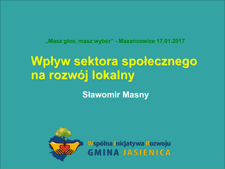„Masz głos, masz wybór” - Mazańcowice 17.01.2017 Wpływ sektora społecznego na rozwój lokalny Sławomir Masny W pełni rozwinięte państwo demokratyczne i obywatelskie posiada trzy dające się wyróżnić sektory: Sektor I Sektor II Sektor III Publiczny Prywatny Społeczny rząd, samorząd i ich agendy organizacje gospodarcze, for-profit organizacje non-profit (organizacje pozarządowe) Rozwój trzeciego sektora w Polsce: 1984r. - ustawa o fundacjach 1989r. - ustawa Prawo o stowarzyszeniach – obywatele mogą tworzyć wolne organizacje – stowarzyszenia 1997r. - Konstytucja Rzeczypospolitej Polskiej – zasada pomocniczości 1999r. - decentralizacja administracji publicznej – decentralizacja funkcji społecznych państwa 2003r. - ustawa o działalności pożytku publicznego i wolontariacie 2004r. - wejście Polski do Unii Europejskiej – możliwość pozyskiwania nowych środków zewnetrznych 2010r. - nowelizacja ustawy o opp i wolontariacie z 2010 roku KONSTYTUCJA RZECZYPOSPOLITEJ POLSKIEJ z dnia 2 kwietnia 1997 r. PREAMBUŁA ...w poczuciu odpowiedzialności przed Bogiem lub przed własnym sumieniem, ustanawiamy Konstytucję Rzeczypospolitej Polskiej jako prawa podstawowe dla państwa oparte na poszanowaniu wolności i sprawiedliwości, współdziałaniu władz, dialogu społecznym oraz na zasadzie pomocniczości umacniającej uprawnienia obywateli i ich wspólnot... Zasada pomocniczości (subsydiarności) „tyle państwa ile jest potrzeba, tyle społeczeństwa ile tylko można” W zakresie współpracy między administracją publiczną i organizacjami trzeciego sektora nowelizacją z 2010 r. wprowadzono wiele istotnych zmian: - inicjatywa lokalna - ustanowiono działalność rad pożytku publicznego na poziomie lokalnym, które mają być jeszcze jednym forum współpracy międzysektorowej - umożliwiono obywatelom (a zwłaszcza sformalizowanym organizacjom pozarządowym) systematyczny wpływ na proces stanowienia prawa Dziękuję za uwagę