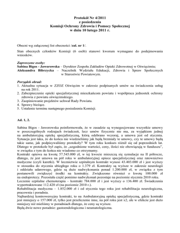 Protokół Nr 4/2011 z posiedzenia Komisji Ochrony Zdrowia i Pomocy Społecznej w dniu 10 lutego 2011 r. Obecni wg załączonej list obecności /zał. nr 1/. Stan obecnych członków Komisji (6 osób) stanowi kworum wymagane do podejmowania wniosków. Zaproszone osoby: Sabina Bigos - Jaworowska – Dyrektor Zespołu Zakładów Opieki Zdrowotnej w Oświęcimiu; Aleksandra Bibrzycka – Naczelnik Wydziału Edukacji, Zdrowia i Spraw Społecznych w Starostwie Powiatowym. Porządek obrad: 1. Aktualna sytuacja w ZZOZ Oświęcim w zakresie podpisanych umów na świadczenia usług na rok 2011. 2. Zabezpieczenie opieki specjalistycznej mieszkańcom powiatu i współpraca jednostek ochrony zdrowia z powiatu oświęcimskiego. 3. Zaopiniowanie projektów uchwał Rady Powiatu. 4. Sprawy bieŜące. 5. Ustalenie terminu następnego posiedzenia Komisji. Ad. 1, 2. Sabina Bigos - Jaworowska poinformowała, Ŝe w zasadzie są wynegocjowane wszystkie umowy w poszczególnych rodzajach świadczeń, lecz umów fizycznie nie ma, za wyjątkiem jednej na ambulatoryjną opiekę specjalistyczną, którą odebrano wczoraj, a umowa jest od stycznia. Sytuacja jest taka, Ŝe do końca nie wiedzieliśmy jak będą brzmiały te umowy, czy te umowy będą takie same, jak podpisywaliśmy protokoły? W tym roku konkurs róŜnił się od poprzednich lat. Dlatego w protokole był zapis, Ŝe „uzgodnione wartości, ceny, ilości nie obowiązują w funduszu”, w związku z tym do końca nie wiadomo co otrzymamy. Kontrakt opiewa na kwotę 57.545.000 zł, w tej kwocie mieszczą się symulacje na II półrocze, dlatego, Ŝe jest umowa na pół roku w ambulatoryjnej opiece specjalistycznej oraz ratownictwo medyczne (czyli karetki). W lecznictwie szpitalnym kontrakt wynosi 43.403.000 zł i jest wyŜszy w stosunku do stycznia ubiegłego roku o 1.379 zł. Kontrakty są wyŜsze w zakresie neurologii i oddziału udarowego, gdzie są duŜe nadwykonania ponad 1.200.000 zł, w związku z tym postanowili zwiększyć środki na kontrakty. Zwiększono równieŜ o kwotę 100.000 zł na endoprotezy. Pozostała część pomimo nadwykonań pozostaje na poziomie stycznia 2010 roku. Leczenie szpitalne chemoterapia – kontrakt 784.000 zł i jest wyŜszy o 136.400 zł. Świadczenia wypertraktowane 112.420 zł (na poziomie 2010 r.). Rehabilitacja medyczna – 1.852.000 zł i od stycznia tego roku jest rehabilitacja neurologiczna, pracownia i poradnia. Najbardziej kontrowersyjny kontrakt, to na Ambulatoryjną opiekę specjalistyczną, gdzie kontrakt jest mniejszy o 157.000 zł, tylko jest przeliczenie inne, na pół roku jest x2, ale w efekcie jest duŜo mniejszy niŜ mieliśmy w poradniach dlatego, Ŝe ceny są wyŜsze. Będą dwie nowe poradnie: gastoendologiczna i neumatologiczna. DuŜy problem jest z małymi kontraktami tj. kardiologia, której kontrakt skończył się końcem ubiegłego roku, a otrzymany nowy kontrakt jest o połowę niŜszy (tj. około 1500 poradni). Ortopedia było prawie 31.000 pkt, a otrzymaliśmy 25.000 pkt na pół roku. W poradni chirurgicznej równieŜ zostały zmniejszone pkt. Na Psychiatrię kontrakt opiewa na kwotę 2.699.000 zł i jest niŜszy o kwotę 124.000 zł. Promocja zdrowia. Pani Sabina Bigos – Jaworowska informuje, Ŝe środki z budŜetu powiatu, z promocji zdrowia w obecnym roku przeznaczone będą na badania koronoskopowe w kwocie 68.000 zł. Pani Sabina Bigos – Jaworowska informuje, Ŝe w miejscowości Zator brakuje karetki, gdyŜ czas dojazdu z Oświęcimia przekracza 30 min. a dopuszczalny czas to do 20 min. Wniosek Nr 2/11 do Przewodniczącego Rady Powiatu oraz Zarządu Powiatu. Komisja wnioskuje o zorganizowanie i poświecenie jednej z sesji Rady Powiatu tematyce „Przyszłość słuŜby zdrowia w powiecie” /zał. nr 2/. Wniosek został przyjęty jednogłośnie – za 6 osób. Ad. 3. Zaopiniowanie projektów uchwał Rady Powiatu. • Projekt uchwały w sprawie wyraŜenia zgody na wynajęcie pomieszczeń portierni Szpitala Powiatowego w Oświęcimiu /zał. nr 3/. PowyŜszy projekt uchwały omówiła Sabina Bigos - Jaworowska. Komisja pozytywnie zaopiniowała projekt uchwały: jednogłośnie – za 6 osób. • Projekt uchwały w sprawie zmiany uchwały Nr VII/61/2007 Rady Powiatu w Oświęcimiu z dnia 25 kwietnia 2007 r. w sprawie powołania Rady Społecznej działające przy Zespole Zakładów Opieki Zdrowotnej w Oświęcimiu /zał. nr 4/. Projekt uchwały omówiła Aleksandra Bibrzycka. Komisja pozytywnie zaopiniowała projekt uchwały: jednogłośnie – za 6 osób. • Projekt uchwały w sprawie powołania Rady Społecznej działającej przy Powiatowych Zakładach Opiekuńczo-Leczniczych w Grojcu /zał. nr 5/. Projekt uchwały omówiła Aleksandra Bibrzycka. Komisja pozytywnie zaopiniowała projekt uchwały przy głosach: za 3 osoby, przeciw 2 osoby, wstrzyma. 1 osoba. 2 Ad. 3. Sprawy bieŜące. Przewodnicząca odczytała pismo znak WEŹ.8024-1/11 z dnia 25.01.2011 r. skierowane do Barbary Bułanowskiej – Dyrektora Małopolskiego Oddziału Wojewódzkiego Narodowego Funduszu Zdrowia w Krakowie /zał. nr 6/. Komisja przyjęła do wiadomości. Ad. 4. Ustalenie terminu następnego posiedzenia Komisji. Ustalono termin następnego posiedzenia Komisji na dzień 10 marca 2011 r. o godz. 1600. Temat: Funkcjonowanie Domu Pomocy Społecznej w Bobrku. Zaopiniowanie bieŜących projektów uchwał Rady Powiatu. Sprawy bieŜące. Ustalenie terminu następnego posiedzenia Komisji. Miejscem spotkania będzie Dom Pomocy Społecznej w Bobrku przy ul. KsięŜnej Ogińskiej 2. Zaproszona osoba: Mariusz Sajak – Dyrektor Domu Pomocy Społecznej w Bobrku. Na powyŜszym posiedzenie zakończono. Przewodnicząca Komisji Ochrony Zdrowia i Pomocy Społecznej Cecylia Ślusarczyk Protokołował: Tomasz Karcz 3