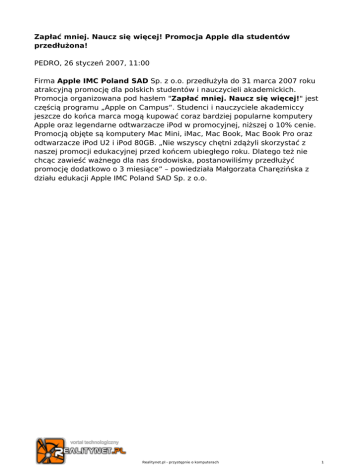 Zapłać mniej. Naucz się więcej! Promocja Apple dla studentów przedłużona! PEDRO, 26 styczeń 2007, 11:00 Firma Apple IMC Poland SAD Sp. z o.o. przedłużyła do 31 marca 2007 roku atrakcyjną promocję dla polskich studentów i nauczycieli akademickich. Promocja organizowana pod hasłem "Zapłać mniej. Naucz się więcej!" jest częścią programu „Apple on Campus“. Studenci i nauczyciele akademiccy jeszcze do końca marca mogą kupować coraz bardziej popularne komputery Apple oraz legendarne odtwarzacze iPod w promocyjnej, niższej o 10% cenie. Promocją objęte są komputery Mac Mini, iMac, Mac Book, Mac Book Pro oraz odtwarzacze iPod U2 i iPod 80GB. „Nie wszyscy chętni zdążyli skorzystać z naszej promocji edukacyjnej przed końcem ubiegłego roku. Dlatego też nie chcąc zawieść ważnego dla nas środowiska, postanowiliśmy przedłużyć promocję dodatkowo o 3 miesiące” – powiedziała Małgorzata Charęzińska z działu edukacji Apple IMC Poland SAD Sp. z o.o. Realitynet.pl - przystępnie o komputerach 1
