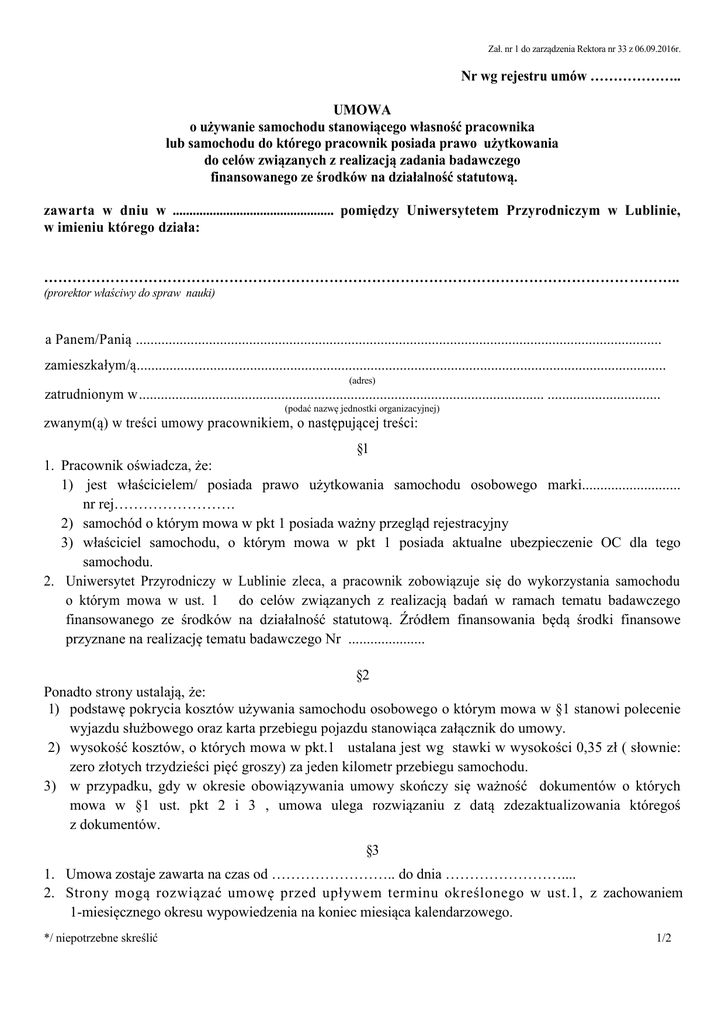 Zał. nr 1 do zarządzenia Rektora nr 33 z 06.09.2016r. Nr wg rejestru umów ……………….. UMOWA o używanie samochodu stanowiącego własność pracownika lub samochodu do którego pracownik posiada prawo użytkowania do celów związanych z realizacją zadania badawczego finansowanego ze środków na działalność statutową. zawarta w dniu w ................................................ pomiędzy Uniwersytetem Przyrodniczym w Lublinie, w imieniu którego działa: …………………………………………………………………………………………………………………….. (prorektor właściwy do spraw nauki) a Panem/Panią ................................................................................................................................................ zamieszkałym/ą................................................................................................................................................. (adres) zatrudnionym w ............................................................................................................... ............................... (podać nazwę jednostki organizacyjnej) zwanym(ą) w treści umowy pracownikiem, o następującej treści: §1 1. Pracownik oświadcza, że: 1) jest właścicielem/ posiada prawo użytkowania samochodu osobowego marki........................... nr rej……………………. 2) samochód o którym mowa w pkt 1 posiada ważny przegląd rejestracyjny 3) właściciel samochodu, o którym mowa w pkt 1 posiada aktualne ubezpieczenie OC dla tego samochodu. 2. Uniwersytet Przyrodniczy w Lublinie zleca, a pracownik zobowiązuje się do wykorzystania samochodu o którym mowa w ust. 1 do celów związanych z realizacją badań w ramach tematu badawczego finansowanego ze środków na działalność statutową. Źródłem finansowania będą środki finansowe przyznane na realizację tematu badawczego Nr ..................... §2 Ponadto strony ustalają, że: 1) podstawę pokrycia kosztów używania samochodu osobowego o którym mowa w §1 stanowi polecenie wyjazdu służbowego oraz karta przebiegu pojazdu stanowiąca załącznik do umowy. 2) wysokość kosztów, o których mowa w pkt.1 ustalana jest wg stawki w wysokości 0,35 zł ( słownie: zero złotych trzydzieści pięć groszy) za jeden kilometr przebiegu samochodu. 3) w przypadku, gdy w okresie obowiązywania umowy skończy się ważność dokumentów o których mowa w §1 ust. pkt 2 i 3 , umowa ulega rozwiązaniu z datą zdezaktualizowania któregoś z dokumentów. §3 1. Umowa zostaje zawarta na czas od …………………….. do dnia …………………….... 2. Strony mogą rozwiązać umowę przed upływem terminu określonego w ust.1, z zachowaniem 1-miesięcznego okresu wypowiedzenia na koniec miesiąca kalendarzowego. */ niepotrzebne skreślić 1/2 §4 W sprawach nieuregulowanych w niniejszej umowie mają zastosowanie przepisy Kodeksu Cywilnego. §5 Umowa została spisana w czterech jednobrzmiących egzemplarzach: trzech dla Uniwersytetu Przyrodniczego w Lublinie, jednym dla pracownika. (pieczęć i podpis kierownika jednostki) (podpis pracownika) (pieczęć i podpis prorektora właściwego do spraw nauki)) 2/2 Załącznik do umowy o używanie do celów związanych z realizacja tematu badawczego samochodu stanowiącego własność pracownika lub samochodu do którego pracownik posiada prawo użytkowania .............................................. /pieczęć jednostki/ ........................................................................................ .................................................................................................. .................................................................................................. Nazwisko, imię i adres zamieszkania pracownika Numer rejestracyjny pojazdu ........................... EWIDENCJA PRZEBIEGU POJAZDU Nr Data kolejny wyjazdu wpisu 1 2 Opis trasy wyjazdu (skąd-dokąd) Cel wyjazdu 3 4 Liczba faktycznie przejechanych km Stawka za 1 km przebiegu zł gr. Wartość (5) x (6) 6 7 5 0 35 0 35 0 35 0 35 0 35 0 35 zł ........................................................ Zatwierdzam …………………………………………………………… Pieczęć i podpis zlecającego wyjazd służbowy Uwagi 8 9 gr. Podsumowanie miesiąca Podpis pracownika Podpis pracodawcy
