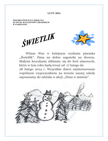 LUTY 2014 PISEMKO ŚWIETLICY SZKOLNEJ SP 109 IM. BATALIONÓW CHŁOPSKICH W WARSZAWIE Witam Was w kolejnym wydaniu pisemka ,,Świetlik”. Zima na dobre zagościła na dworze. Małymi kroczkami zbliżamy się do ferii zimowych, które w tym roku będą trwać od 17 lutego do 28 lutego 2014 r. Wszystkie dzieci zainteresowane wspólnym wypoczynkiem na terenie naszej szkoły zapraszamy do udziału w akcji ,,Zima w mieście”. WAŻNE DATY W LUTYM 8 luty- Dzień Bezpiecznego Internetu 9 luty- Międzynarodowy Dzień Pizzy 12 lutego – Bal Karnawałowy w naszej szkole: Klasy 0- 1 godz. 9.00 – 11.00 Klasy 2 -3 godz. 12.00 – 14.00 14 luty - Dzień Zakochanych, Walentynki 17 luty - Dzień Kota 17-28 luty - Ferie zimowe 27 luty - Tłusty czwartek 14 lutego Święto Zakochanych Walentynki (ang. Valentine's Day) – coroczne święto zakochanych przypadające 14 lutego. Nazwa pochodzi od św. Walentego, którego wspomnienie liturgiczne w Kościele katolickim obchodzone jest również tego dnia. Zwyczajem w tym dniu jest wysyłanie listów zawierających wyznania miłosne (często pisane wierszem). Na Zachodzie, zwłaszcza w Wielkiej Brytanii i Stanach Zjednoczonych, czczono św. Walentego jako patrona zakochanych. Dzień 14 lutego stał się więc okazją do obdarowywania się drobnymi upominkami. Historia święta Walentynki są obchodzone w południowej i zachodniej Europie od średniowiecza. Europa północna i wschodnia dołączyła do walentynkowego grona znacznie później. Pomimo katolickiego patrona tego święta, czasem wiązane jest ono ze zbieżnym terminowo zwyczajem pochodzącym z Cesarstwa Rzymskiego polegającym głównie na poszukiwaniu wybranki serca, np. przez losowanie jej imienia ze specjalnej urny. Współczesny dzień zakochanych nie ma jednak bezpośredniego związku z jednym konkretnym świętem starożytnego Rzymu, choć jest kojarzony z takimi postaciami z mitologii jak Kupidyn, Eros Panczy, Juno Februata. Możliwe, że zwyczaje związane z tym dniem nawiązują do starożytnego święta rzymskiego, zwanego Luperkaliami, obchodzonego 14-15 lutego ku czci Junony, rzymskiej bogini kobiet i małżeństwa, oraz Pana, boga przyrody. Z kolei Brytyjczycy uważają to święto za własne z uwagi na fakt, że rozsławił je na cały świat sir Walter Scott żyjący w XVIII wieku. Walentynki w Polsce Do Polski obchody walentynkowe trafiły w latach 90. XX wieku z kultury francuskiej i krajów anglosaskich, a także wraz z kultem świętego Walentego z Bawarii i Tyrolu. Święto to konkuruje o miano tzw. święta zakochanych z rodzimym świętem słowiańskim zwanym potocznie Nocą Kupały lub Sobótką, obchodzonym w nocy z dnia 21 na 22 czerwca. Zwyczaje Stałym niemalże elementem walentynek jest wzajemnie wręczanie sobie walentynkowych ozdobnych karteczek. Czerwone, najczęściej w kształcie serca, opatrzone walentynkowym wierszykiem, a często i miłosnym wyznaniem. Ze świętem łączy się również zwyczaj obdarowywania partnera walentynkowymi upominkami w postaci kwiatów, słodyczy, pluszowych maskotek. Walentynki w naszej świetlicy Wykonaj kartkę swojej Walentynce! W dniach 3 – 13 luty zbieramy w sali nr 114 walentynkową pocztę. Przygotuj kartę dla koleżanki, kolegi, kogoś kogo bardzo lubisz, podpisz kopertę (imię i nazwisko, klasa) i przynieś. Pomocnicy Amorka wręczą kartki 14 lutego Zapraszamy do zabawy Świetlica klas III z wychowawcami 27 lutego Tłusty Czwartek. Tłusty czwartek to staropolski zwyczaj i tradycja pieczenia i zjadania pączków i faworków (zwanych też chrustami). Tłusty czwartek rozpoczyna ostatni tydzień karnawału i jest świętem zwyczajowym. W Polsce w tłusty czwartek prawie wszyscy pochłaniają duże ilości pączków z nadzieniem różanym (i nie tylko). Według jednego z przesądów, jeśli ktoś w tłusty czwartek nie zje ani jednego pączka, to w dalszej części roku nie będzie mu się wiodło. Zaraz po Tłustym Czwartku czeka nas 40-dniowy post. Ferie zimowe to dla dzieci i młodzieży wymarzony czas zabaw na śniegu i lodzie. Aby jednak przebiegły one szczęśliwie i wszyscy wypoczęci wrócili do swych domów, należy pamiętać o podstawowych zasadach bezpieczeństwa, obowiązujących tak podczas zorganizowanych wyjazdów zimowych, jak zamieszkania. i spędzania tego czasu w miejscu Zabawa na śniegu, zjazdy z górki, jazda na nartach czy łyżwach oraz inne szaleństwa na śniegu mogą sprawić wiele radości i wzmocnić naszą kondycję fizyczną. Pamiętaj jednak, że podstawą, jak zwykle, jest zdrowy rozsądek i ostrożność! Wychodząc bawić się na powietrze, ubieraj się stosownie do pogody, tak, aby nadmiernie nie wychłodzić swojego organizmu. Idąc na górkę, czy dłuższy spacer w zimowej aurze warto się zaopatrzyć w ciepły napój w termosie. Do zabaw na śniegu, zjazdów na sankach wybieraj miejsca bezpieczne, z dala od ruchliwych ulic, skrzyżowań i ciągów komunikacyjnych. Pamiętaj, że zimą znacznie wydłuża się droga hamowania pojazdów, więc zachowaj szczególną ostrożność będąc w pobliżu jezdni; Najlepiej przed rozpoczęciem zabawy na górce obejrzyj trasę zjazdu, usuń z niej niebezpieczne przedmioty, takie jak kamienie, gałęzie drzew; Dostosuj się do kierunku ruchu obowiązującego na trasie zjazdu, nie przechodź w poprzek toru; Ważny dla Twojego bezpieczeństwa jest też stan techniczny sanek, czy innych przedmiotów, na których zjeżdżasz. Złamane szczebelki, wystające śruby lub gwoździe to poważne ryzyko wyrządzenia sobie krzywdy; Nie ślizgaj się na chodnikach i przejściach dla pieszych, gdyż wyślizgana nawierzchnia stanowi ryzyko złamań kończyn dla innych osób; Pamiętaj, że zagrożenie dla zdrowia, a nawet Twojego życia, stanowią zwisające z balkonów i dachów masywne sople lodu. W takim przypadku zrezygnuj z zabawy w tym miejscu, powiadom o sytuacji osoby dorosłe lub Straż Pożarną, która usunie niebezpieczeństwo; Nie rzucaj w jadąc