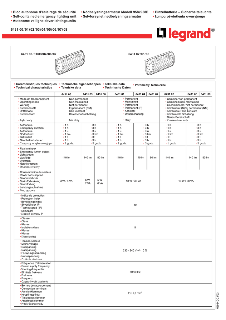 • Bloc autonome d’éclairage de sécurité • Self-contained emergency lighting unit • Autonome veiligheidsverlichtingsunits • Nödbelysnıngsarmatur Modell 958 / 958E • Selvforsynet nødbelysningsarmatur • Einzelbatterie – Sicherheitsleuchte • Lampa oświetlenia awaryjnego 6431 00 / 01 / 02 / 03 / 04 / 05 / 06 / 07 / 08 6431 00 / 01/ 03 / 04 / 06 / 07 6431 02 / 05 / 08 • Caractéristiques techniques • Technische eigenschappen • Tekniske data • Parametry techniczne • Technical characteristics • Tekniske data • Technische Daten • Tryb pracy 6431 03 6431 06 6431 04 •1h •1h •1u • 1 tim •1t •1h • 1 godz. • Flux lumineux • Emergency lumen output • Lichtstroom • Ljusflöde • Lysstrøm • Nennlichtstrom • Strumień świetlny 140 lm 140 lm 80 lm 3 W / 4 VA 6W 7 VA 5W 6 VA •3h •3h •3u • 3 tim •3t •3h • 3 godz. 140 lm 140 lm 18 W / 38 VA 40 • Classe • Class • Klasse • Isolationsklass • Klasse • Klasse • Klasa izolacji II • Fréquence d’alimentation • Power supply frequency • Voedingsfrequentie • Elnätets frekvens • Frekvens • Frequenz • Częstotliwość zasilania • Bornes de raccordement • Connection terminals • Aansluitklemmen • Kopplingsplintar • Tilslutningsklemmer • Anschlussklemmen • Przekrój przewodu 6431 02 6431 05 6431 08 • Combiné /non-permanent • Combined / non-maintained • Gecombineerd / niet permanent • Kombinerat (S) / ej permanent (NM) • Kombineret /ikke konstant • Kombinierte Schaltung Dauer /Bereitschaft • 2 razem/nie stały •3h •3h •3u • 3 tim •3t •3h • 3 godz. •1h •1h •1u • 1 tim •1t •1h • 1 godz. • Indice de protection • Protection index • Beveiligingsindex • Skyddsindex IP • Tæthedsgrad (IP) • Schutzart • Stopień ochrony IP • Tension secteur • Mains voltage • Netspanning • Nätspänning • Forsyningsspænding • Nennspannung • Zasilanie sieciowe 6431 07 • Stały • Nie stały • Autonomie • Emergency duration • Autonomie • Nöddriftstid • Batteridrift • Nennbetriebsdauer • Czas pracy w trybie awaryjnym • Consommation du secteur • Power consumption • Stroomverbruik • Strömförbrukning • Strømforbrug • Leistungsaufnahme • Moc oprawy 6431 01 • Permanent • Maintained • Permanent • Permanent (P) • Konstant • Dauerschaltung • Non-permanent • Non-maintained • Niet permanent • Ej permanent (NM) • Ikke konstant • Bereitschaftsschaltung 80 lm •3h •3h •3u • 3 tim •3t •3h • 3 godz. •1h •1h •1u • 1 tim •1t •1h • 1 godz. 140 lm 140 lm 80 lm 18 W / 38 VA 230 - 240 V +/- 10 % 50/60 Hz 2 x 1,5 mm2 N0064CC3/03 6431 00 • Mode de fonctionnement • Operating mode • Werking • Funktionssätt • Driftsmåde • Funktionsart • Fixation • Fixing • Montage • Montering • Opsætning • Befestigung • Montaż • Vis Ø 3 mm non fournies • Ø 3 mm screws not supplied • Schroeven Ø 3 mm niet meegeleverd • 3 mm Ø skruv ingår ej • Ø3 mm skruer, medleveres ikke • Schrauben Ø 3 mm, nicht im Lieferumfang • Śruby Ø 3 mm nie są dostarczane z lampą • IMPORTANT : La surface d’appui doit être supérieure à la surface du bloc. Maintenir un espace libre de 4 cm au-dessus de la préplaque. • IMPORTANT: The mating surface must be larger than the emergency lighting unit surface. Maintain a space of 4 cm above the plug-in plate. • BELANGRIJK : De montagesteun moet hoger zijn dan het oppervlak van de unit. Hou 4 cm vrije ruimte over boven het voorplaatje. • VIKTIGT!:Monteringsytan måste vara större än armaturens yta. Låt ett utrymme om 4 cm vara fritt ovanför locket. • VIGTIGT: Understøttelsesfladen skal være større end blokkens flademål. Der skal være 4 cm fri over forpladen. • WICHTIG : Die Montagefläche muss größer als die Fläche der Leuchte sein. Berücksichtigen Sie einen Abstand von 4 cm oberhalb des Montagesockels. • WAŻNE: Powierzchnia, do której ma być przymocowana lampa, musi być większa niż lampa. Zostawić 4 cm powyżej podstawy mocującej. • Raccordement • Connection • Aansluiting • Anslutning • Tilslutning • Anschluß • Podłączenie 6431 00/03/06 6431 01/02/04/05/07/08 N L N L L' SW L 230 / 240 V N 230 / 240 V • Pour les blocs permanent et combiné l'interrupteur Sw permet de commander l'allumage du tube permanent à partir d'une deuxième phase L'. • For maintained and combined luminaires, the switch Sw can be used to illuminate the maintained tube from a second L' phase. • Voor de permanente en gecombineerde blokken laat de schakelaar Sw de ontsteking van de permanente lamp toe vanaf een tweede fase L’. • För kombinationsenheterna (S1) gör SW-brytaren att lysrörsbelysningen kan styras från en andra L-fas. • På kombinationsarmaturerne kan SW-kontakten styre tændingen af hovedrøret fra en alternativ fase L'. • Für die Leuchten in Dauerschaltung bzw. in kombinierter Schaltungsart kann man mit einem Schalter ( SW ) durch zuführen einer zweiten Phase L´ das Leuchtmittel zusätzlich schalten • Lampy stale świecące i z dwoma świetlówkami podłączać przez wyłącznik SW. Pozwala to na wyłączanie drugiej świetlówki, która nie pracuje w trybie awaryjnym. 2 • Mise en service • Driftsättning • Commissioning • Opstart • Ingebruikname • Inbetriebnahme • Załączenie lampy • Mettre sous tension. Vérifier que le témoin de charge (LED) est allumé. Laisser le bloc se charger environ 1 heure pour assurer une charge partielle de la batterie. Appuyer sur le bouton-poussoir situé sur la patère pour simuler une coupure d’alimentation. Le témoin de charge s’éteint et la source lumineuse fonctionne en mode secours. Le bloc fonctionne correctement après une charge de 24 heures (le bloc est livré avec une batterie déchargée). • Switch on. Check that the charging indicator (LED) is lit. Leave the unit to 