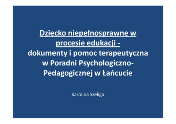 Dziecko niepełnosprawne w procesie edukacji dokumenty i pomoc terapeutyczna w Poradni PsychologicznoPedagogicznej w Łańcucie Karolina Szeliga Regulacje prawne uczenia się dzieci ze specjalnymi potrzebami Rozporządzenie Ministra Edukacji Narodowej z dnia 2 sierpnia 2013 r. w sprawie warunków organizowania kształcenia , wychowania i opieki dla dzieci i młodzieży niepełnosprawnych oraz niedostosowanych społecznie w specjalnych przedszkolach, szkołach i oddziałach oraz w ośrodkach Rozporządzenie Ministra Edukacji Narodowej z dnia 2 sierpnia 2013 r. rozporządzenie w sprawie warunków organizowania kształcenia , wychowania i opieki dla dzieci i młodzieży niepełnosprawnych oraz niedostosowanych społecznie w przedszkolach, szkołach i oddziałach ogólnodostępnych lub integracyjnych • Rozporządzenie Ministra Edukacji Narodowej z dnia 11 października 2013 r. w sprawie organizowania wczesnego wspomagania rozwoju dzieci, • Rozporządzenie Ministra Edukacji Narodowej z dnia 23 kwietnia 2013 r. w sprawie warunków i sposobu organizowania zajęć rewalidacyjnowychowawczych dla dzieci i młodzieży z upośledzeniem umysłowym w stopniu głębokim Rozporządzenie Ministra Edukacji Narodowej z dnia 1 lutego 2013 r. w sprawie szczegółowych zasad działania publicznych poradni psychologicznopedagogicznych, w tym publicznych poradni specjalistycznych Rozporządzenie MEN z dnia 18 września 2008 r. w sprawie orzeczeń i opinii wydawanych przez zespoły orzekające działające w publicznych poradniach psychologiczno – pedagogicznych Do zadań poradni należy: 1)diagnozowanie dzieci i młodzieży; 2)udzielanie dzieciom i młodzieży oraz rodzicom bezpośredniej pomocy psychologiczno-pedagogicznej; 3)realizowanie zadań profilaktycznych oraz wspierających wychowawczą i edukacyjną funkcję przedszkola, szkoły i placówki, w tym wspieranie nauczycieli w rozwiązywaniu problemów dydaktycznych i wychowawczych; 4)organizowanie i prowadzenie wspomagania przedszkoli, szkół i placówek w zakresie realizacji zadań dydaktycznych, wychowawczych i opiekuńczych. §3.1.Diagnozowanie dzieci i młodzieży jest prowadzone w szczególności w celu określenia indywidualnych potrzeb rozwojowych i edukacyjnych oraz indywidualnych możliwości psychofizycznych dzieci i młodzieży, wyjaśnienia mechanizmów ich funkcjonowania w odniesieniu do zgłaszanego problemu oraz wskazania sposobu rozwiązania tego problemu. § 3.2.Efektem diagnozowania dzieci i młodzieży jest w szczególności: 1)wydanie opinii; 2)wydanie orzeczenia o potrzebie: kształcenia specjalnego, zajęć rewalidacyjno-wychowawczych, indywidualnego obowiązkowego rocznego przygotowania przedszkolnego lub indywidualnego nauczania dzieci i młodzieży; opinii o wczesnym wspomaganiu rozwoju, 3)objęcie dzieci i młodzieży albo dzieci i młodzieży oraz rodziców bezpośrednią pomocą psychologiczno-pedagogiczną; 4)wspomaganie nauczycieli w zakresie pracy z dziećmi i młodzieżą oraz rodzicami. • Kształcenie specjalne organizuje się dla dzieci i młodzieży z zaburzeniami i/lub odchyleniami rozwojowymi, wymagających stosowania specjalnych metod i form pracy oraz organizacji nauki • Zespoły Orzekające poradni wydają orzeczenia na podstawie zgromadzonych specjalistycznych diagnoz, badania pediatrycznego i na wniosek rodziców/opiekunów prawnych. Kształcenie specjalne dla dzieci i młodzieży niepełnosprawnej: 1) niesłyszących, 2) słabosłyszących, 3) niewidomych, 4) słabowidzących, 5) z niepełnosprawnością ruchową, w tym z afazją, 6) z upośledzeniem umysłowym w stopniu lekkim, 7) z upośledzeniem umysłowym w stopniu umiarkowanym lub znacznym, 8)z autyzmem, w tym z zespołem Aspergera, 9)z niepełnosprawnościami sprzężonymi Dzieci z upośledzeniem w stopniu głębokim są kwalifikowane do zajęć rewalidacyjno-wychowawczych grupowych lub indywidualnych Orzeczenie to dla opiekunów możliwości wyboru miejsca kształcenia dziecka niepełnosprawnego na każdym etapie edukacji. Posiadanie orzeczenie daje możliwość nauki dziecka niepełnosprawnego w: - przedszkolu czy szkole ogólnodostępnej - szkole ogólnodostępnej z oddziałem integracyjnym - przedszkolu specjalnym, szkole specjalnej - przedszkolu i szkole integracyjnej - oddziale specjalnym w przedszkolach i szkołach ogólnodostępnych, • W szkolnym planie nauczania należy uwzględniać dodatkowe zajęcia dla uczniów niepełnosprawnych zajęcia rewalidacyjne ( co najmniej 2 godz. tygodniowo) • Rodzaj zajęć, a także forma ich realizacji powinna odpowiadać indywidualnym potrzebom rozwojowym i edukacyjnym ucznia. • Zajęcia rewalidacyjne realizuje specjalista np. oligofrenopedagog, tyflopedagog, surdopedagog, rehabilitant. • Przedszkoli specjalnych i oddziałów specjalnych w przedszkolach ogólnodostępnych nie organizuje się dla dzieci upośledzonych w stopniu lekkim • Szkoły specjalne przysposabiające do pracy organizuje się dla młodzieży z upośledzeniem umysłowym w stopniu umiarkowanym lub znacznym lub z niepełnosprawnościami sprzężonymi • Obowiązkiem gminy jest zapewnienie uczniom niepełnosprawnym, bezpłatnego transportu i opieki w czasie przewozu do najbliższej szkoły podstawowej, gimnazjum lub ośrodka umożliwiającego realizację obowiązku szkolnego i obowiązku nauki dzieciom i młodzieży, a także dzieciom i młodzieży z upośledzeniem umysłowym ze sprzężonymi niepełnosprawnościami albo zwrot kosztów przejazdu ucznia i opiekuna środkami komunikacji publicznej, jeżeli dowożenie zapewniają rodzice. Dla dzieci i młodzieży z trudnościami zdrowotnymi i poznawczymi, nie spełniającymi kryterium orzekania możliwe jest wydawanie opinii o dostosowaniu form i metod pracy do indwidulanych możliwości dziecka, ze względu na m.in.: - chorobę przewlekłą, - obniżony rozwój umysłowy, Formy pomocy terapeutycznej w Poradni Psychologiczno-Pedagogicznej w Łańcucie terapia logopedyczna, terap