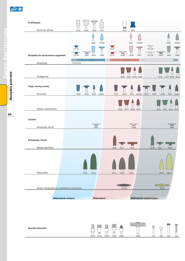 Gumki do szkliwa 9553 9555 9556 9557 9400 9631 Narzędzia do opracowania wypełnień Kompozyty CC1M 9672 9401 9436C CC1M Narzędzia polerskie ZABIEGI DENTYSTYCZNE Profilaktyka 9436M CC1F 9687 9403 9406 CC1F 9402 9436F 9405 9408 CC1UF 9688 9404 9407 9689 CC1UF CS 20/40 Amalgamaty 9606 9607 9608 9609 9616 9617 9618 9619 Inlaje, korony, mosty Porcelana 9420 9422 9418 9421 9439C Metale nieszlachetne 9423 9606 9419 9439M 9545 9652 9683 9616 9607 9608 9609 9547 9439F 9617 9618 9619 60 Licówki Kompozyty, akryle 9687 9688 9689 Kompozyty, akryle Metale szlachetne Płyty protez 9432 9603 9610 9611 9424 9642 Akryle i kompozyty na uzupełnienia tymczasowe Polerowanie wstępne 9612 9620 9621 9641 9433 9515M 9622 9644 9515F Polerowanie wykańczające Polerowanie Szczotki polerskie 9654 9645 9684 9685 9686 9628 310 309 303 327 CC1M CC1F CC1UF Rozmiar Ø 1/10 mm CC 1 M.900. … 80 80 80 090 090 090 090 CC 1 F.900. … 090 CC 1 UF.900. … min Narzędzia polerskie max. 16 000 090 –1 CompoClips - Montowane krążki do mandrylki 310.204 Nowość CC1M CC1F CC1UF Rozmiar Ø 1/10 mm 80 80 80 130 130 130 61 CC 1 M.900. … 130 CC 1 F.900. … 130 CC 1 UF.900. … max. 16 000 min 130 –1 CompoClips - Montowane krążki do mandrylki 310.204 Zalety: skuteczne polerowanie kompozytu skrócenie czasu pracy przy polerowaniu od 2 do 20 sek. optymalna prędkość obrotowa - 10 tys. obr./min. doskonale współpracują z narzędziami polerskimi serii Q ze str. 14. CompoSystem jest uniwersalną i doskonałą metodą polerowania kompozytów. Giętkie krążki umożliwiają polerowanie wszystkich powierzchni zębów. Paski natomiast są perfekcyjne do opracowywania nadmiarów kompozytów w przestrzeniach międzyzębowych. Wszystkie elementy systemu oprócz mandrylek są jednorazowe, nie podlegają sterylizacji. Rozmieszczenie ścierniwa na krążkach i paskach nie jest równomierne a konglomeraty przypominają plaster pszczeli co ułatwia pracę poprzez uniemożliwienie zapychania się ściernic. L1 Nowość CS 20 CS 40 80 Grubość ziarna 50 µm 30 µm 5 µm Grubość paska 0,13 0,11 0,08 Szerokość, długość 2 (CS 20) / 4 (CS 40) Długość części roboczej 205 L1 mm 55 CS20 • CS40 • CompoStrips, Patent GM 20 2004 019 490 ZABIEGI DENTYSTYCZNE Nowość L 9606 L 9607 9608 10 Rozmiar Ø 1/10 mm L mm 10 060 Rozmiar 9,0 L mm Kątnica Narzędzia polerskie ZABIEGI DENTYSTYCZNE L Ø 1/10 mm 10 090 Rozmiar 8,0 L mm Kątnica 653 204 030513 … 9606.204. … max. 40 000 6,0 653 204 243513 … 9607.204. … min 030 Kątnica 653 204 030513 … 060 Ø 1/10 mm 9608.204. … 090 max. 25 000 –1 min 030 –1 Turbina 653 314 243513 … 9608.314. … 030 = = max. 40 000 min–1 min–1 max. 120 000 L L 62 9609 9616 Gumki polerskie o dużej efektywności 10 Rozmiar Ø 1/10 mm L mm przeznaczone do polerowania amalgamatu, metali szlachetnych i metali nieszlachetnych. Zalecana prędkość obrotowa 6 tys. obrotów na min Gumki zielone do wstępnego polerowania amalgamatu Gumki brązowe do ostatecznego polerowania amalgamatu i metali protetycznych. 045 10,0 Kątnica 653 204 243513 … 9609.204. … 045 max. 40 000 9617 653 204 030503 … 9616.204. … 8,0 L mm Ø 1/10 mm Rozmiar 6,0 L mm 045 10,0 653 204 243503 … 9618.204. … min–1 Ø 1/10 mm Kątnica 653 204 243503 … 090 min–1 10 030 Kątnica 653 204 030503 … 060 9619 10 Rozmiar max. 25 000 Kątnica L 090 Kątnica 9617.204. … 9,0 L 10 L mm L mm 060 max. 40 000 9618 Ø 1/10 mm Ø 1/10 mm min–1 L Rozmiar 10 Rozmiar 030 9619.204. … 045 max. 40 000 Turbina 658 314 243503 … 9618.314. … 030 = = max. 40 000 min–1 min–1 max. 120 000 min–1 9555 9557 Gumki szare przeznaczone do nabłyszczania szkliwa z możliwością użycia pasty polerskiej. 10 Rozmiar Zalecana prędkość obrotowa 6 tys. obrotów na min. L mm Zostały w Polsce zaadoptowane do polerowania kompozytów i stały się jednymi z najpopularniejszych gumek na rynku. Kątnica Ø 1/10 mm 10 100 Rozmiar 8,0 L mm Ø 1/10 mm 060 15,0 Kątnica 658 204 030523 … 9555.204. … 658 204 243523 … 9557.204. … 100 max. 10 000 min 060 max. 10 000 –1 min–1 Narzędzia polerskie L 63 9553 9556 10 Rozmiar Ø 1/10 mm 10 110 Rozmiar Ø 1/10 mm L mm Kątnica 060 10,0 Kątnica 658 204 304523 … 9556.204. … 658 204 034523 … 9553.204. … 110 max. 20 000 min 060 max. 40 000 –1 min–1 L 9631 9672 Gumki polerskie do usuwania osadów nazębnych przy wykorzystaniu past polerskich. Zalecana prędkość obrotowa 6 tys. obrotów na min 10 Rozmiar Ø 1/10 mm L mm 060 10 Rozmiar Ø 1/10 mm 060 8,0 Kątnica 653 204 034000 … 9631.204. … max. 40 000 min –1 060 9672.000. … max. 10 000 min 060 –1 Gumka do montowania na mandrylce 309.204 ZABIEGI DENTYSTYCZNE L L Rozmiar 310 Ø 1/10 mm L mm 5 5 5 140 140 140 0,2 0,2 0,2 Kątnica 330 204 608000 … 310.204. … Mandrylka o średnicy 1,8 mm max. 30 000 9687.900. … • min–1 Mandrylka do krążków 140 Patent niemiecki DE 197 11 912 Narzędzia polerskie ZABIEGI DENTYSTYCZNE 9687 9688 9689 64 9688.900. … 140 9689.900. … 140 Krążki ścierne montowane na mandrylkę 310.204 max. 10 000 min–1 Kształt zastrzeżony DE 298 18 265 Oczekuje na patent europejski WO 00/21 453 L 9400 9401 9402 Rozmiar Do polerowania wstępnego niebieski, do polerowania różowy, do polerowania wykańczającego szary Ø 1/10 mm L mm 5 5 5 030 030 030 7,0 7,0 7,0 Kątnica Kątnica 9400.204. … 030 9401.204. … 4312 A.204 030 9402.204. … 030 max. 40 000 min–1 L 9403 9404 9405 Rozmiar DIACOMP II Zestaw gumek do kompozytu Ø 1/10 mm L mm 5 5 5 055 055 055 8,0 8,0 8,0 Kątnica 9406 9407 9408 Rozmiar Ø 1/10 mm 5 5 5 100 100 100 Gumki ze ścierniwem diamentowym Przeznaczone do wstępnego i końcowego opracowania wypełnień z kompozytów, kompomerów i glass-jonomerów. Intensywnie chłodzić wodą. Kątnica Rekomendowana prędkość - 6 tys. obrotów na min. 9403.204. … 9404.204. … 9405.204. … 9406.204. … 055 9407.204. … 055 055 max. 40 000 min –1 9408.204. … 100 100 100 ma