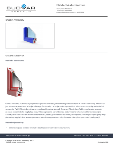 Nakładki aluminiowe Asortyment: Akcesoria Technologia: Akcesoria Data pobrania karty produktu: 2017.03.08 GALERIA PRODUKTU CHARAKTERYSTYKA Nakładki aluminiowe Okna z nakładką aluminiową to jedna z najnowocześniejszych technologii stosowanych w stolarce okiennej. Metoda ta jest niezwykle popularna w krajach Europy Zachodniej i w krajach skandynawskich. Ma ona na celu połączenie dwóch surowców PVC i Aluminium lub w przypadku okien drewnianych Drewna i Aluminium. Takie rozwiązanie sprawia, że nasze okna nie tylko wyglądają niezwykle oryginalnie, ale także mają podwyższone właściwości termoizolacyjne i akustyczne. Nakładka aluminiowa montowana jest na gotowe okno od strony zewnętrznej. Wewnątrz uzyskujemy więc pierwotny wygląd okna, a zewnątrz mamy aluminiową powierzchnię niezwykle łatwą do czyszczenia i pielęgnacji. Najważniejsze zalety: zmiana wyglądu okna od zewnątrz dzięki zastosowaniu dwóch surowców http://www.budvarcentrum.pl/ C opyright by Budvar C entrum Sp. z o.o. Wszelkie prawa zastrzeżone Infolinia: 801 404 801 +48 601 908 908 Realizacja: FEB zwiększona grubość ścianek profila dzięki zastosowaniu nakładki aluminiowej oraz użycie solidnych metalowych narożników powoduje większą sztywność okna nakładka aluminiowa pozwala na renowację zamontowanych już okien bez konieczności ich wymiany dzięki nakładkom aluminiowym okno ma podwyższoną wytrzymałość na działanie czynników atmosferycznych PARAMETRY http://www.budvarcentrum.pl/ C opyright by Budvar C entrum Sp. z o.o. Wszelkie prawa zastrzeżone Infolinia: 801 404 801 +48 601 908 908 Realizacja: FEB