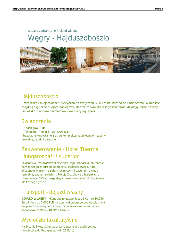 http://www.juventur.com.pl/index.php?d=szczegoly&id=311 Page 1 wczasy zagraniczne /dojazd własny Węgry - Hajduszoboszlo Hajduszoboszlo Uzdrowisko i miejscowość turystyczna na Węgrzech, 200 km na wschód od Budapesztu. W mieście znajdują się liczne miejsca noclegowe, dobrze rozwinięta jest gastronomia, działają liczne baseny i kąpieliska z wodami termalnymi oraz kryty aquapark. Świadczenia - 7 noclegów (8 dni) - 7 śniadań i 7 kolacji - stół szwedzki - bezpłatne korzystanie z usług kompleksu kąpielowego - baseny termalne, leżaki i parasole Zakwaterowanie - Hotel Thermal Hungarospa*** superior Położony w uzdrowiskowej dzielnicy Hajduszoboszlo, na terenie największego w Europie kompleksu kąpieliskowego, hotel dysponuje własnym działem leczniczym i basenami z wodą termalną, sauną i solarium. Pokoje 2-osobowe z łazienkami, klimatyzacja, TVSat, bezpłatny internet oraz szlafroki kąpielowe dla każdego gościa. Transport - dojazd własny DOJAZD WŁASNY - klient ubezpieczony jest od KL - do 10.000 Euro i NW - do 7.000 PLN na czas wykupionego pobytu plus dwa dni przed rozpoczęciem i dwa dni po zakończeniu imprezy dodatkowa zapłata - 40 zł/os./turnus. Wycieczki fakultatywne Na życznie i koszt klienta, organizowane w trakcie pobytu: - wycieczka do Budapesztu (ok. 26 Euro) http://www.juventur.com.pl/index.php?d=szczegoly&id=311 Page 2 - wycieczka do Egeru (ok. 26 Euro) - wycieczka do Debreczyna i Hortobagy (ok. 22 Euro) - wieczór węgierski (ok. 20 Euro) nr grupy termin 1 miejsce w pokoju 2-os. dopłata do jedynki WGW-01/14 04.01-15.03.14 1 490,- 350,- ZAREZERWUJ WGW-02/14 15.03-07.06.14 1 690,- 420,- ZAREZERWUJ WGW-03/14 07.06-13.09.14 1 890,- 550,- ZAREZERWUJ WGW-04/14 13.09-01.11.14 1 690,- 420,- ZAREZERWUJ WGW-05/14 01.11-20.12.14 1 490,- 350,- ZAREZERWUJ WGW-06/14 20.12-03.01.15 1 890,- 550,- ZAREZERWUJ Pobyty tygodniowe w układzie sobota - sobota. 1. Cena nie zawiera kosztu wstępu do zwiedzanych obiektów. 2. Dla osób powyżej 18 lat - opłata klimatyczna, płatna na miejscu - 450 Forintów/dzień (ok. 1,60 Euro/os./dzień). 3. Możliwość wykupienia pakietów leczniczych - płatne na miejscu.