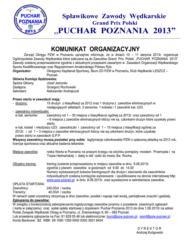 Spławikowe Zawody Wędkarskie Grand Prix Polski „PUCHAR POZNANIA 2013” KOMUNIKAT ORGANIZACYJNY Zarząd Okręgu PZW w Poznaniu uprzejmie informuje, że w dniach 10 – 11 sierpnia 2013r. organizuje Ogólnopolskie Zawody Wędkarskie które zaliczane są do Zawodów Grand Prix Polski „PUCHAR POZNANIA 2013” Zawody zostaną przeprowadzone zgodnie z aktualnymi przepisami zawartymi w Zasadach Organizacji Wędkarskiego Sportu Kwalifikowanego oraz Regulaminem Amatorskiego Połowu Ryb. Organizator: Okręgowy Kapitanat Sportowy, Biuro ZO PZW w Poznaniu, Klub Wędkarski LESZCZ – Poznań. Główna Komisja Sędziowska: Sędzia Główny Józef Jeziorski Zastępca Grzegorz Rochowski Sekretarz Aleksander Andrejczuk Prawo startu w zawodach mają: - drużyny: 15 drużyn z klasyfikacji za 2012 oraz 1 drużyna z zawodów eliminacyjnych w następujących składach: 3 seniorów, 1 kobieta i 1 zawodnik kat. U23. - zawodnicy indywidualni: w kat. seniorów: zawodnicy od 1 – 30 miejsca z klasyfikacvji ogólnej za 2012r. oraz zawodnicy od 1 – 6 miejsca z zawodów eliminacyjnych którzy nie są członkami drużyn które uzyskały prawo startu. w kat. kobiet i młodzieży U23: zawodniczki i zawodnicy od 1 – 10 miejsca z klasyfikacji ogólnej za 2012r. i od 1 – 3 miejsca z zawodów eliminacyjnych którzy nie są członkami drużyn, które uzyskały prawo startu w zawodach G.P.P. Wszyscy zawodnicy muszą posiadać przy sobie: legitymacje członkowskie PZW z opłaconą składką na 2013 rok, licencje sportowca oraz aktualne badania lekarskie. Miejsce zawodów: rzeka Warta w Poznaniu na prawym brzegu na odcinku pomiędzy: mostem Przemysła I na Trasie Hetmańskiej i dalej w dół rzeki do mostu Św. Rocha. Oficjalny trening: trening zostanie przeprowadzony w miejscu zawodów w dniu 9.08.2013r. zgodnie z planem zawodów w godzinach od 9.50 do 14.00 Numery wylosowanych boksów treningowych dla drużyn i stanowisk dla zawodników indywidualnych zostaną komisyjnie wylosowane i opublikowane na stronie internetowej http: www.pzw.poznan.pl w dniu 8.08.2013r. oraz wywieszone w sekretariacie zawodów. OPŁATA STARTOWA: Zawodnicy: 240,00zł / osoba Trenerzy: 40,00zł / osoba W ramach opłat uczestnicy otrzymują w dniu zawodów: posiłek i napoje nad wodą, pamiątkowe znaczki i gadżety. Zgłoszenia do zawodów: W związku z koniecznością zabezpieczenia logistycznego zawodów prosimy o przesłanie pisemnych zgłoszeń ( karta w załączeniu) oraz wpłat opłaty startowej z dopiskiem: Puchar Poznania 2013 do dnia 1.08.2013r na adres: Polski Związek Wędkarski Okręg w Poznaniu, ul. Znanieckiego 9, 60 – 682 Poznań Lub przesłania zgłoszenia na Fax: 61 829 05 46 lub elektronicznie: [email protected], [email protected] Konto Bankowe: BZ WBK 69 1090 1359 0000 0000 3501 8454 DYREKTOR Andrzej Kuligowski PLAN ZAWODÓW 9.08.2013r. (piątek) 8.00 8.00 9.50 – 14.00 15.00 – 15.30 16.00 Otwarcie Sekretariatu i Biura zawodów ( namiot przy moście Kr. Jadwigi ) Wejście na stanowiska i przygotowanie do treningu Oficjalny trening - obowiązkowy 9.50 pierwszy sygnał – wolno nęcić 14.00 drugi sygnał – koniec treningu Uroczyste otwarcie zawodów ( obecność wszystkich uczestników obowiązkowa) Odprawa techniczna z trenerami i kierownikami ekip (namiot) 10.08.2013r. (sobota) 7.00 8.00 8.15 9.50 10.00 13.55 14.00 14.00 – 14.45 15.00 Zbiórka zawodników na sektorach Losowanie stanowisk Wejście na stanowiska (pierwszy sygnał) Kontrola zanęt (drugi sygnał na 5 min. Przek kontrolą) Nęcenie zanętą ciężką (trzeci sygnał) Rozpoczęcie łowienia (czwarty sygnał) (piaty stgnał na 5 minut przed zakończeniem łowienia) Koniec łowienia ( szósty sygnał) Ważenie ryb Posiłek Ogłoszenie wyników I tury zawodów 11.08.2013r (niedziela) 6.00 7.00 7.15 8.50 9.00 12.55 13.00 13.00 – 13.45 14.00 14.30 15.40 Zbiórka zawodników na sektorach Losowanie stanowisk Wejście na stanowiska (pierwszy sygnał) Kontrola zanęt (drugi sygnał na 5 min. Przek kontrolą) Nęcenie zanętą ciężką (trzeci sygnał) Rozpoczęcie łowienia (czwarty sygnał) (piaty stgnał na 5 minut przed zakończeniem łowienia) Koniec łowienia ( szósty sygnał) Ważenie ryb Posiłek Ogłoszenie wyników II tury zawodów Ogłoszenie oficjalnych wyników zawodów „Puchar Poznania 2013” Uroczyste zakończenie zawodów (obecność wszystkich uczestników obowiązkowa) dekoracja zwycięzców: wręczenie pucharów, dyplomów i upominków …………………………………. data ………………………………. Pieczęć Okręgu PZW KARTA ZGŁOSZENIA Polski Związek Wędkarski Okręg PZW w ……………………………. zgłasza udział zawodników : ……………………………………………………………………………………………………………… (pełna nazwa Klubu) OGÓLNOPOLSKIE SPŁAWIKOWE ZAWODY WĘDKARSKIE GRAND PRIX POLSKI „Puchar Poznania 2013” Które odbędą się w dniach Lp Nazwisko i imię zawodnika Numer Drużyny Kategoria 1 SENIOR 2 SENIOR 3 9 – 11 sierpnia 2013r Nr licencji Zajęte miejsce w klasyfikacji ogólnej za rok 2012. Przynależność zawodnika do Okręgu SENIOR ……. 4 KOBIETA 5 MŁODZIEŻ U23 Zawodnicy indywidualni 1 2 3 4 5 Zawodnicy rezerwowi 1 2 3 Trenerzy …………………………………………………………………………………………………….. Kierownik drużyny: ………………………………………………………………………………..... Telefony kontaktowe: ……………………………………………………………………………………… Opłata startowa w wysokości: …………………………………………………….. przekażemy na konto PZW Okręg w Poznaniu w dniu …………………………. (Imię i nazwisko osoby zgłaszającej)