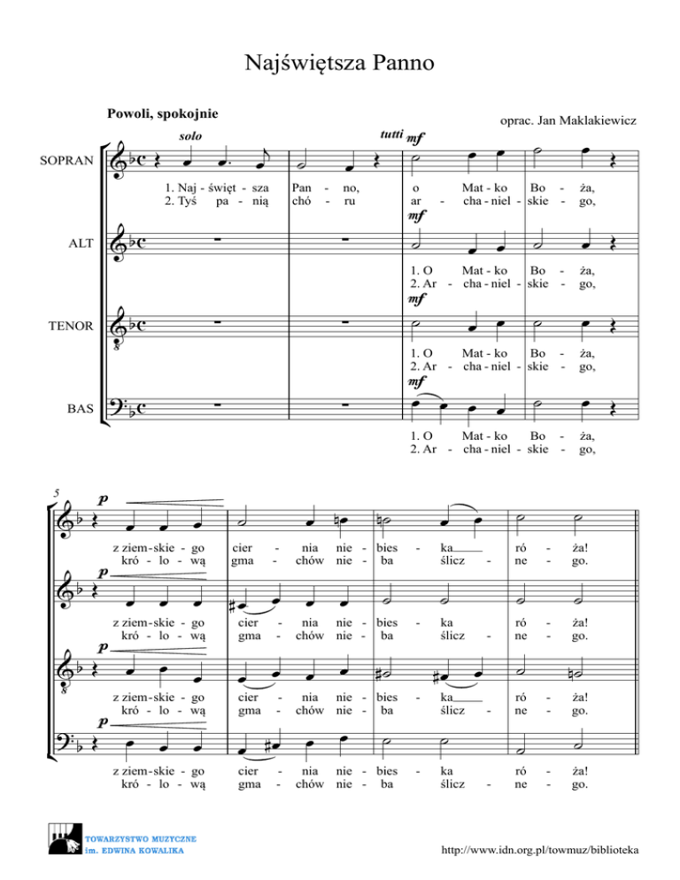 Najświętsza Panno Powoli, spokojnie ° œ SOPRAN & b c Œ solo j œ œ™ ˙ 1. Naj - święt - sza 2. Tyś pa - nią & bc ∑ & bc ‹ ∑ ? c ¢ b ∑ ALT TENOR BAS p ° &b Œ œ 5 &b Œ &b Œ ‹ ? Œ ¢ b p p p œ œ z ziem - skie - go kró - lo - wą œ œ œ z ziem - skie - go kró - lo - wą œ œ œ z ziem - skie - go kró - lo - wą œ œ œ z ziem - skie - go kró - lo - wą Pan chó - tutti mf no, ru o ar mf cier gma - #œ œ cier gma œ cier gma - œ - œ #œ cier gma - œ œ ˙ œ ˙ 1. O Mat - ko Bo 2. Ar - cha - niel - skie mf ża, go, 1. O Mat - ko Bo 2. Ar - cha - niel - skie - ża, go, œ - - #˙ nia nie - bies chów nie - ba œ œ œ - ˙ nia nie - bies chów nie - ba œ Œ ża, go, n˙ nia nie - bies chów nie - ba œ ˙ œ œ œ œ nia nie - bies chów nie - ba œ œ œ ka ślicz ka ślicz ka ślicz ró ne ˙ ka ślicz ˙ - - ˙ #œ ˙ ˙ œ - ró ne - ró ne ˙ - ró ne œ Œ œ Œ ˙ - - ˙ œ Œ ża, go, 1. O Mat - ko Bo 2. Ar - cha - niel - skie mf ˙ ∑ œ nœ - œ Mat - ko Bo cha - niel - skie - ˙ ∑ ˙ œ œ ˙ œ Œ ∑ ˙ oprac. Jan Maklakiewicz ża! go. ˙ ża! go. n˙ - ża! go. ˙ - ża! go. http://www.idn.org.pl/towmuz/biblioteka ° œ™ ™ b & ™ 2 9 f Li Wy f & b ™™ œ™ Li Wy f & b ™™ œ™ ‹ Li Wy f ? ™™ œ ™ ¢ b Li Wy œ œ™ J - - - - ° &b ˙ 12 ze te &b ˙ &b ‹ ze te ˙ ze te ? #˙ ¢ b ze te - tość miej baw mnie na grzesz - j œ œ™ j œ tość miej baw mnie œ œ™ J tość miej baw mnie œ œ™ J tość miej baw mnie - - œ J na grzesz - słod słod mną, go, ˙ mną, go, ˙ mną, go, œœ ™™ słod słod - œ™ słod słod - słod słod de ne mną, go racz od - ˙ - - racz od ˙ œ racz od - mną, go œ œ ˙ - - œ mną, go de ne de ne - œ™ œ ˙ na grzesz - mną, go, ˙ de ne œ J œ™ ˙ ˙ na grzesz - ˙ ˙ - œ J Żarliwie œ mną, go racz od œ œ J j œ œ J j œ œ j j œ œ œ œ J œ œ J J œ J nœ j j œ œ ka ka ka ka ka ka ka ka Pan - no Pan - no Pan - no Pan - no Pan - no Pan - no Pan - no Pan - no Ma Ma Ma Ma Ma Ma Ma Ma - - - ˙ ry ry ˙ ry ry œ œ œ™ J J œ J j œ œ™ œ J j œ œ œ J œ™ J œ J j j œ œ œ™ j œ być w przy - go - dzie czar - ta prze - klę - być w przy - go - dzie czar - ta prze - klę - być w przy - go - dzie czar - ta prze - klę - być w przy - go - dzie czar - ta prze - klę - - - ™™ ˙ ™™ jo. jo. jo. jo. œ œ ry ry - jo. jo. - jo. jo. ˙ - ˙ ry ry ˙ ˙ ™™ ™™ http://www.idn.org.pl/towmuz/biblioteka