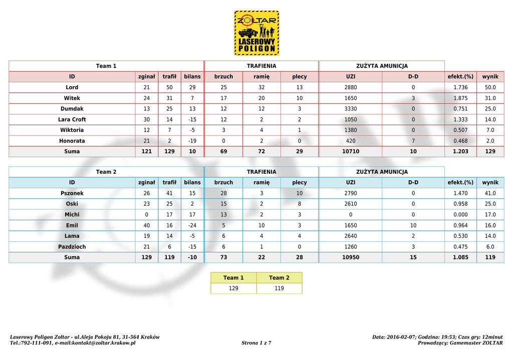 Team 1 TRAFIENIA ZUŻYTA AMUNICJA ID zginał trafił bilans brzuch ramię plecy UZI D-D efekt.(%) wynik Lord 21 50 29 25 32 13 2880 0 1.736 50.0 Witek 24 31 7 17 20 10 1650 3 1.875 31.0 Dumdak 13 25 13 12 12 3 3330 0 0.751 25.0 Lara Croft 30 14 -15 12 2 2 1050 0 1.333 14.0 Wiktoria 12 7 -5 3 4 1 1380 0 0.507 7.0 Honorata 21 2 -19 0 2 0 420 7 0.468 2.0 Suma 121 129 10 69 72 29 10710 10 1.203 129 Team 2 TRAFIENIA ZUŻYTA AMUNICJA ID zginał trafił bilans brzuch ramię plecy UZI D-D efekt.(%) wynik Pszonek 26 41 15 28 3 10 2790 0 1.470 41.0 Oski 23 25 2 15 2 8 2610 0 0.958 25.0 Michi 0 17 17 13 2 3 0 0 0.000 17.0 Emil 40 16 -24 5 10 3 1650 10 0.964 16.0 Lama 19 14 -5 6 4 4 2640 2 0.530 14.0 Pazdzioch 21 6 -15 6 1 0 1260 3 0.475 6.0 Suma 129 119 -10 73 22 28 10950 15 1.085 119 Laserowy Poligon Zoltar - ul.Aleja Pokoju 81, 31-564 Kraków Tel.:792-111-091, e-mail:[email protected] Team 1 Team 2 129 119 Strona 1 z 7 Data: 2016-02-07; Godzina: 19:53; Czas gry: 12minut Prowadzący: Gamemaster ZOLTAR Team 0 TRAFIENIA ZUŻYTA AMUNICJA ID zginał trafił bilans brzuch ramię plecy UZI D-D efekt.(%) wynik Terminator 45 59 14 43 14 8 4050 28 1.447 59.0 Rambo 20 55 35 39 19 8 2640 63 2.035 55.0 Lara Croft 68 19 -49 12 7 1 1620 0 1.173 19.0 Suma 133 133 0 94 40 17 8310 91 1.583 133 Laserowy Poligon Zoltar - ul.Aleja Pokoju 81, 31-564 Kraków Tel.:792-111-091, e-mail:[email protected] Strona 2 z 7 Data: 2016-02-07; Godzina: 17:31; Czas gry: 25minut Prowadzący: Gamemaster ZOLTAR Team 1 TRAFIENIA ZUŻYTA AMUNICJA ID zginał trafił bilans brzuch ramię plecy UZI D-D efekt.(%) wynik Czarny As 13 35 22 20 27 9 2700 4 1.294 35.0 Siwus 14 32 18 25 15 8 3780 1 0.846 32.0 Kalosz 26 29 3 21 3 8 3690 4 0.785 29.0 Jastrzab 15 25 10 19 2 4 4230 1 0.591 25.0 Pliszkers 15 22 7 14 7 4 4710 0 0.467 22.0 Honorata 30 8 -22 2 6 0 1710 6 0.466 8.0 Suma 113 151 38 101 60 33 20820 16 0.725 151 Team 2 TRAFIENIA ZUŻYTA AMUNICJA ID zginał trafił bilans brzuch ramię plecy UZI D-D efekt.(%) wynik Pszonek 54 47 -7 30 7 10 2610 1 1.800 47.0 Michi 0 18 18 13 3 3 0 0 0.000 18.0 Lama 61 15 15 10 3 3 1380 7 1.081 15.0 Pazdzioch 50 14 -36 11 2 1 2430 0 0.576 14.0 Emil 16 10 10 4 5 1 1560 3 0.640 10.0 Oski 48 9 -38 7 1 1 1740 1 0.517 9.0 Suma 229 113 -38 75 21 19 9720 12 1.161 113 Laserowy Poligon Zoltar - ul.Aleja Pokoju 81, 31-564 Kraków Tel.:792-111-091, e-mail:[email protected] Team 1 Team 2 151 113 Strona 3 z 7 Data: 2016-02-07; Godzina: 19:32; Czas gry: 16minut Prowadzący: Gamemaster ZOLTAR Drużyny Miejsce Laserowy Poligon Zoltar - ul.Aleja Pokoju 81, 31-564 Kraków Tel.:792-111-091, e-mail:[email protected] Rozgrywki Nazwa 1 2 3 Suma Team 1 129 - 151 280 Team 2 119 - 113 232 Strona 4 z 7 Data: 2016-02-07 Prowadzący: Gamemaster ZOLTAR Zestawienie wg wyniku Miejsce TRAFIENIA ZUŻYTA AMUNICJA ID zginał trafił bilans brzuch ramię plecy UZI D-D efekt.(%) wynik Lord 105.00 250.00 145.00 125.00 160.00 65.00 14400.00 0.00 1.736 250.00 Pszonek 166.25 190.63 24.38 126.25 20.63 43.75 11868.75 1.88 1.606 190.63 Witek 120.00 155.00 35.00 85.00 100.00 50.00 8250.00 15.00 1.875 155.00 4 Terminator 108.00 141.60 33.60 103.20 33.60 19.20 9720.00 67.20 1.447 141.60 5 Rambo 48.00 132.00 84.00 93.60 45.60 19.20 6336.00 151.20 2.035 132.00 6 Czarny As 48.75 131.25 82.50 75.00 101.25 33.75 10125.00 15.00 1.294 131.25 7 Dumdak 65.00 125.00 60.00 60.00 60.00 15.00 16650.00 0.00 0.751 125.00 8 Siwus 52.50 120.00 67.50 93.75 56.25 30.00 14175.00 3.75 0.846 120.00 9 Kalosz 97.50 108.75 11.25 78.75 11.25 30.00 13837.50 15.00 0.785 108.75 10 Jastrzab 56.25 93.75 37.50 71.25 7.50 15.00 15862.50 3.75 0.591 93.75 11 Pliszkers 56.25 82.50 26.25 52.50 26.25 15.00 17662.50 0.00 0.467 82.50 12 Oski 147.50 79.38 -68.13 50.63 6.88 21.88 9787.50 1.88 0.811 79.38 13 Michi 0.00 76.25 76.25 56.88 10.63 13.13 0.00 0.00 0.000 76.25 14 Lama 161.88 63.13 -98.75 33.75 15.63 15.63 9187.50 18.13 0.686 63.13 15 Emil 130.00 58.75 -71.25 20.00 34.38 9.38 7050.00 30.63 0.830 58.75 16 Lara Croft 156.60 57.80 -98.80 44.40 13.40 6.20 4569.00 0.00 1.265 57.80 17 Pazdzioch 146.25 41.25 -105.00 35.63 6.25 1.88 7706.25 7.50 0.535 41.25 18 Wiktoria 60.00 35.00 -25.00 15.00 20.00 5.00 6900.00 0.00 0.507 35.00 19 Honorata 108.75 20.00 -88.75 3.75 16.25 0.00 4256.25 28.75 0.467 20.00 Laserowy Poligon Zoltar - ul.Aleja Pokoju 81, 31-564 Kraków Tel.:792-111-091, e-mail:[email protected] Strona 5 z 7 Data: 2016-02-07 Prowadzący: Gamemaster ZOLTAR Zestawienie wg bilansu Miejsce TRAFIENIA ZUŻYTA AMUNICJA ID zginał trafił bilans brzuch ramię plecy UZI D-D efekt.(%) wynik Lord 105.00 250.00 145.00 125.00 160.00 65.00 14400.00 0.00 1.736 250.00 Rambo 48.00 132.00 84.00 93.60 45.60 19.20 6336.00 151.20 2.035 132.00 Czarny As 48.75 131.25 82.50 75.00 101.25 33.75 10125.00 15.00 1.294 131.25 4 Michi 0.00 76.25 76.25 56.88 10.63 13.13 0.00 0.00 0.000 76.25 5 Siwus 52.50 120.00 67.50 93.75 56.25 30.00 14175.00 3.75 0.846 120.00 6 Dumdak 65.00 125.00 60.00 60.00 60.00 15.00 16650.00 0.00 0.751 125.00 7 Jastrzab 56.25 93.75 37.50 71.25 7.50 15.00 15862.50 3.75 0.591 93.75 8 Witek 120.00 155.00 35.00 85.00 100.00 50.00 8250.00 15.00 1.875 155.00 9 Terminator 108.00 141.60 33.60 103.20 33.60 19.20 9720.00 67.20 1.447 141.60 10 Pliszkers 56.25 82.50 26.25 52.50 26.25 15.00 17662.50 0.00 0.467 82.50 11 Pszonek 166.25 190.63 24.38 126.25 20.63 43.75 11868.75 1.88 1.606 190.63 12 Kalosz 97.50 108.75 11.25 78.75 11.25 30.00 13837.50 15.00 0.785 108.75 13 Wiktoria 60.00 35.00 -25.00 15.00 20.00 5.00 6900.00 0.00 0.507 35.00 14 Oski 147.50 79.38 -68.13 50.63 6.88 21.88 9787.50 1.88 0.811 79.38 15 Emil 130.00 58.75 -71.25 20.00 34.38 9.38 7050.00 30.63 0.830 58.75 16 Honorata 108.75 20.00 -88.75 3.75 16.25 0.00 4256.25 28.75 0.467 20.00 17 Lama 161.88 63.13 -98.75 33.75 15.63 15.63 9187.50 18.13 0.686 63.13 18 Lara Croft 156.60 57.80 -98.80 44.40 13.40 6.20 4569.00 0.00 1.265 57.80 19 Pazdzioch 146.25 41.25 -105.00 35.63 6.25 1.88 7706.25 7.50 0.535 41.25 Laserowy Poligon Zoltar - ul.Aleja Pokoju 81,