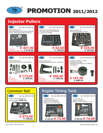 PROMOTION 2011/2012 Injector Pullers Art. No 918 490 00 Puller injectors set Citroen/Peugeot/Fiat/Ford/Lancia/Suzuki 2.0/2.2 HDI (engines DW10 i DW12) Set includes a support plate and columns to use a set 918 490 00 to engine 2.0 HDI 8V € 547,00 € 62,00 Art. No 918 580 00 Art. No 918 590 00 Hydraulic cylinder 20 TON in set! € 674,50 Puller injectors set Renault/Opel/Nissan 2.2/2.5 dCi/DTI € 173,00 Set prepared to cooperate with hydraulic cylinder 918 510 00 € 209,50 Common Rail Art. No 919 610 00 Common Rail diagnostic set with manometer 2500 bar € 675,00 € 745,00 Prices netto - VAT not include. Art. No 918 551 00 Art. No 918 491 00 Puller injectors set Mercedes CDI (with A-class) € 325,00 € 445,80 € 135,80 Puller injectors set Renault/Opel/Nissan/Suzuki 1.9dCi/DTI € 160,00 Set prepared to cooperate with hydraulic cylinder 918 510 00 € 180,90 Art. No 918 510 00 Hydraulic Cylinder (7 TON). Cooperate with sets:: 918 550 00, 918 560 00, 918 580 00 i 918 590 00. € 147,00 € 206,10 Engine Timing Tools Art. No 904 010 60 Timing tools set Land Rover, Rover/MG petrol 1.4/1.6/1.8/2.0 16V & Diesel 1.4/1.5/1.8/1.9/2.0 € 83,80 € 73,00 Art. No 904 010 70 Timing tools set Jaguar, Land Rover Diesel: 2.0 TDi / 2.5Td5 / 2.7 V6 € 89,00 € 74,00 Offer valid while supplies last