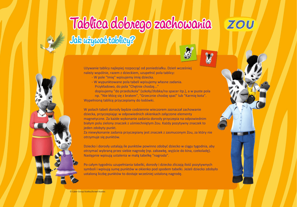 Używanie tablicy najlepiej rozpocząć od poniedziałku. Dzień wcześniej należy wspólnie, razem z dzieckiem, uzupełnić pola tablicy: - W pole "Imię" wpisujemy imię dziecka. - W wypunktowane pola tabeli wpisujemy własne zadania. Przykładowo, do pola "Chętnie chodzę..." dopisujemy "do przedszkola" (szkoły/żłobka/na spacer itp.), a w puste pola np. "Nie kłócę się z bratem", "Grzecznie chodzę spać" lub "Karmię kota". Wypełnioną tablicę przyczepiamy do lodówki. W polach tabeli dorosły będzie codziennie wieczorem zaznaczał zachowanie dziecka, przyczepiając w odpowiednich okienkach załączone elementy magnetyczne. Za każde wykonanie zadania dorosły przyczepia na odpowiednim białym polu zielony znaczek z uśmiechniętym Zou. Każdy pozytywny znaczek to jeden zdobyty punkt. Za niewykonanie zadania przyczepiany jest znaczek z zasmuconym Zou, za który nie otrzymuje się punktów. Dziecko i dorosły ustalają ile punktów powinno zdobyć dziecko w ciągu tygodnia, aby otrzymać wybraną przez siebie nagrodę (np. zabawkę, wyjście do kina, czekoladę). Następnie wpisują ustalenia w małą tabelkę "nagroda". Po całym tygodniu uzupełniania tabelki, dorosły i dziecko zliczają ilość pozytywnych symboli i wpisują sumę punktów w okienko pod spodem tabelki. Jeżeli dziecko zdobyło ustaloną liczbę punktów to dostaje wcześniej ustaloną nagrodę.