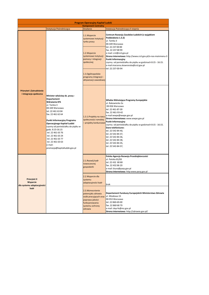 Program Operacyjny Kapitał Ludzki Instytucja Pośrednicząca Komponent Centralny Działanie Instytucja Pośrednicząca II stopnia 1.1.Wsparcie systemowe instytucji rynku pracy 1.2.Wsparcie systemowe instytucji pomocy i integracji społecznej Centrum Rozwoju Zasobów Ludzkich (z wyjątkiem Poddziałania 1.3.2) ul. Tamka 3 00-349 Warszawa tel. 22 237 00 00 fax. 22 237 00 99 e-mail: [email protected] Strona internetowa: http://www.crzl.gov.pl/o-nas-mainmenu-3 Punkt Informacyjny czynny od poniedziałku do piątku w godzinach 8:15 - 16:15. e-mail:[email protected] tel: 22 237-00-94 1.3.Ogólnopolskie programy integracji i aktywizacji zawodowej Priorytet I.Zatrudnienie i integracja społeczna Minister właściwy ds. pracy Departament Wdrażania EFS ul. Tamka 3 00-349 Warszawa tel. 22 461 63 04 fax. 22 461 62 64 Punkt Informacyjny Programu Operacyjnego Kapitał Ludzki czynny od poniedziałku do piątku w godz. 8.15-16.15 tel. 22 461 63 76 tel. 22 461 63 24 tel. 22 461 63 77 tel. 22 461 63 63 e-mail: [email protected] Władza Wdrażająca Programy Europejskie ul. Rakowiecka 2a 00-926 Warszawa tel. 22 461-87-39 fax. 22 461-93-42 e-mail:[email protected] 1.3.1.Projekty na rzecz Strona internetowa: www.wwpe.gov.pl społeczności romskiej Punkt Informacyjny – projekty konkursowe czynny od poniedziałku do piątku w godzinach 8:15 - 16:15. Dane telefoniczne: tel. 22 542-84-40, tel. 22 542-84-37, tel. 22 542-84-36, tel. 22 542-84-38, tel. 22 542-84-35, tel. 22 542-84-57, 2.1.Rozwój kadr nowoczesnej gospodarki Priorytet II Wsparcie dla systemu adaptacyjności kadr 2.2.Wsparcie dla systemu adaptacyjności kadr 2.3.Wzmocnienie potencjału zdrowia osób pracujących oraz poprawa jakości funkcjonowania systemu ochrony zdrowia Polska Agencja Rozwoju Przedsiębiorczości ul. Pańska 81/83 tel. 22 432 80 80 fax. 22 432 86 20 e-mail: [email protected] Strona internetowa: http:www.parp.gov.pl brak Departament Funduszy Europejskich Ministerstwo Zdrowia ul. Miodowa 15 00-953 Warszawa tel. 22 860-69-00 fax. 22 860 68 79 e-mail: [email protected] Strona internetowa: http://zdrowie.gov.pl/ Priorytet III Wysoka jakość systemu oświaty Minister właściwy ds. oświaty i wychowania – Departament Funduszy Strukturalnych Al. Szucha 25, 00-918 Warszawa tel. 22 34-74-881 fax. 22 34-74-883 e-mail: [email protected] Strona internetowa:www.efs.men.gov.p Punkt informacyjny czynny w godz. 8.15 - 16.15 tel. (22) 34 74 343 e-mail: [email protected] 3.3.2 Efektywny system kształcenia i doskonalenia nauczycieli Ośrodek Rozwoju Edukacji al. J. Ch. Szucha 25 3.3.4 Modernizacja 00-918 Warszawa treści i metod tel. (22) 34 74 850 kształcenia fax (22) 34 74 851 e-mail: [email protected] Strona internetowa:www.ore.edu.pl 3.4.3 Punkt informacyjny Upowszechnienie czynny w godz. 8.30 – 16.30 uczenia się przez całe tel. (22) 34 74 390 życie e-mail:[email protected] 3.5 Kompleksowe wspomaganie rozwoju szkół Narodowe Centrum Badań i Rozwoju Priorytet IV ul. Nowogrodzka 47 a Szkolnictwo wyższe i nauka 00-695 Warszawa tel. 22 24 42 858 faks 22 20 13 408 Strona internetowa www.ncbr.gov.pl Priorytet V Dobre rządzenie Koordynacja zapewniona przez Departament Zarządzania EFS w Ministerstwie Rozwoju Regionalnego nie dotyczy 5.1.Wzmocnienie potencjału administracji rządowej Biuro Dyrektora Generalnego, Kancelaria Prezesa Rady Ministrów Al. Ujazdowskie 1/3, 00-583 Warszawa telefon: (22) 694 70 16 faks: (22) 694 66 36 e-mail: [email protected] Strona internetowa: http://efs.kprm.gov.pl 5.2. Wzmocnienie potencjału administracji samorządowej Ministerstwo Administracji i Cyfryzacji Departament Współpracy z Jednostkami Samorządu Terytorialnego ul. Wspólna 2/4 00-505 Warszawa tel. (022) 661 87 65 Strona internetowa:http://ip2.mac.gov.pl/ 5.4.Rozwój potencjału Minister właściwy ds. pracy trzeciego sektora Departament Wdrażania EFS ul. Tamka 3 00-349 Warszawa tel. 22 461 63 04 5.5.Rozwój dialogu fax. 22 461 62 64 społecznego Komponent Regionalny Priorytet VI Rynek pracy otwarty dla wszystkich Priorytet VII Promocja integracji społecznej Priorytet VIII Regionalne kadry gospodarki Urząd Marszałkowski w Łodzi, Departament ds. POKL Al. Piłsudskiego 8, 90-051 Łódź tel. 42 663-30-80 fax. 42 663 30 82 e-mail: [email protected] Punkt Informacyjny czynny od pn.-pt w godz. 8.00 – 16.00 ul. Roosevelta 15 90-051 Łódź tel. 42 663 33 92 e-mail: [email protected] Wojewódzki Urząd Pracy w Łodzi ul. Wólczańska 49 90-608 Łódź tel. 42 632-01-12 fax. 42 636 77 97 e-mail: [email protected] Wszystkie działania w Punkt Informacyjny EFS priorytetach VI i VII czynny: pn. - pt. w godz. 8:00 - 16:00 90-608 Łódź ul. Wólczańska 49, pok. 1.03 i 1.04 tel.: 42 638-91-30, 638-91-39 e-mail: [email protected] nie dotyczy Priorytet IX Rozwój wykształcenia i kompetencji w regionach nie dotyczy