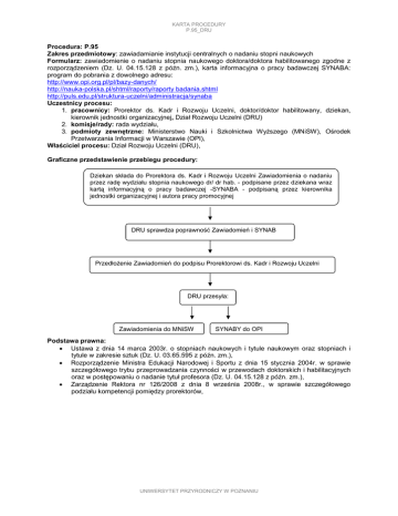 KARTA PROCEDURY P.95_DRU Procedura: P.95 Zakres przedmiotowy: zawiadamianie instytucji centralnych o nadaniu stopni naukowych Formularz: zawiadomienie o nadaniu stopnia naukowego doktora/doktora habilitowanego zgodne z rozporządzeniem (Dz. U. 04.15.128 z późn. zm.), karta informacyjna o pracy badawczej SYNABA: program do pobrania z dowolnego adresu: http://www.opi.org.pl/pl/bazy-danych/ http://nauka-polska.pl/shtml/raporty/raporty badania.shtml http://puls.edu.pl/struktura-uczelni/administracja/synaba Uczestnicy procesu: 1. pracownicy: Prorektor ds. Kadr i Rozwoju Uczelni, doktor/doktor habilitowany, dziekan, kierownik jednostki organizacyjnej, Dział Rozwoju Uczelni (DRU) 2. komisje/rady: rada wydziału, 3. podmioty zewnętrzne: Ministerstwo Nauki i Szkolnictwa WyŜszego (MNiSW), Ośrodek Przetwarzania Informacji w Warszawie (OPI), Właściciel procesu: Dział Rozwoju Uczelni (DRU), Graficzne przedstawienie przebiegu procedury: Dziekan składa do Prorektora ds. Kadr i Rozwoju Uczelni Zawiadomienia o nadaniu przez radę wydziału stopnia naukowego dr/ dr hab. - podpisane przez dziekana wraz kartą informacyjną o pracy badawczej -SYNABA - podpisaną przez kierownika jednostki organizacyjnej i autora pracy promocyjnej DRU sprawdza poprawność Zawiadomień i SYNAB PrzedłoŜenie Zawiadomień do podpisu Prorektorowi ds. Kadr i Rozwoju Uczelni DRU przesyła: Zawiadomienia do MNiSW SYNABY do OPI Podstawa prawna: • Ustawa z dnia 14 marca 2003r. o stopniach naukowych i tytule naukowym oraz stopniach i tytule w zakresie sztuk (Dz. U. 03.65.595 z późn. zm.), • Rozporządzenie Ministra Edukacji Narodowej i Sportu z dnia 15 stycznia 2004r. w sprawie szczegółowego trybu przeprowadzania czynności w przewodach doktorskich i habilitacyjnych oraz w postępowaniu o nadanie tytuł profesora (Dz. U. 04.15.128 z późn. zm.), • Zarządzenie Rektora nr 126/2008 z dnia 8 września 2008r., w sprawie szczegółowego podziału kompetencji pomiędzy prorektorów, UNIWERSYTET PRZYRODNICZY W POZNANIU