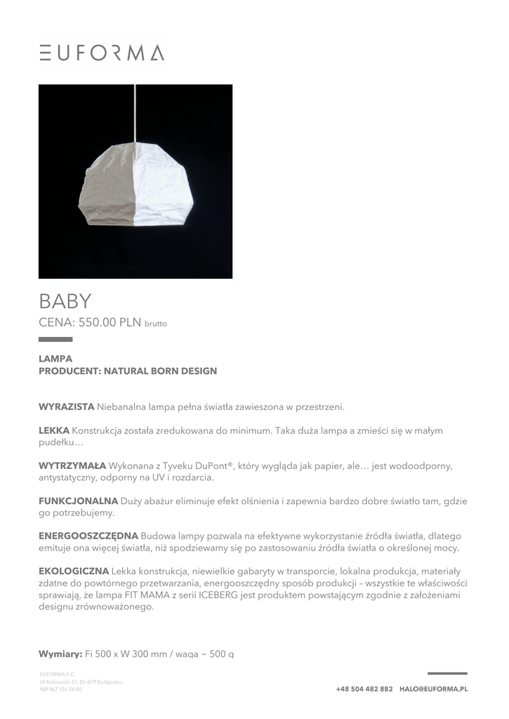 BABY CENA: 550.00 PLN brutto LAMPA PRODUCENT: NATURAL BORN DESIGN WYRAZISTA Niebanalna lampa pełna światła zawieszona w przestrzeni. LEKKA Konstrukcja została zredukowana do minimum. Taka duża lampa a zmieści się w małym pudełku… WYTRZYMAŁA Wykonana z Tyveku DuPont®, który wygląda jak papier, ale… jest wodoodporny, antystatyczny, odporny na UV i rozdarcia. FUNKCJONALNA Duży abażur eliminuje efekt olśnienia i zapewnia bardzo dobre światło tam, gdzie go potrzebujemy. ENERGOOSZCZĘDNA Budowa lampy pozwala na efektywne wykorzystanie źródła światła, dlatego emituje ona więcej światła, niż spodziewamy się po zastosowaniu źródła światła o określonej mocy. EKOLOGICZNA Lekka konstrukcja, niewielkie gabaryty w transporcie, lokalna produkcja, materiały zdatne do powtórnego przetwarzania, energooszczędny sposób produkcji – wszystkie te właściwości sprawiają, że lampa FIT MAMA z serii ICEBERG jest produktem powstającym zgodnie z założeniami designu zrównoważonego. Wymiary: Fi 500 x W 300 mm / waga ~ 500 g Materiał: Tyvek, stal lakierowana, oprawa E-27, długość przewodu: 200 cm Projekt: Delfina Petkow Czas oczekiwania: około 3 tygodni Powered by TCPDF (www.tcpdf.org)