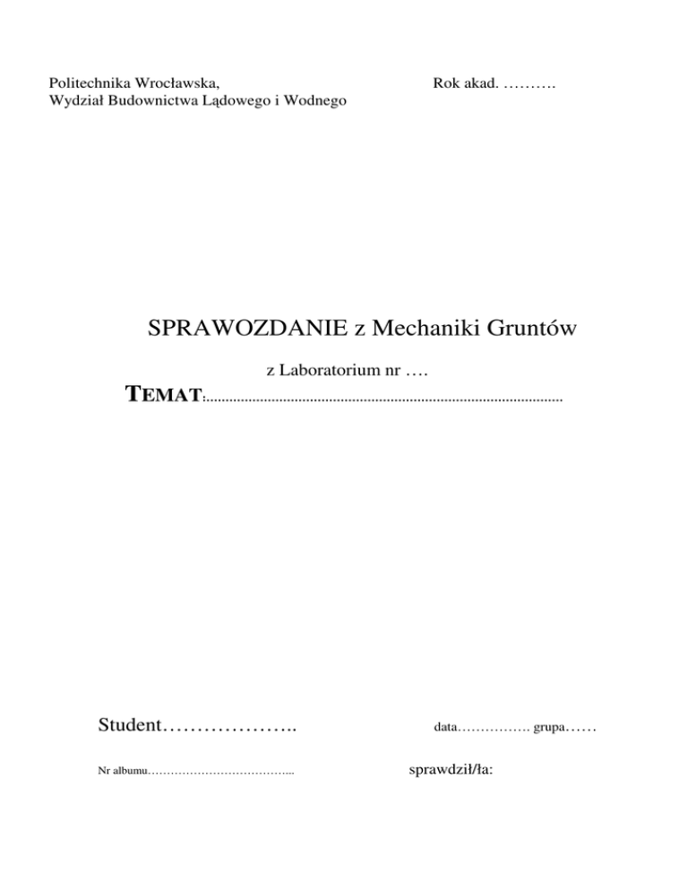 Politechnika Wrocławska, Wydział Budownictwa Lądowego i Wodnego Rok akad. ………. SPRAWOZDANIE z Mechaniki Gruntów z Laboratorium nr …. TEMAT:………………………………………………………………………………… Student……………….. Nr albumu………………………………... data……………. grupa…… sprawdził/ła:
