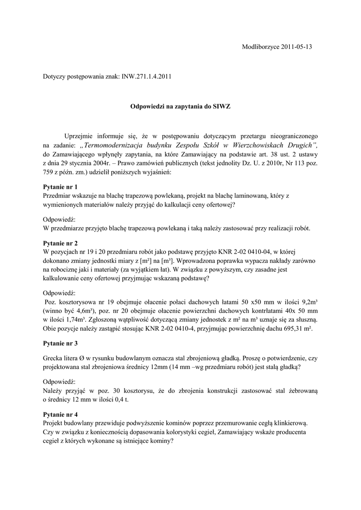 Modliborzyce 2011-05-13 Dotyczy postępowania znak: INW.271.1.4.2011 Odpowiedzi na zapytania do SIWZ Uprzejmie informuje się, że w postępowaniu dotyczącym przetargu nieograniczonego na zadanie: „Termomodernizacja budynku Zespołu Szkół w Wierzchowiskach Drugich”, do Zamawiającego wpłynęły zapytania, na które Zamawiający na podstawie art. 38 ust. 2 ustawy z dnia 29 stycznia 2004r. – Prawo zamówień publicznych (tekst jednolity Dz. U. z 2010r, Nr 113 poz. 759 z późn. zm.) udzielił poniższych wyjaśnień: Pytanie nr 1 Przedmiar wskazuje na blachę trapezową powlekaną, projekt na blachę laminowaną, który z wymienionych materiałów należy przyjąć do kalkulacji ceny ofertowej? Odpowiedź: W przedmiarze przyjęto blachę trapezową powlekaną i taką należy zastosować przy realizacji robót. Pytanie nr 2 W pozycjach nr 19 i 20 przedmiaru robót jako podstawę przyjęto KNR 2-02 0410-04, w której dokonano zmiany jednostki miary z [m²] na [m³]. Wprowadzona poprawka wypacza nakłady zarówno na robociznę jaki i materiały (za wyjątkiem łat). W związku z powyższym, czy zasadne jest kalkulowanie ceny ofertowej przyjmując wskazaną podstawę? Odpowiedź: Poz. kosztorysowa nr 19 obejmuje ołacenie połaci dachowych łatami 50 x50 mm w ilości 9,2m³ (winno być 4,6m³), poz. nr 20 obejmuje ołacenie powierzchni dachowych kontrłatami 40x 50 mm w ilości 1,74m³. Zgłoszoną wątpliwość dotyczącą zmiany jednostek z m² na m³ uznaje się za słuszną. Obie pozycje należy zastąpić stosując KNR 2-02 0410-4, przyjmując powierzchnię dachu 695,31 m². Pytanie nr 3 Grecka litera Ø w rysunku budowlanym oznacza stal zbrojeniową gładką. Proszę o potwierdzenie, czy projektowana stal zbrojeniowa średnicy 12mm (14 mm –wg przedmiaru robót) jest stalą gładką? Odpowiedź: Należy przyjąć w poz. 30 kosztorysu, że do zbrojenia konstrukcji zastosować stal żebrowaną o średnicy 12 mm w ilości 0,4 t. Pytanie nr 4 Projekt budowlany przewiduje podwyższenie kominów poprzez przemurowanie cegłą klinkierową. Czy w związku z koniecznością dopasowania kolorystyki cegieł, Zamawiający wskaże producenta cegieł z których wykonane są istniejące kominy? Odpowiedź: Podwyższenia kominów dokonać cegłą klinkierową o kolorystyce zbliżonej do koloru pokrycia dachu, szczegóły zostaną uzgodnione na budowie. Pytanie nr 5 Pozycje nr 51, 53 i 59 wskazują na tynk mozaikowy MOZATYNK, który produkowany jest jedynie przez firmę Kreisel. W związku z powyższym, czy Zamawiający dopuszcza zmianę przedmiotowego materiału na równoważny lecz innego producenta? Odpowiedź: Poz. przedmiaru i kosztorysu ofertowego nr 51, 53, 59 obejmuje docieplenie ścian – faktura MOZATYNK. Zamawiający dopuszcza zmianę materiału na równorzędny innego producenta. Pytanie nr 6 Podstawa pozycji nr 69 przedmiaru robót dotyczy wykonania boazerii z elementów drewnianych, do kalkulacji cen robót wykonywanych z elementów typu SIDING właściwszym jest wykorzystanie jako podstawy np. KNNR 2 1903-02. W związku z powyższym czy zasadne jest kalkulowanie zgodnie ze wskazaną w przedmiarze podstawą? Odpowiedź: Pozycja kosztorysowa nr 69 zawiera wykonanie boazerii z listew Sidingu F = 174,94m², za podstawę wyceny przyjęto KNR-W – 202 1036 – 02 ANALOGIA i w oparciu o nią należy złożyć ofertę na wykonanie tego elementu robót. Wójt Gminy Modliborzyce mgr inż. Witold Kowalik
