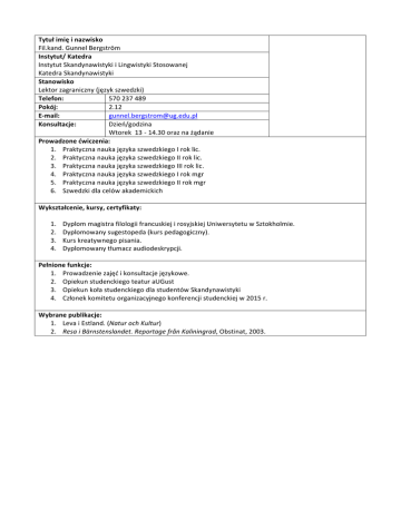 Tytuł imię i nazwisko Fil.kand. Gunnel Bergström Instytut/ Katedra Instytut Skandynawistyki i Lingwistyki Stosowanej Katedra Skandynawistyki Stanowisko Lektor zagraniczny (język szwedzki) Telefon: 570 237 489 Pokój: 2.12 E-‐mail: [email protected] Konsultacje: Dzień/godzina Wtorek 13 -‐ 14.30 oraz na żądanie Prowadzone ćwiczenia: 1. Praktyczna nauka języka szwedzkiego I rok lic. 2. Praktyczna nauka języka szwedzkiego II rok lic. 3. Praktyczna nauka języka szwedzkiego III rok lic. 4. Praktyczna nauka języka szwedzkiego I rok mgr 5. Praktyczna nauka języka szwedzkiego II rok mgr 6. Szwedzki dla celów akademickich Wykształcenie, kursy, certyfikaty: 1. 2. 3. 4. Dyplom magistra filologii francuskiej i rosyjskiej Uniwersytetu w Sztokholmie. Dyplomowany sugestopeda (kurs pedagogiczny). Kurs kreatywnego pisania. Dyplomowany tłumacz audiodeskrypcji. Pełnione funkcje: 1. Prowadzenie zajęć i konsultacje językowe. 2. Opiekun studenckiego teatur aUGust 3. Opiekun koła studenckiego dla studentów Skandynawistyki 4. Członek komitetu organizacyjnego konferencji studenckiej w 2015 r. Wybrane publikacje: 1. Leva i Estland. (Natur och Kultur) 2. Resa i Bärnstenslandet. Reportage från Kaliningrad, Obstinat, 2003.
