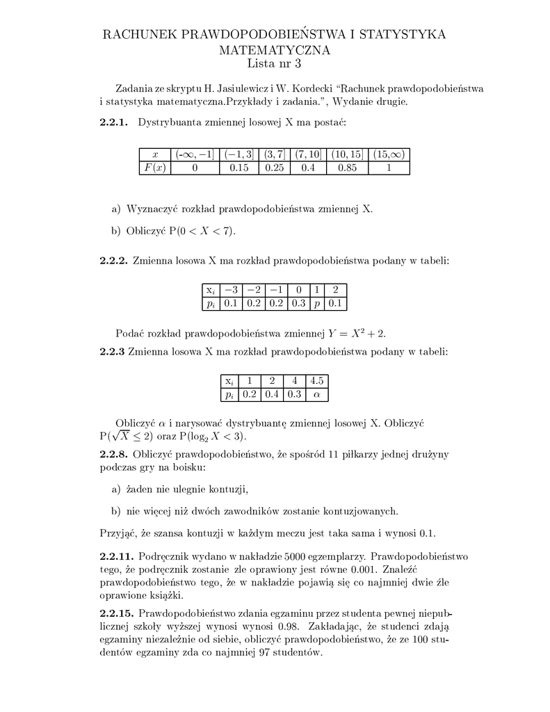 RACHUNEK PRAWDOPODOBIEN STWA I STATYSTYKA MATEMATYCZNA Lista nr 3 Zadania ze skryptu H. Jasiulewicz i W. Kordecki \Rachunek prawdopodobienstwa i statystyka matematyczna.Przyklady i zadania.", Wydanie drugie. 2.2.1. Dystrybuanta zmiennej losowej X ma postac: x (-1; ,1] (,1; 3] (3; 7] (7; 10] (10; 15] (15;1) F (x) 0 0:15 0:25 0:4 0:85 1 a) Wyznaczyc rozklad prawdopodobienstwa zmiennej X. b) Obliczyc P(0 < X < 7). 2.2.2. Zmienna losowa X ma rozklad prawdopodobienstwa podany w tabeli: x ,3 ,2 ,1 0 1 2 p 0:1 0:2 0:2 0:3 p 0:1 i i Podac rozklad prawdopodobienstwa zmiennej Y = X 2 + 2. 2.2.3 Zmienna losowa X ma rozklad prawdopodobie nstwa podany w tabeli: x 1 2 4 4:5 p 0:2 0:4 0:3 i i pObliczyc i narysowac dystrybuante zmiennej losowej X. Obliczyc P( X 2) oraz P(log2 X < 3). Obliczyc prawdopodobienstwo, z_ e sposrod 11 pilkarzy jednej dru_zyny podczas gry na boisku: a) z_ aden nie ulegnie kontuzji, b) nie wiecej ni_z dwoch zawodnikow zostanie kontuzjowanych. Przyjac, z_ e szansa kontuzji w ka_zdym meczu jest taka sama i wynosi 0.1. 2.2.8. Podrecznik wydano w nakladzie 5000 egzemplarzy. Prawdopodobienstwo tego, z_ e podrecznik zostanie zle oprawiony jest rowne 0.001. Znalezc prawdopodobienstwo tego, z_ e w nakladzie pojawia sie co najmniej dwie zle oprawione ksiaz_ ki. 2.2.15. Prawdopodobie nstwo zdania egzaminu przez studenta pewnej niepublicznej szkoly wy_zszej wynosi wynosi 0.98. Zakladajac, z_ e studenci zdaja egzaminy niezale_znie od siebie, obliczyc prawdopodobienstwo, z_ e ze 100 studentow egzaminy zda co najmniej 97 studentow. 2.2.11. Gra polega na zarzucaniu kraz_ kow na kolek. Gracz otrzymuje szesc kraz_ kow i rzuca je a_z do pierwszego celnego rzutu. Znalezc prawdopodobienstwo, z_ e po zarzuceniu kraz_ ka na kolek zostanie graczowi co najmniej jeden kraz_ ek, je_zeli prawdopodobienstwo traenia na kolek przy ka_zdym rzucie jest rowne 0.1. 2.2.23. Z partii 100 przedmiot ow, wsrod ktorych jest 10 wykonanych wadliwie, wybrano losowo bez zwracania 5 sztuk. Niech X oznacza liczbe sztuk wadliwych w probie. Znalezc rozklad i dystrybuante zmiennej X. Zadania spoza skryptu: 2.2.18. Wsrod klebkow pewnej partii bawelny znajduje sie 30% kolorowych. Obliczyc prawdopodobienstwo, z_ e wsrod 10 losowo wybranych klebkow znajduja sie a) 3 kolorowe b) co najwy_zej 3 kolorowe. 2. Przeci etna liczba wypadkow samochodowych w pewnej dzielnicy wynosi 10 na miesiac. a) Znalezc prawdopodobienstwo tego, z_ e w nastepnym miesiacu wydarzy sie 12 wypadkow. b) Jakie jest prawdopodobienstwo tego, z_ e w nastepnym roku bedzie co najmniej jeden miesiac, w ktorym wydarzy sie dokladnie 12 wypadkow. 1. Malgorzata Bogdan