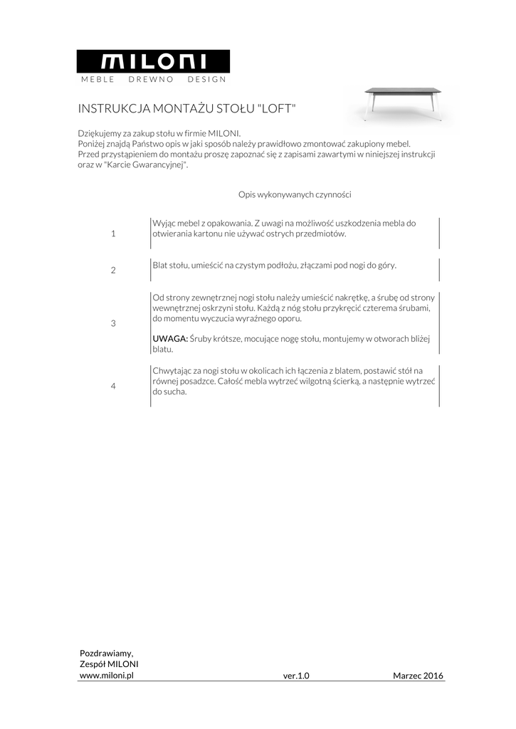 INSTRUKCJA MONTAŻU STOŁU "LOFT" Dziękujemy za zakup stołu w firmie MILONI. Poniżej znajdą Państwo opis w jaki sposób należy prawidłowo zmontować zakupiony mebel. Przed przystąpieniem do montażu proszę zapoznać się z zapisami zawartymi w niniejszej instrukcji oraz w "Karcie Gwarancyjnej". Opis wykonywanych czynności 1 2 3 Wyjąc mebel z opakowania. Z uwagi na możliwość uszkodzenia mebla do otwierania kartonu nie używać ostrych przedmiotów. Blat stołu, umieścić na czystym podłożu, złączami pod nogi do góry. Od strony zewnętrznej nogi stołu należy umieścić nakrętkę, a śrubę od strony wewnętrznej oskrzyni stołu. Każdą z nóg stołu przykręcić czterema śrubami, do momentu wyczucia wyraźnego oporu. UWAGA: Śruby krótsze, mocujące nogę stołu, montujemy w otworach bliżej blatu. 4 Pozdrawiamy, Zespół MILONI www.miloni.pl Chwytając za nogi stołu w okolicach ich łączenia z blatem, postawić stół na równej posadzce. Całość mebla wytrzeć wilgotną ścierką, a następnie wytrzeć do sucha. ver.1.0 Marzec 2016