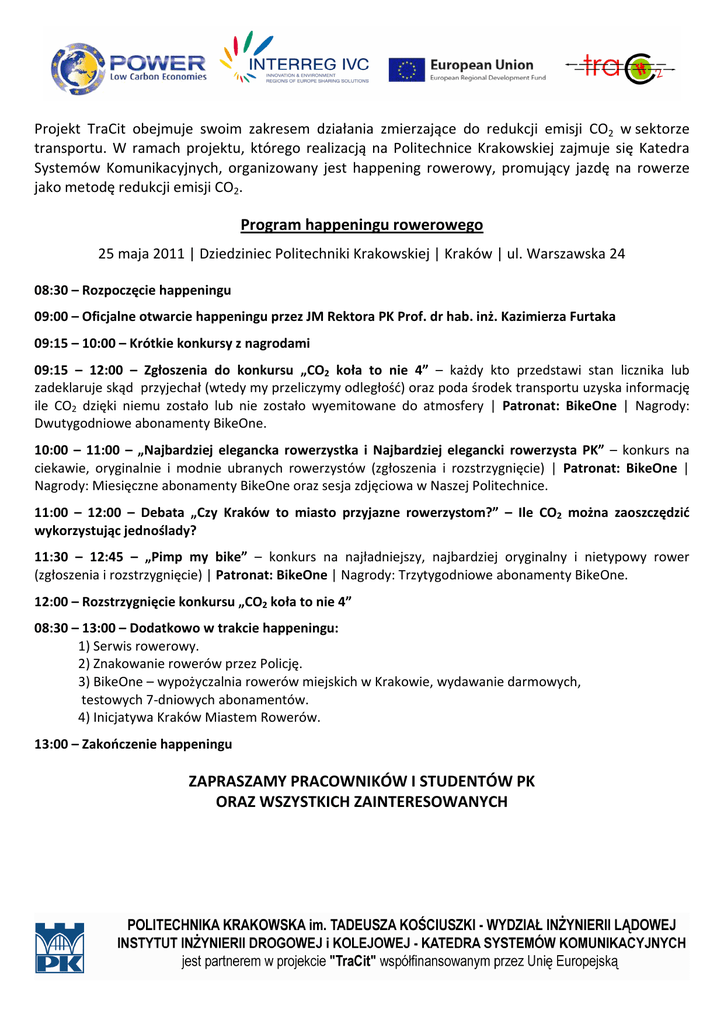 Projekt TraCit obejmuje swoim zakresem działania zmierzające do redukcji emisji CO2 w sektorze transportu. W ramach projektu, którego realizacją na Politechnice Krakowskiej zajmuje się Katedra Systemów Komunikacyjnych, organizowany jest happening rowerowy, promujący jazdę na rowerze jako metodę redukcji emisji CO2. Program happeningu rowerowego 25 maja 2011 | Dziedziniec Politechniki Krakowskiej | Kraków | ul. Warszawska 24 08:30 – Rozpoczęcie happeningu 09:00 – Oficjalne otwarcie happeningu przez JM Rektora PK Prof. dr hab. inż. Kazimierza Furtaka 09:15 – 10:00 – Krótkie konkursy z nagrodami 09:15 – 12:00 – Zgłoszenia do konkursu „CO2 koła to nie 4” – każdy kto przedstawi stan licznika lub zadeklaruje skąd przyjechał (wtedy my przeliczymy odległość) oraz poda środek transportu uzyska informację ile CO2 dzięki niemu zostało lub nie zostało wyemitowane do atmosfery | Patronat: BikeOne | Nagrody: Dwutygodniowe abonamenty BikeOne. 10:00 – 11:00 – „Najbardziej elegancka rowerzystka i Najbardziej elegancki rowerzysta PK” – konkurs na ciekawie, oryginalnie i modnie ubranych rowerzystów (zgłoszenia i rozstrzygnięcie) | Patronat: BikeOne | Nagrody: Miesięczne abonamenty BikeOne oraz sesja zdjęciowa w Naszej Politechnice. 11:00 – 12:00 – Debata „Czy Kraków to miasto przyjazne rowerzystom?” – Ile CO2 można zaoszczędzić wykorzystując jednoślady? 11:30 – 12:45 – „Pimp my bike” – konkurs na najładniejszy, najbardziej oryginalny i nietypowy rower (zgłoszenia i rozstrzygnięcie) | Patronat: BikeOne | Nagrody: Trzytygodniowe abonamenty BikeOne. 12:00 – Rozstrzygnięcie konkursu „CO2 koła to nie 4” 08:30 – 13:00 – Dodatkowo w trakcie happeningu: 1) Serwis rowerowy. 2) Znakowanie rowerów przez Policję. 3) BikeOne – wypożyczalnia rowerów miejskich w Krakowie, wydawanie darmowych, testowych 7-dniowych abonamentów. 4) Inicjatywa Kraków Miastem Rowerów. 13:00 – Zakończenie happeningu ZAPRASZAMY PRACOWNIKÓW I STUDENTÓW PK ORAZ WSZYSTKICH ZAINTERESOWANYCH