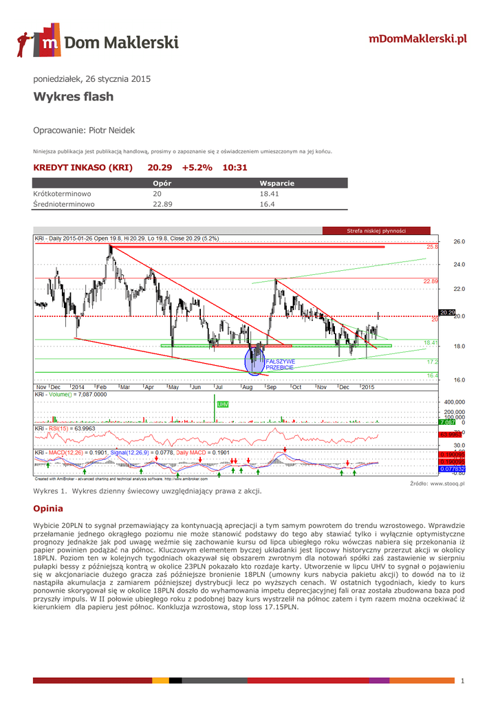 poniedziałek, 26 stycznia 2015 Wykres flash Opracowanie: Piotr Neidek Niniejsza publikacja jest publikacją handlową, prosimy o zapoznanie się z oświadczeniem umieszczonym na jej końcu. KREDYT INKASO (KRI) 20.29 +5.2% 10:31 Opór Wsparcie Krótkoterminowo 20 18.41 Średnioterminowo 22.89 16.4 Strefa niskiej płynności Źródło: www.stooq.pl Wykres 1. Wykres dzienny świecowy uwzględniający prawa z akcji. Opinia Wybicie 20PLN to sygnał przemawiający za kontynuacją aprecjacji a tym samym powrotem do trendu wzrostowego. Wprawdzie przełamanie jednego okrągłego poziomu nie może stanowić podstawy do tego aby stawiać tylko i wyłącznie optymistyczne prognozy jednakże jak pod uwagę weźmie się zachowanie kursu od lipca ubiegłego roku wówczas nabiera się przekonania iż papier powinien podążać na północ. Kluczowym elementem byczej układanki jest lipcowy historyczny przerzut akcji w okolicy 18PLN. Poziom ten w kolejnych tygodniach okazywał się obszarem zwrotnym dla notowań spółki zaś zastawienie w sierpniu pułapki bessy z późniejszą kontrą w okolice 23PLN pokazało kto rozdaje karty. Utworzenie w lipcu UHV to sygnał o pojawieniu się w akcjonariacie dużego gracza zaś późniejsze bronienie 18PLN (umowny kurs nabycia pakietu akcji) to dowód na to iż nastąpiła akumulacja z zamiarem późniejszej dystrybucji lecz po wyższych cenach. W ostatnich tygodniach, kiedy to kurs ponownie skorygował się w okolice 18PLN doszło do wyhamowania impetu deprecjacyjnej fali oraz została zbudowana baza pod przyszły impuls. W II połowie ubiegłego roku z podobnej bazy kurs wystrzelił na północ zatem i tym razem można oczekiwać iż kierunkiem dla papieru jest północ. Konkluzja wzrostowa, stop loss 17.15PLN. 1 Biuro Aktywnej Sprzedaży ul. Wspólna 47/49, 00-684 Warszawa Jarosław Banasiak dyrektor tel. +48 22 697 4870 fax. +48 22 697 4726/4923 [email protected] Zespół Prywatnego Maklera Joanna Gębal tel. +48 22 697 4762 [email protected] Marcin Bieguński tel. +48 22 697 4984 [email protected] Przemysław Miedziocha tel. +48 22 697 4768 [email protected] Paweł Rudowski tel. +48 22 697 4852 [email protected] Rafał Włóka tel. +48 22 697 48 09 [email protected] Zespół Wsparcia Sprzedaży Daniel Cegiełka infoserwis tel. +48 22 697 4914 [email protected] Piotr Neidek analiza techniczna tel. +48 22 697 4766 [email protected] Remigiusz Lemke analiza techniczna tel. +48 22 697 4848 [email protected] Niniejsza publikacja przygotowana przez Dom Maklerski mBanku S.A. z siedzibą w Warszawie, przy ul. Wspólnej 47/49, jest publikacją handlową, została przygotowana wyłącznie w celach informacyjnych, nie stanowi rekomendacji w rozumieniu przepisów „Rozporządzenia Ministra Finansów z dnia 19 października 2005 r. w sprawie informacji stanowiących rekomendacje dotyczące instrumentów finansowych lub ich emitentów lub wystawców (Dz. U. nr 206 z 2005 r.), nie stanowi porady inwestycyjnej, nie stanowi oferty zbycia lub nabycia wymienionych w niej instrumentów finansowych, nie stanowi podstawy do zawarcia jakiejkolwiek umowy lub powstania jakiegokolwiek zobowiązania. Informacje zawarte w niniejszej publikacji oparte są na danych uzyskanych ze źródeł, które Dom Maklerski mBanku S.A., działając w dobrej wierze, uważa za wiarygodne. Dom Maklerski mBanku S.A. nie gwarantuje jednak dokładności, kompletności ani trafności tych informacji. Dom Maklerski mBanku S.A., jego organy zarządcze, organy nadzorcze, ani pracownicy nie ponoszą odpowiedzialności za wszelkie skutki finansowe i niefinansowe powstałe w wyniku wykorzystania niniejszej publikacji lub zawartych w niej informacji. Wszelkie opinie, prognozy, kalkulacje i szacunki zawarte w niniejszej publikacji stanowią jedynie wyraz subiektywnej oceny autora na moment jej wydania i mogą być zmieniane bez uprzedzenia. Opinie wyrażone w niniejszej publikacji nie pozostają w jakiejkolwiek zależności od rekomendacji przygotowywanych przez Dom Maklerski mBanku S.A.. Dom Maklerski mBanku S.A. nie jest zobowiązany do aktualizowania ani modyfikowania niniejszej publikacji, ani do informowania jej odbiorców w przypadku, gdy jakakolwiek poruszona w niej kwestia lub zawarta w niej opinia, prognoza, kalkulacja lub szacunek ulegnie zmianie lub stanie się nieaktualne. Dom Maklerski mBanku S.A. udostępnia niniejszą publikację nieodpłatnie. Zabronione jest powielanie i rozpowszechnianie niniejszej publikacji bez pisemnej zgody Domu Maklerskiego mBanku S.A. 2