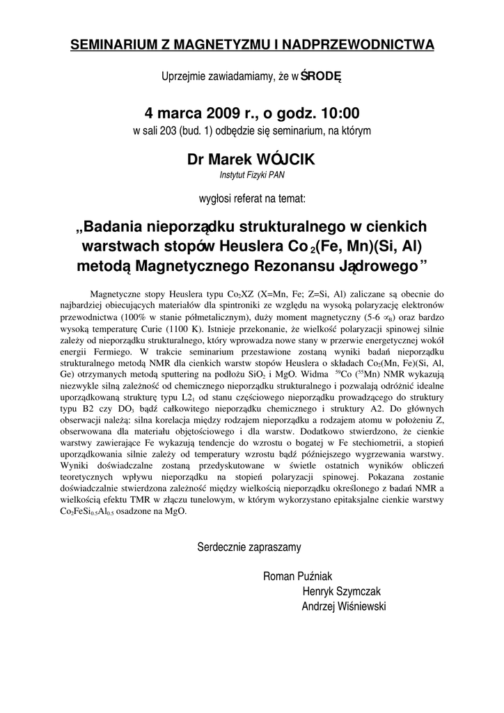 SEMINARIUM Z MAGNETYZMU I NADPRZEWODNICTWA Uprzejmie zawiadamiamy, że w ŚRODĘ 4 marca 2009 r., o godz. 10:00 w sali 203 (bud. 1) odbędzie się seminarium, na którym Dr Marek WÓJCIK Instytut Fizyki PAN wygłosi referat na temat: „Badania nieporządku strukturalnego w cienkich warstwach stopów Heuslera Co 2(Fe, Mn)(Si, Al) metodą Magnetycznego Rezonansu Jądrowego” Magnetyczne stopy Heuslera typu Co2XZ (X=Mn, Fe; Z=Si, Al) zaliczane są obecnie do najbardziej obiecujących materiałów dla spintroniki ze względu na wysoką polaryzację elektronów przewodnictwa (100% w stanie półmetalicznym), duży moment magnetyczny (56 µB) oraz bardzo wysoką temperaturę Curie (1100 K). Istnieje przekonanie, że wielkość polaryzacji spinowej silnie zależy od nieporządku strukturalnego, który wprowadza nowe stany w przerwie energetycznej wokół energii Fermiego. W trakcie seminarium przestawione zostaną wyniki badań nieporządku strukturalnego metodą NMR dla cienkich warstw stopów Heuslera o składach Co2(Mn, Fe)(Si, Al, Ge) otrzymanych metodą sputtering na podłożu SiO2 i MgO. Widma 59Co (55Mn) NMR wykazują niezwykle silną zależność od chemicznego nieporządku strukturalnego i pozwalają odróżnić idealne uporządkowaną strukturę typu L21 od stanu częściowego nieporządku prowadzącego do struktury typu B2 czy DO3 bądź całkowitego nieporządku chemicznego i struktury A2. Do głównych obserwacji należą: silna korelacja między rodzajem nieporządku a rodzajem atomu w położeniu Z, obserwowana dla materiału objętościowego i dla warstw. Dodatkowo stwierdzono, że cienkie warstwy zawierające Fe wykazują tendencje do wzrostu o bogatej w Fe stechiometrii, a stopień uporządkowania silnie zależy od temperatury wzrostu bądź późniejszego wygrzewania warstwy. Wyniki doświadczalne zostaną przedyskutowane w świetle ostatnich wyników obliczeń teoretycznych wpływu nieporządku na stopień polaryzacji spinowej. Pokazana zostanie doświadczalnie stwierdzona zależność między wielkością nieporządku określonego z badań NMR a wielkością efektu TMR w złączu tunelowym, w którym wykorzystano epitaksjalne cienkie warstwy Co2FeSi0.5Al0.5 osadzone na MgO. Serdecznie zapraszamy Roman Puźniak Henryk Szymczak Andrzej Wiśniewski