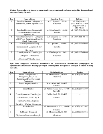 Wykaz firm mających stosowne zezwolenie na prowadzenie odbioru