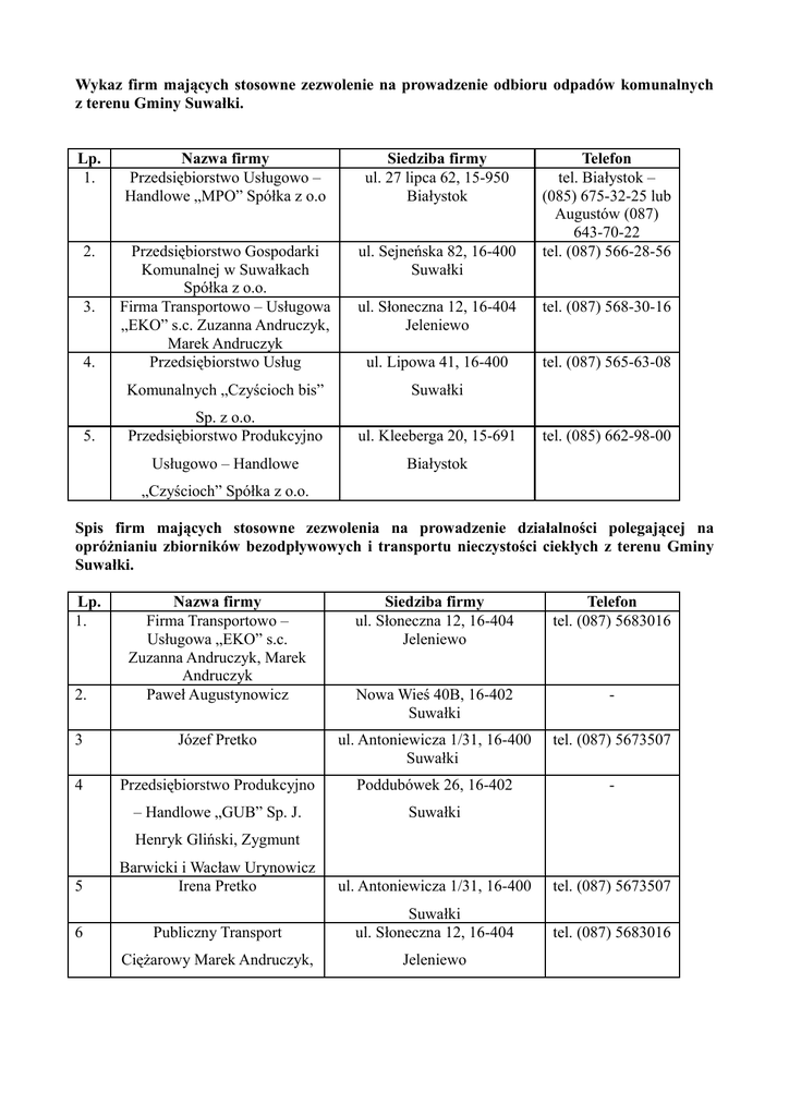 Wykaz firm mających stosowne zezwolenie na prowadzenie odbioru odpadów komunalnych z terenu Gminy Suwałki. Lp. 1. Nazwa firmy Przedsiębiorstwo Usługowo – Handlowe „MPO” Spółka z o.o Siedziba firmy ul. 27 lipca 62, 15-950 Białystok 2. Przedsiębiorstwo Gospodarki Komunalnej w Suwałkach Spółka z o.o. Firma Transportowo – Usługowa „EKO” s.c. Zuzanna Andruczyk, Marek Andruczyk Przedsiębiorstwo Usług ul. Sejneńska 82, 16-400 Suwałki 3. 4. 5. Telefon tel. Białystok – (085) 675-32-25 lub Augustów (087) 643-70-22 tel. (087) 566-28-56 ul. Słoneczna 12, 16-404 Jeleniewo tel. (087) 568-30-16 ul. Lipowa 41, 16-400 tel. (087) 565-63-08 Komunalnych „Czyścioch bis” Suwałki Sp. z o.o. Przedsiębiorstwo Produkcyjno ul. Kleeberga 20, 15-691 Usługowo – Handlowe Białystok tel. (085) 662-98-00 „Czyścioch” Spółka z o.o. Spis firm mających stosowne zezwolenia na prowadzenie działalności polegającej na opróżnianiu zbiorników bezodpływowych i transportu nieczystości ciekłych z terenu Gminy Suwałki. Lp. 1. Siedziba firmy ul. Słoneczna 12, 16-404 Jeleniewo Telefon tel. (087) 5683016 2. Nazwa firmy Firma Transportowo – Usługowa „EKO” s.c. Zuzanna Andruczyk, Marek Andruczyk Paweł Augustynowicz Nowa Wieś 40B, 16-402 Suwałki - 3 Józef Pretko ul. Antoniewicza 1/31, 16-400 Suwałki tel. (087) 5673507 4 Przedsiębiorstwo Produkcyjno Poddubówek 26, 16-402 - – Handlowe „GUB” Sp. J. Suwałki Henryk Gliński, Zygmunt 5 Barwicki i Wacław Urynowicz Irena Pretko ul. Antoniewicza 1/31, 16-400 tel. (087) 5673507 6 Publiczny Transport Suwałki ul. Słoneczna 12, 16-404 tel. (087) 5683016 Ciężarowy Marek Andruczyk, Jeleniewo