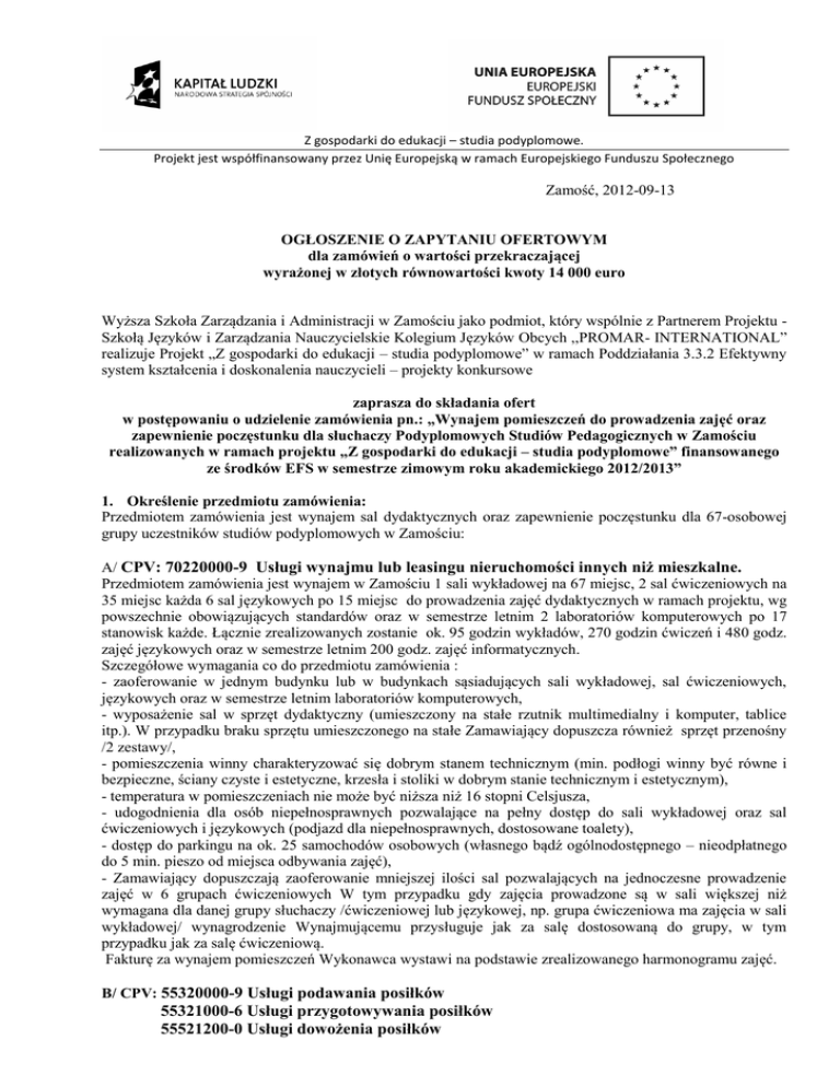 Z gospodarki do edukacji – studia podyplomowe. Projekt jest współfinansowany przez Unię Europejską w ramach Europejskiego Funduszu Społecznego Zamość, 2012-09-13 OGŁOSZENIE O ZAPYTANIU OFERTOWYM dla zamówień o wartości przekraczającej wyrażonej w złotych równowartości kwoty 14 000 euro Wyższa Szkoła Zarządzania i Administracji w Zamościu jako podmiot, który wspólnie z Partnerem Projektu Szkołą Języków i Zarządzania Nauczycielskie Kolegium Języków Obcych ,,PROMAR- INTERNATIONAL” realizuje Projekt „Z gospodarki do edukacji – studia podyplomowe” w ramach Poddziałania 3.3.2 Efektywny system kształcenia i doskonalenia nauczycieli – projekty konkursowe zaprasza do składania ofert w postępowaniu o udzielenie zamówienia pn.: „Wynajem pomieszczeń do prowadzenia zajęć oraz zapewnienie poczęstunku dla słuchaczy Podyplomowych Studiów Pedagogicznych w Zamościu realizowanych w ramach projektu „Z gospodarki do edukacji – studia podyplomowe” finansowanego ze środków EFS w semestrze zimowym roku akademickiego 2012/2013” 1. Określenie przedmiotu zamówienia: Przedmiotem zamówienia jest wynajem sal dydaktycznych oraz zapewnienie poczęstunku dla 67-osobowej grupy uczestników studiów podyplomowych w Zamościu: A/ CPV: 70220000-9 Usługi wynajmu lub leasingu nieruchomości innych niż mieszkalne. Przedmiotem zamówienia jest wynajem w Zamościu 1 sali wykładowej na 67 miejsc, 2 sal ćwiczeniowych na 35 miejsc każda 6 sal językowych po 15 miejsc do prowadzenia zajęć dydaktycznych w ramach projektu, wg powszechnie obowiązujących standardów oraz w semestrze letnim 2 laboratoriów komputerowych po 17 stanowisk każde. Łącznie zrealizowanych zostanie ok. 95 godzin wykładów, 270 godzin ćwiczeń i 480 godz. zajęć językowych oraz w semestrze letnim 200 godz. zajęć informatycznych. Szczegółowe wymagania co do przedmiotu zamówienia : - zaoferowanie w jednym budynku lub w budynkach sąsiadujących sali wykładowej, sal ćwiczeniowych, językowych oraz w semestrze letnim laboratoriów komputerowych, - wyposażenie sal w sprzęt dydaktyczny (umieszczony na stałe rzutnik multimedialny i komputer, tablice itp.). W przypadku braku sprzętu umieszczonego na stałe Zamawiający dopuszcza również sprzęt przenośny /2 zestawy/, - pomieszczenia winny charakteryzować się dobrym stanem technicznym (min. podłogi winny być równe i bezpieczne, ściany czyste i estetyczne, krzesła i stoliki w dobrym stanie technicznym i estetycznym), - temperatura w pomieszczeniach nie może być niższa niż 16 stopni Celsjusza, - udogodnienia dla osób niepełnosprawnych pozwalające na pełny dostęp do sali wykładowej oraz sal ćwiczeniowych i językowych (podjazd dla niepełnosprawnych, dostosowane toalety), - dostęp do parkingu na ok. 25 samochodów osobowych (własnego bądź ogólnodostępnego – nieodpłatnego do 5 min. pieszo od miejsca odbywania zajęć), - Zamawiający dopuszczają zaoferowanie mniejszej ilości sal pozwalających na jednoczesne prowadzenie zajęć w 6 grupach ćwiczeniowych W tym przypadku gdy zajęcia prowadzone są w sali większej niż wymagana dla danej grupy słuchaczy /ćwiczeniowej lub językowej, np. grupa ćwiczeniowa ma zajęcia w sali wykładowej/ wynagrodzenie Wynajmującemu przysługuje jak za salę dostosowaną do grupy, w tym przypadku jak za salę ćwiczeniową. Fakturę za wynajem pomieszczeń Wykonawca wystawi na podstawie zrealizowanego harmonogramu zajęć. B/ CPV: 55320000-9 Usługi podawania posiłków 55321000-6 Usługi przygotowywania posiłków 55521200-0 Usługi dowożenia posiłków Przedmiotem zamówienia jest usługa związana z zapewnieniem poczęstunku dla maksymalnie 67 -osobowej grupy uczestników studiów podyplomowych w Zamościu. Szczegółowe wymagania co do przedmiotu zamówienia : - poczęstunek dla uczestników zajęć należy zrealizować w terminach i godzinach wyszczególnionych w pkt 3, - poczęstunek obejmuje , kruche ciastka i napoje (kawa, herbata, cukier, śmietanka do kawy) w racjonalnych ilościach wystarczających w ciągu całego dnia zajęć oraz: ciepły posiłek – zupa, napój /kompot/ i danie obiadowe lub garmażeryjne barowe, jedno dziennie dla każdego uczestnika. Oferowana usługa powinna obejmować również zapewnienie obsługi uczestników i koniecznego sprzętu (czajnik do gotowania wody, nakrycia – jednorazowe lub trwałe, rozłożenie i zebranie nakryć). Dystrybucja ciepłego posiłku powinna odbyć się w odpowiednio przystosowanym pomieszczeniu (bar, stołówka), o ile takowe znajdować się będzie w miejscu odbywania zajęć. Fakturę za poczęstunek Wykonawca wystawi na podstawie imiennej listy poświadczonej własnoręcznymi podpisami osób korzystających z poczęstunku, której oryginał Wykonawca załączy do faktury. 2. Sposób uzyskania informacji dotyczących przedmiotu zamówienia : Szczegółowe informacje dotyczące przedmiotu zamówienia można uzyskać osobiście w siedzibie Zamawiającego – Wyższa Szkoła Zarządzania i Administracji w Zamościu ul. Akademicka 4, pok. nr 4, telefonicznie lub drogą korespondencji elektronicznej. Osobą uprawnioną do kontaktów z wykonawcami jest: Władysław Molas, tel. (084) 677 67 76, e-mail: [email protected] 3. Terminy wykonania zamówienia: - w semestrze zimowym roku akademickiego 2012/2013: 13.10.2012 - 14.10.2012 , 27.10.2012 - 28.10.2012, 17.11.2012 - 18.11.2012 , 01.12.2012 - 02.12.2012 , 15.12.2012 - 16.12.2012 , 19.01.2013 - 20.01.2013, 02.02.2013 - 03.02.2013 , 16.02.2013 - 17.02.2013 , - w semestrze letnim roku akademickiego 2012/2013: terminy zostaną uzgodnione z wykonawcą w lutym 2013 roku. Zajęcia będą się odbywały w soboty i niedziele /8 zjazdów/ przeciętnie co 2 tygodnie. Sale do prowadzenia zajęć winny być dostępne w godz. 8.00 – 20.00, napoje i ciastka w godz. 9.00-18.00, ciepły posiłek wydawany przez pół godziny podczas długiej przerwy - zgodnie z harmonogr