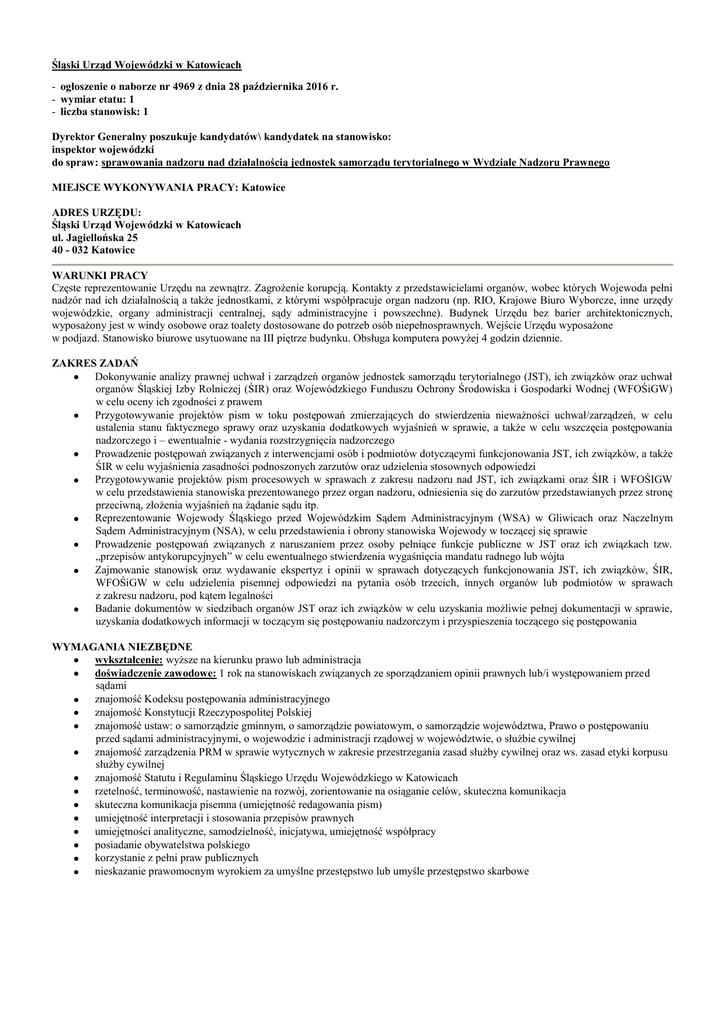 Śląski Urząd Wojewódzki w Katowicach - ogłoszenie o naborze nr 4969 z dnia 28 października 2016 r. - wymiar etatu: 1 - liczba stanowisk: 1 Dyrektor Generalny poszukuje kandydatów\ kandydatek na stanowisko: inspektor wojewódzki do spraw: sprawowania nadzoru nad działalnością jednostek samorządu terytorialnego w Wydziale Nadzoru Prawnego MIEJSCE WYKONYWANIA PRACY: Katowice ADRES URZĘDU: Śląski Urząd Wojewódzki w Katowicach ul. Jagiellońska 25 40 - 032 Katowice WARUNKI PRACY Częste reprezentowanie Urzędu na zewnątrz. Zagrożenie korupcją. Kontakty z przedstawicielami organów, wobec których Wojewoda pełni nadzór nad ich działalnością a także jednostkami, z którymi współpracuje organ nadzoru (np. RIO, Krajowe Biuro Wyborcze, inne urzędy wojewódzkie, organy administracji centralnej, sądy administracyjne i powszechne). Budynek Urzędu bez barier architektonicznych, wyposażony jest w windy osobowe oraz toalety dostosowane do potrzeb osób niepełnosprawnych. Wejście Urzędu wyposażone w podjazd. Stanowisko biurowe usytuowane na III piętrze budynku. Obsługa komputera powyżej 4 godzin dziennie. ZAKRES ZADAŃ Dokonywanie analizy prawnej uchwał i zarządzeń organów jednostek samorządu terytorialnego (JST), ich związków oraz uchwał organów Śląskiej Izby Rolniczej (ŚIR) oraz Wojewódzkiego Funduszu Ochrony Środowiska i Gospodarki Wodnej (WFOŚiGW) w celu oceny ich zgodności z prawem Przygotowywanie projektów pism w toku postępowań zmierzających do stwierdzenia nieważności uchwał/zarządzeń, w celu ustalenia stanu faktycznego sprawy oraz uzyskania dodatkowych wyjaśnień w sprawie, a także w celu wszczęcia postępowania nadzorczego i – ewentualnie - wydania rozstrzygnięcia nadzorczego Prowadzenie postępowań związanych z interwencjami osób i podmiotów dotyczącymi funkcjonowania JST, ich związków, a także ŚIR w celu wyjaśnienia zasadności podnoszonych zarzutów oraz udzielenia stosownych odpowiedzi Przygotowywanie projektów pism procesowych w sprawach z zakresu nadzoru nad JST, ich związkami oraz ŚIR i WFOŚIGW w celu przedstawienia stanowiska prezentowanego przez organ nadzoru, odniesienia się do zarzutów przedstawianych przez stronę przeciwną, złożenia wyjaśnień na żądanie sądu itp. Reprezentowanie Wojewody Śląskiego przed Wojewódzkim Sądem Administracyjnym (WSA) w Gliwicach oraz Naczelnym Sądem Administracyjnym (NSA), w celu przedstawienia i obrony stanowiska Wojewody w toczącej się sprawie Prowadzenie postępowań związanych z naruszaniem przez osoby pełniące funkcje publiczne w JST oraz ich związkach tzw. „przepisów antykorupcyjnych” w celu ewentualnego stwierdzenia wygaśnięcia mandatu radnego lub wójta Zajmowanie stanowisk oraz wydawanie ekspertyz i opinii w sprawach dotyczących funkcjonowania JST, ich związków, ŚIR, WFOŚiGW w celu udzielenia pisemnej odpowiedzi na pytania osób trzecich, innych organów lub podmiotów w sprawach z zakresu nadzoru, pod kątem legalności Badanie dokumentów w siedzibach organów JST oraz ich związków w celu uzyskania możliwie pełnej dokumentacji w sprawie, uzyskania dodatkowych informacji w toczącym się postępowaniu nadzorczym i przyspieszenia toczącego się postępowania WYMAGANIA NIEZBĘDNE wykształcenie: wyższe na kierunku prawo lub administracja doświadczenie zawodowe: 1 rok na stanowiskach związanych ze sporządzaniem opinii prawnych lub/i występowaniem przed sądami znajomość Kodeksu postępowania administracyjnego znajomość Konstytucji Rzeczypospolitej Polskiej znajomość ustaw: o samorządzie gminnym, o samorządzie powiatowym, o samorządzie województwa, Prawo o postępowaniu przed sądami administracyjnymi, o wojewodzie i administracji rządowej w województwie, o służbie cywilnej znajomość zarządzenia PRM w sprawie wytycznych w zakresie przestrzegania zasad służby cywilnej oraz ws. zasad etyki korpusu służby cywilnej znajomość Statutu i Regulaminu Śląskiego Urzędu Wojewódzkiego w Katowicach rzetelność, terminowość, nastawienie na rozwój, zorientowanie na osiąganie celów, skuteczna komunikacja skuteczna komunikacja pisemna (umiejętność redagowania pism) umiejętność interpretacji i stosowania przepisów prawnych umiejętności analityczne, samodzielność, inicjatywa, umiejętność współpracy posiadanie obywatelstwa polskiego korzystanie z pełni praw publicznych nieskazanie prawomocnym wyrokiem za umyślne przestępstwo lub umyśle przestępstwo skarbowe WYMAGANIA DODATKOWE doświadczenie zawodowe: 2 lata w administracji publicznej na stanowiskach urzędniczych znajomość ustaw: o regionalnej izbie obrachunkowej, o ograniczeniu prowadzenia działalności gospodarczej przez osoby pełniące funkcje publiczne znajomość obsługi komputera w szczególności programów prawniczych (Legalis, Lex Omega) umiejętność prezentowania swojego stanowiska przed szerszym audytorium odpowiedzialność, podejmowanie decyzji, umiejętność radzenia sobie w sytuacjach kryzysowych DOKUMENTY I OŚWIADCZENIA NIEZBĘDNE życiorys/CV i list motywacyjny kopie dokumentów potwierdzających spełnienie wymagania niezbędnego w zakresie wykształcenia kopie dokumentów potwierdzających spełnienie wymagania niezbędnego w zakresie doświadczenia zawodowego / stażu pracy oświadczenie o posiadaniu obywatelstwa polskiego albo kopia dokumentu potwierdzającego posiadanie polskiego obywatelstwa oświadczenie o wyrażeniu zgody na przetwarzanie danych osobowych do celów naboru oświadczenie o korzystaniu z pełni praw publicznych oświadczenie o nieskazaniu prawomocnym wyrokiem za umyślne przestępstwo lub umyślne przestępstwo skarbowe DOKUMENTY I OŚWIADCZENIA DODATKOWE kopia dokumentu potwierdzającego niepełnosprawność - w przypadku kandydatek/kandydatów, zamierzających skorzystać z pierwszeństwa w zatrudnieniu w przypadku, gdy znajdą się w gronie najlepszych kandydatek/kandydatów kopie dokumentów